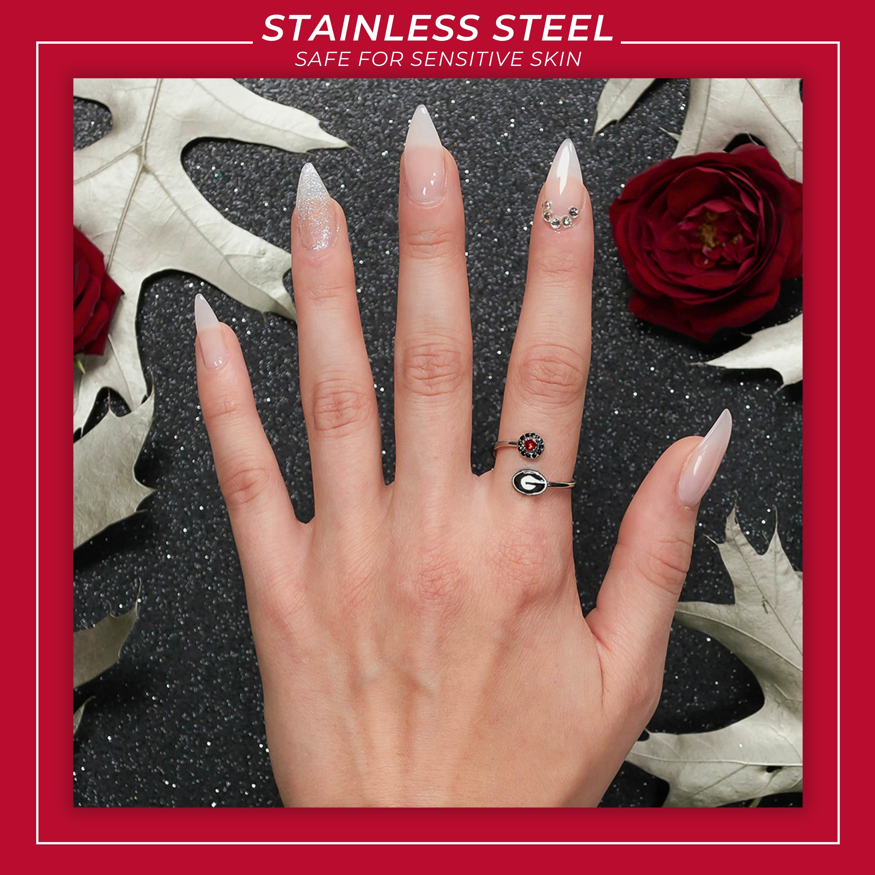 Our Georgia ring is finally here! Gear up for the game with our beautifully designed Georgia Bulldogs ring! Wear it to the next tailgate or around town to show off your University of Georgia pride. This adjustable UGA ring would also make the perfect gift for your favorite Georgia Bulldogs fan! The Georgia G logo is accented by beautiful Swarovski & Czech crystals. All of our UGA jewelry is made of stainless steel. Ring the Bell! Ships within 24-48 business hours Satisfaction Guaranteed Stainless Steel Product Lifetime Guarantee Officially Licensed Ring fits sizes from 5-10" Perfect Gift for any Georgia Graduate, Fan and Alumni Thank you for supporting our small business!