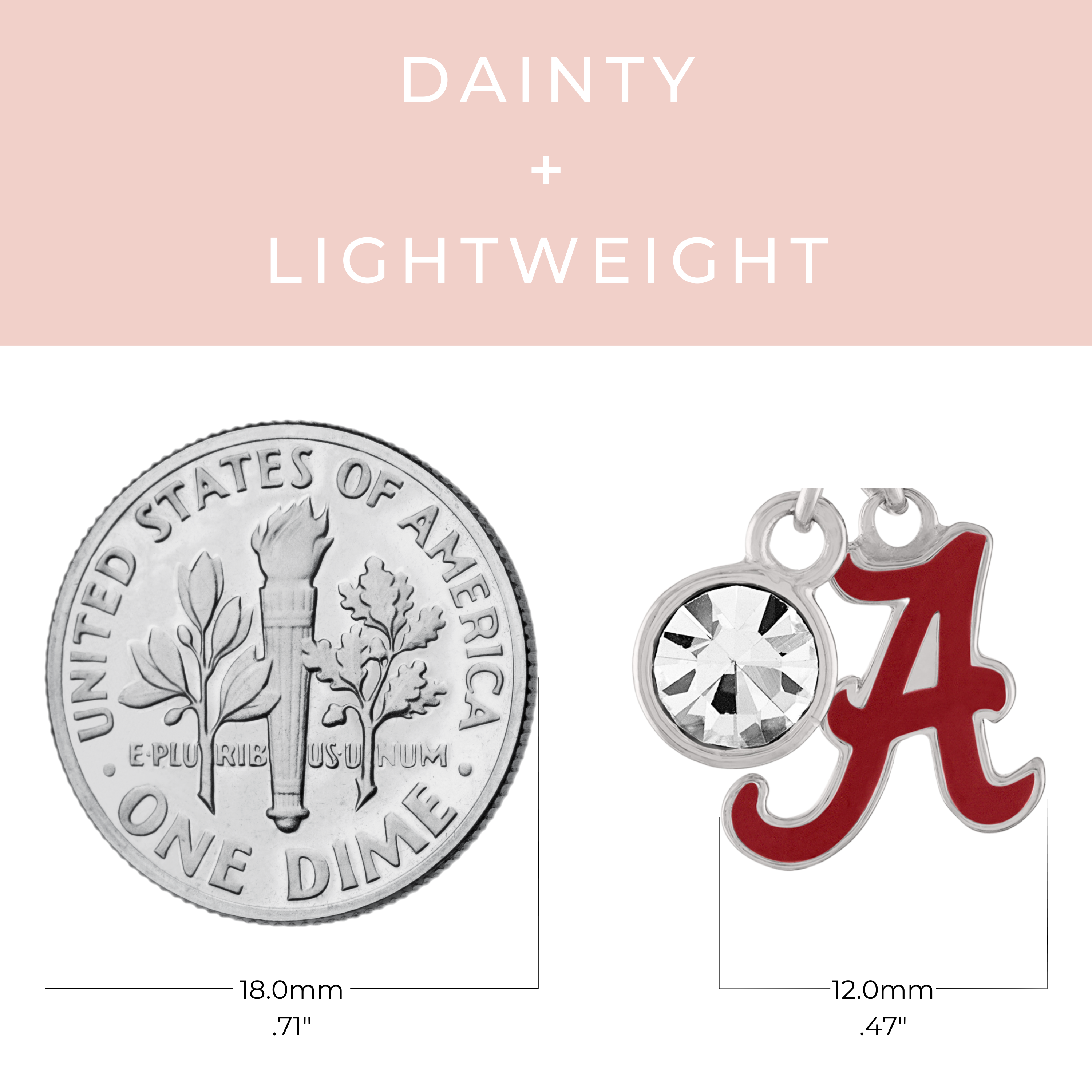 - Your Perfect Fit - This stainless steel Alabama necklace is adjustable in size from 16-20 inches, so you can always find the perfect fit. Whatever length you choose, this classic Alabama design will always show your Crimson Tide pride. The Script A pendant measures 12.0mm tall by 12.0mm wide; crystal measures 7.4mm across.