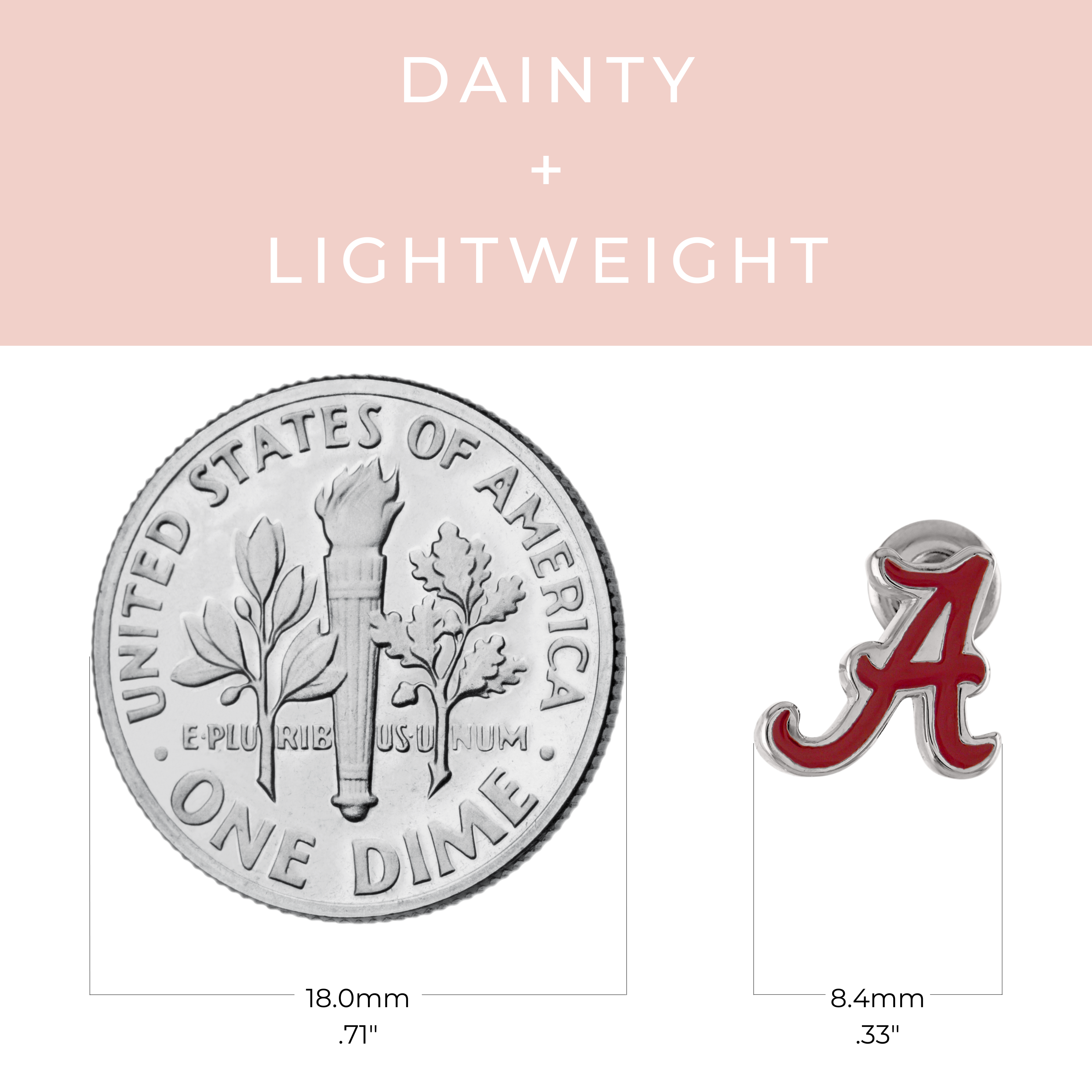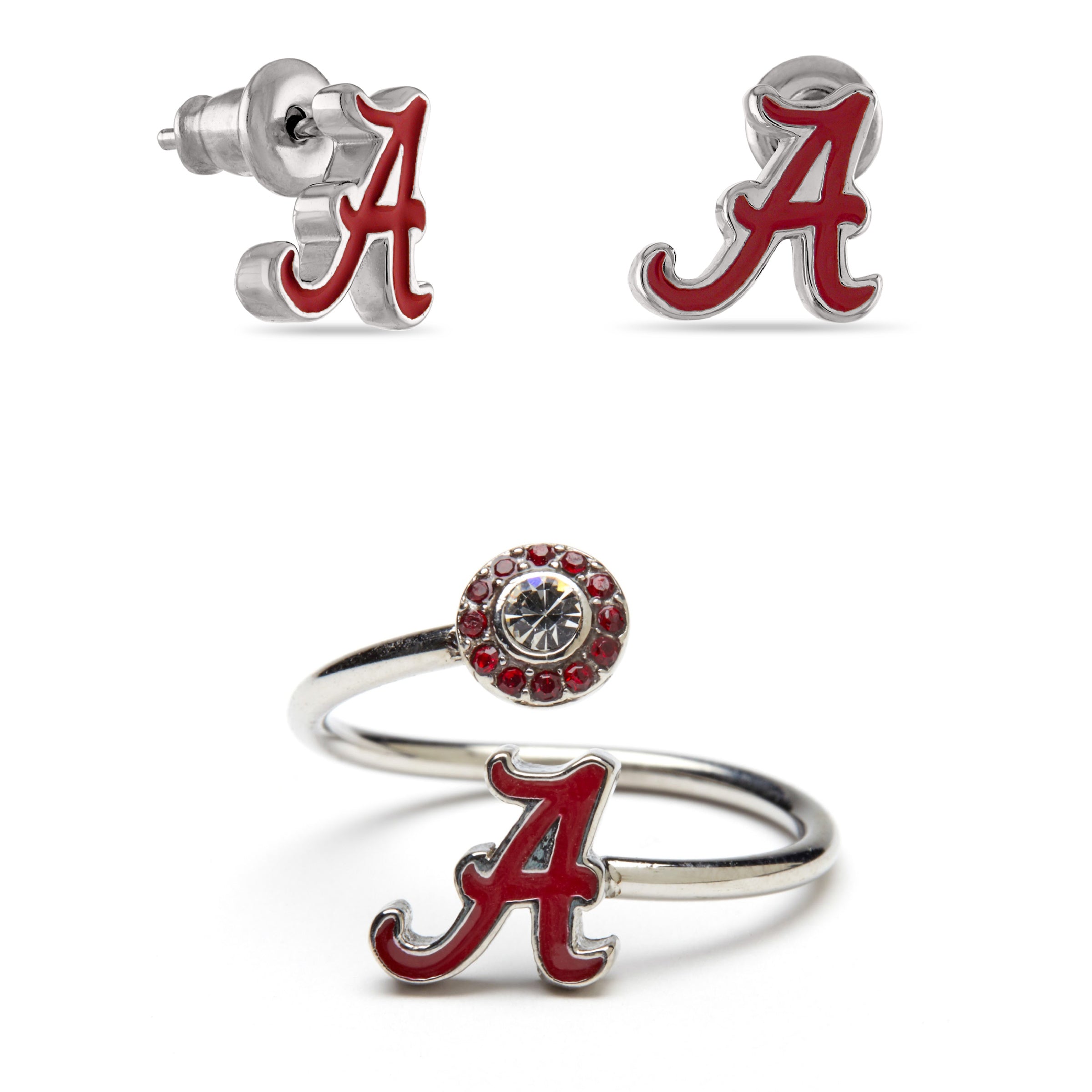 • 🤍YOUR PERFECT FIT: This University of Alabama jewelry set features stud earrings and an adjustable crystal wrap ring that fit most. Add this classic Alabama ring and earring set to your collection to show off your beloved Alabama Crimson Tide school and team! The crimson A stud earrings measure 8.35mm wide x 7.97mm tall; the crimson A crystal wrap ring is adjustable from size 5-12.