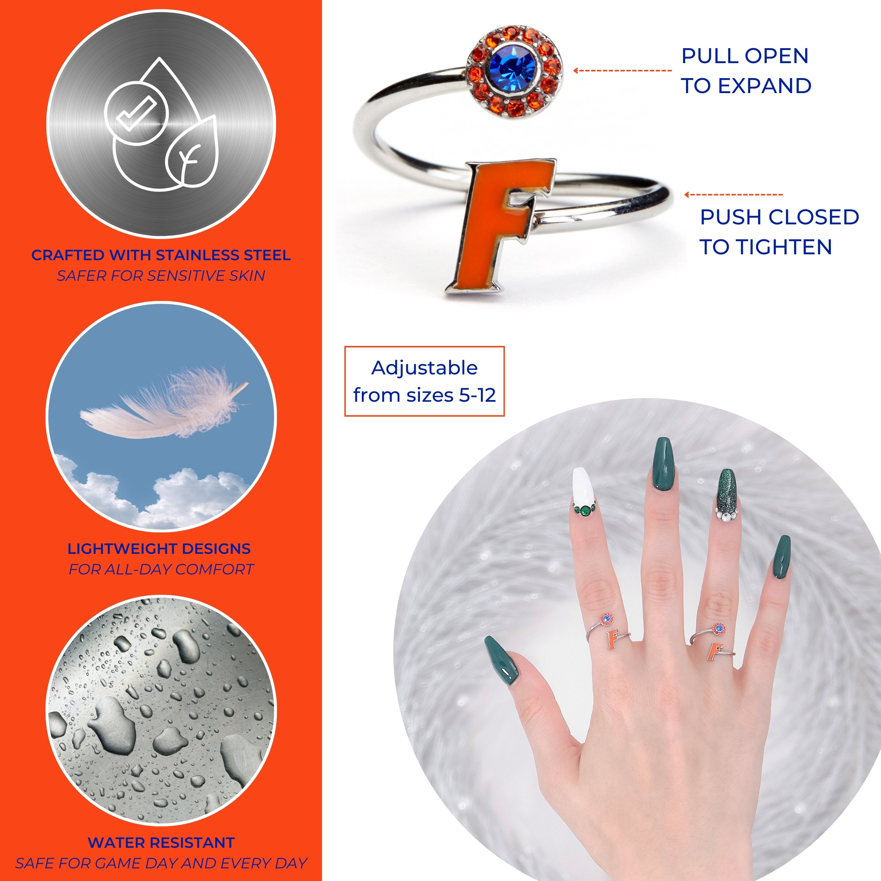 🧡YOUR PERFECT FIT: This stainless steel Florida ring is adjustable in size, fitting ring sizes 5-12. Add this sparkling classic Florida class ring to show off your beloved Florida Gators school and team.