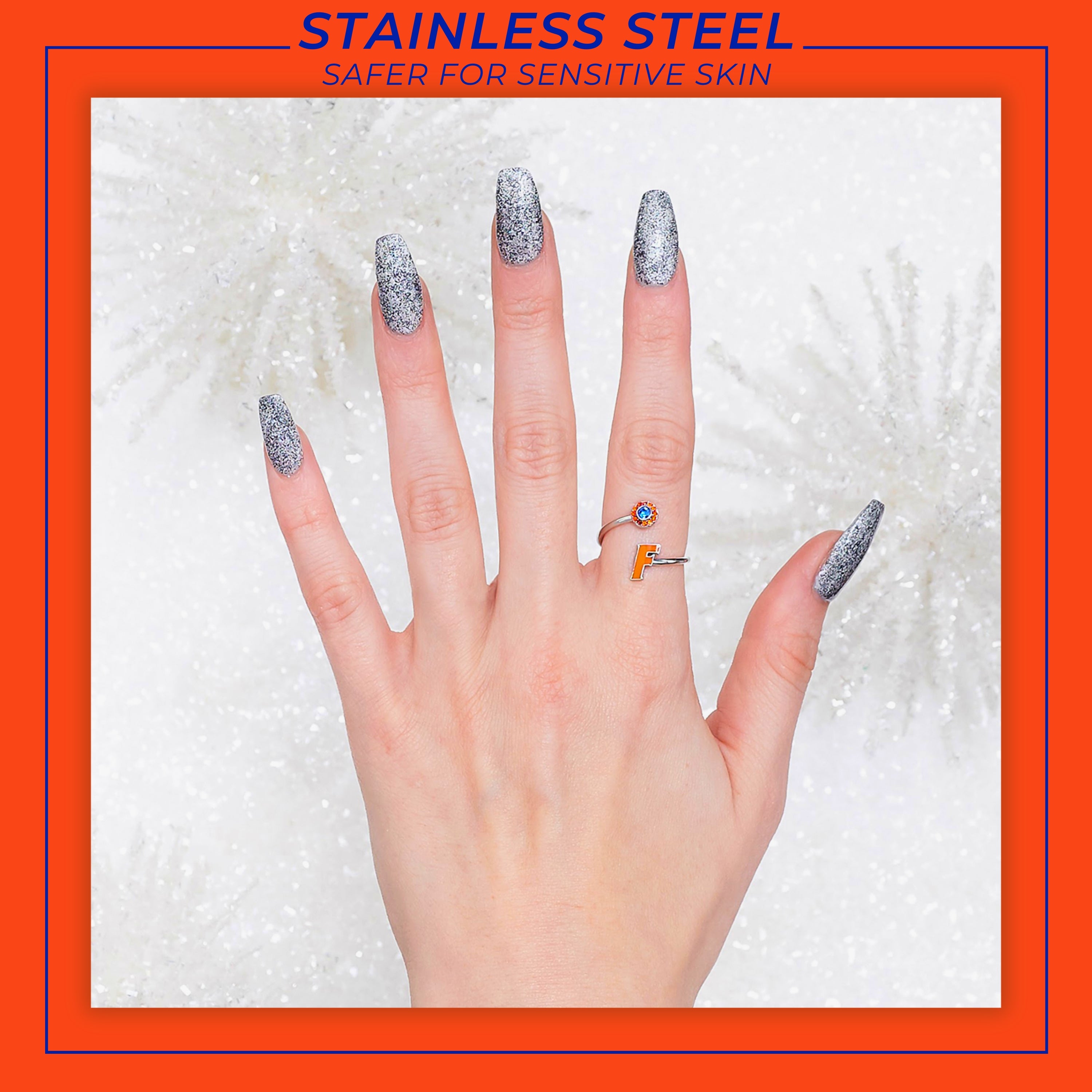 Stone Armory's Florida ring is finally here! Gear up for the game with our beautifully designed Florida Gators ring! Wear it to the next tailgate or around town to show off your University of Florida pride. This adjustable UF ring would also make the perfect Florida gift for your favorite Florida Gators fan! The Florida logo is accented by sparkling orange and blue crystals. Stone Armory's UF jewelry is made of stainless steel and is adjustable in size, making this NCAA Florida ring the perfect gift to celebrate Florida graduation, birthdays, Mother's Day, first day of school, the first game, or for everyday fan wear. Thank you for supporting our small business!