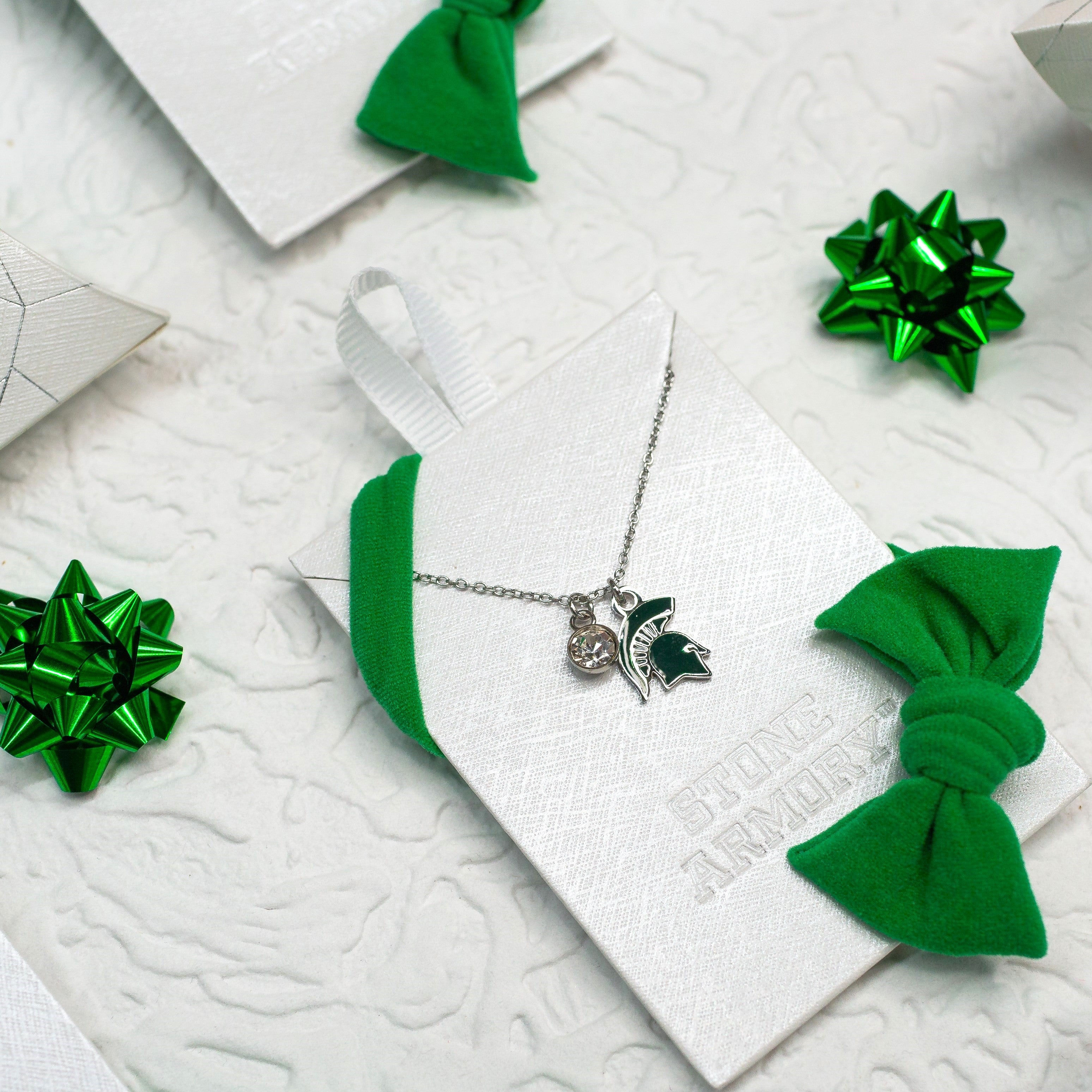 • TREASURE YOUR Michigan State Spartans SPIRIT: This Michigan State University crystal necklace from Stone Armory is officially licensed. Showcase your Spartan spirit with this classic Michigan State design, featuring a Spartan dangle charm and a sparkling Clear crystal accent.