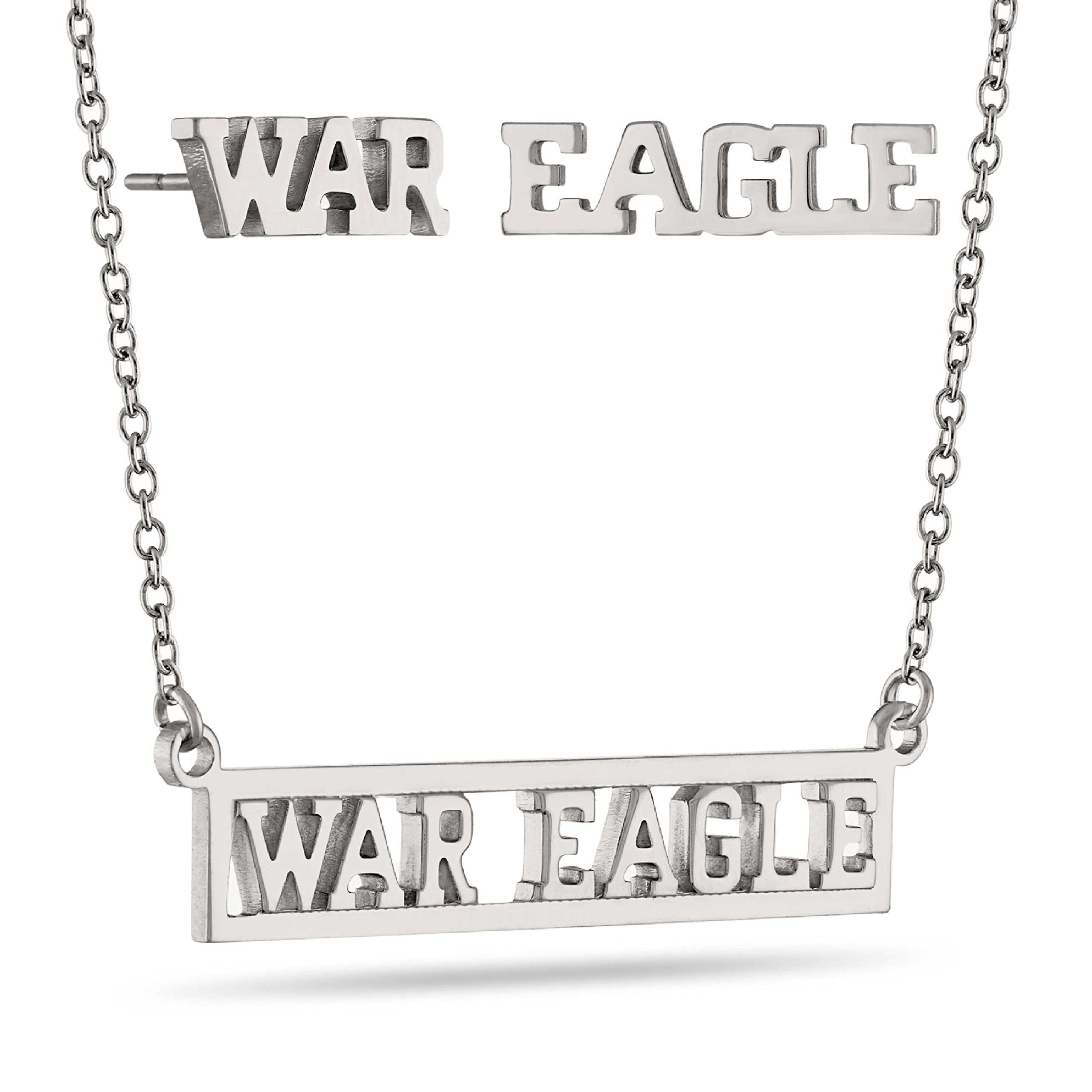 • YOUR PERFECT FIT: This Auburn University jewelry set features stud earrings and an adjustable necklace that fit most. Add this classic Auburn earring and necklace set to your collection to show off your beloved Auburn Tigers school and team! The WAR EAGLE stud earrings measure 11.57mm (WAR), 16.00mm (EAGLE) wide x 4.23mm tall; the WAR EAGLE necklace is adjustable from 16-20 inches.🧡