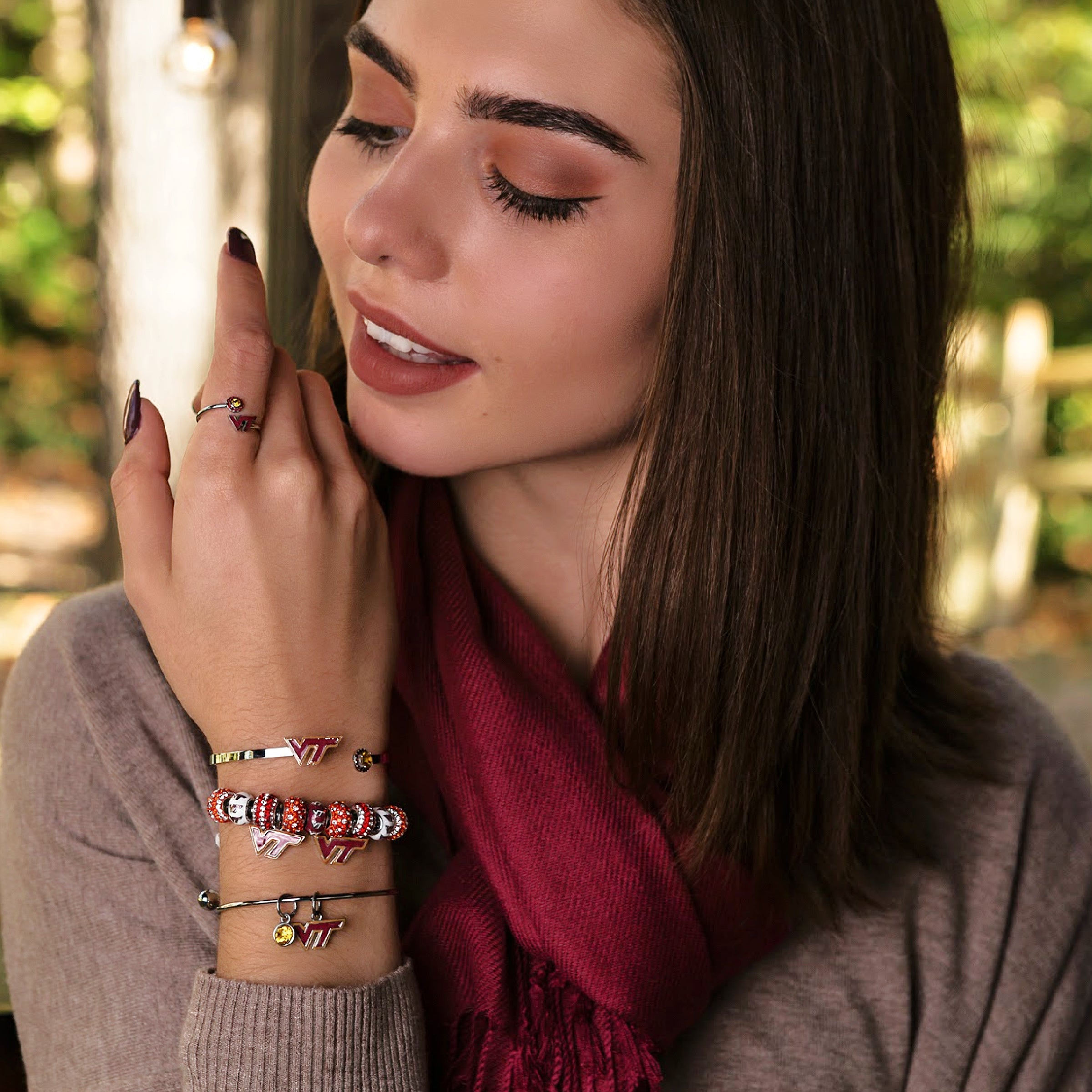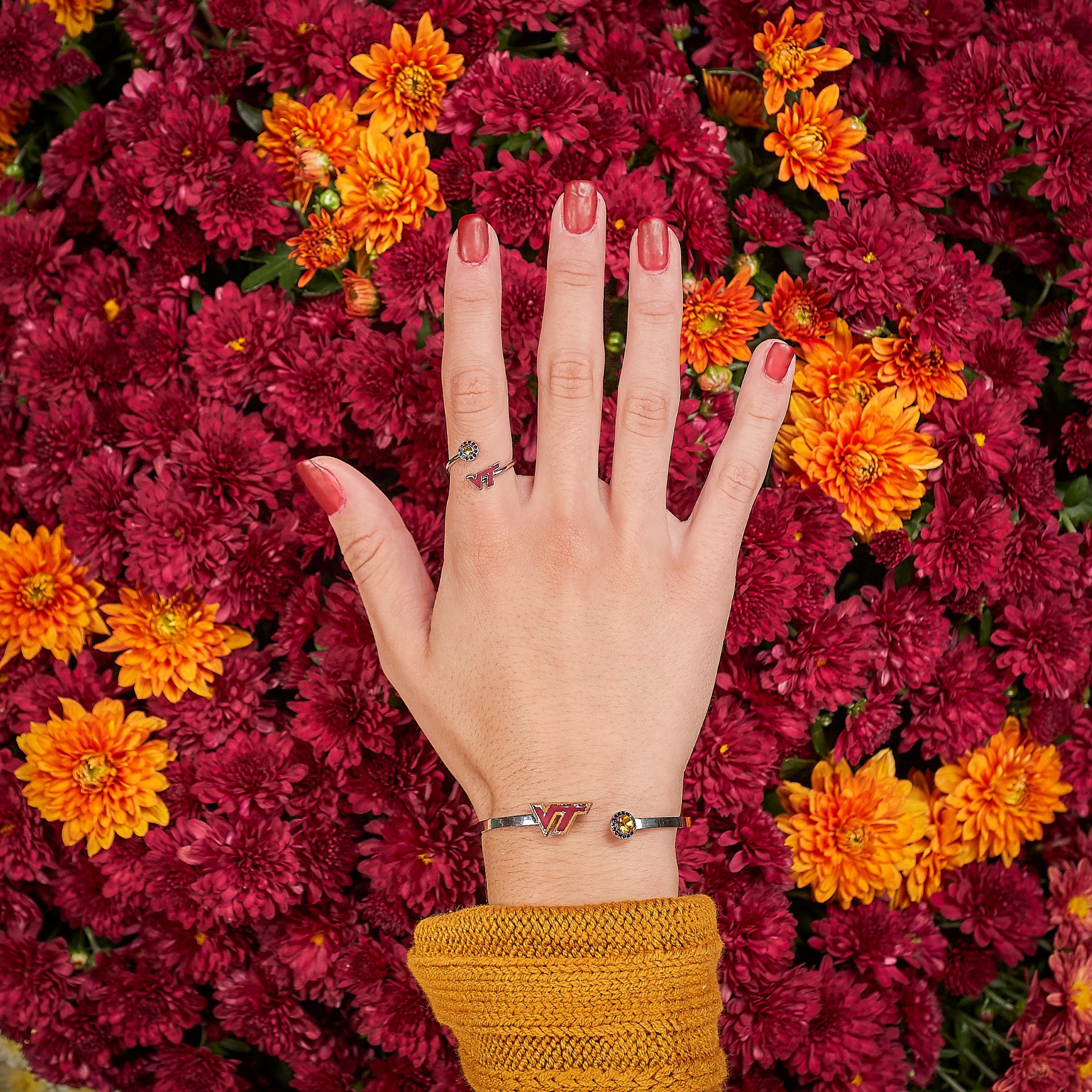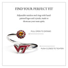 Gear up for The Virginia Tech game with this beautiful set! Keep them, gift them, or layer this bracelet and ring with other VT jewelry pieces to show support for your favorite team. This set will make the perfect gift for fans, students or alumni. Both ring and bangle features the official VT initials on one side and is accented by Swarovski and Czech crystals of the school colors on the other. Both ring and bangle are adjustable to fit most sizes and can easily be opened or closed to create the perfect fit. All of our Virginia Tech jewelry are made of long-lasting stainless steel. Product lifetime guaranteed.