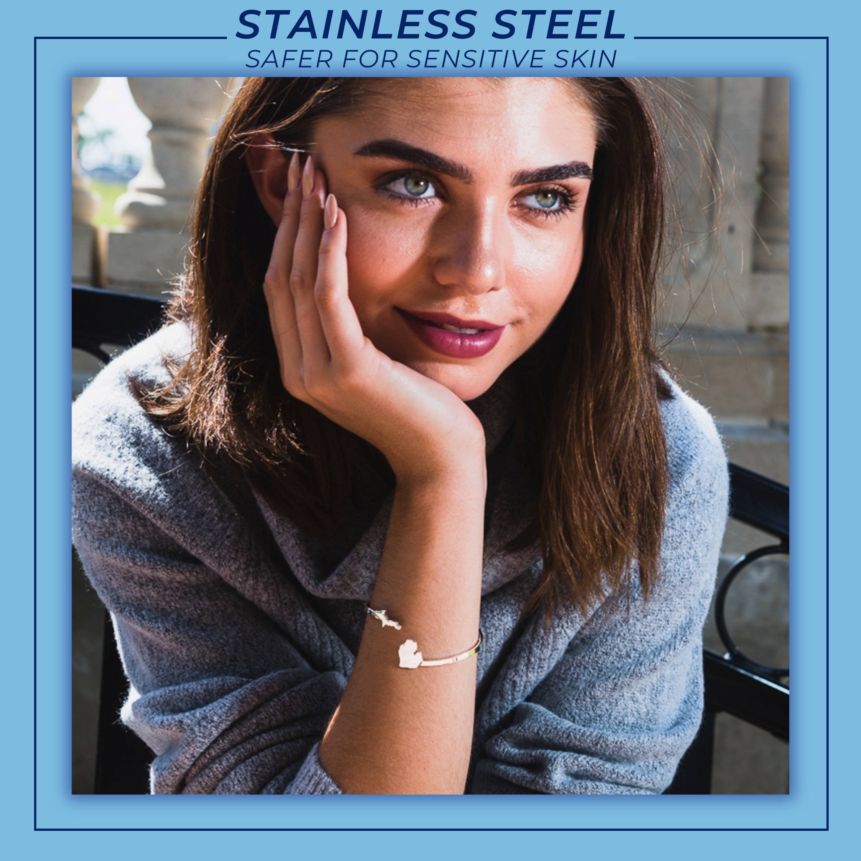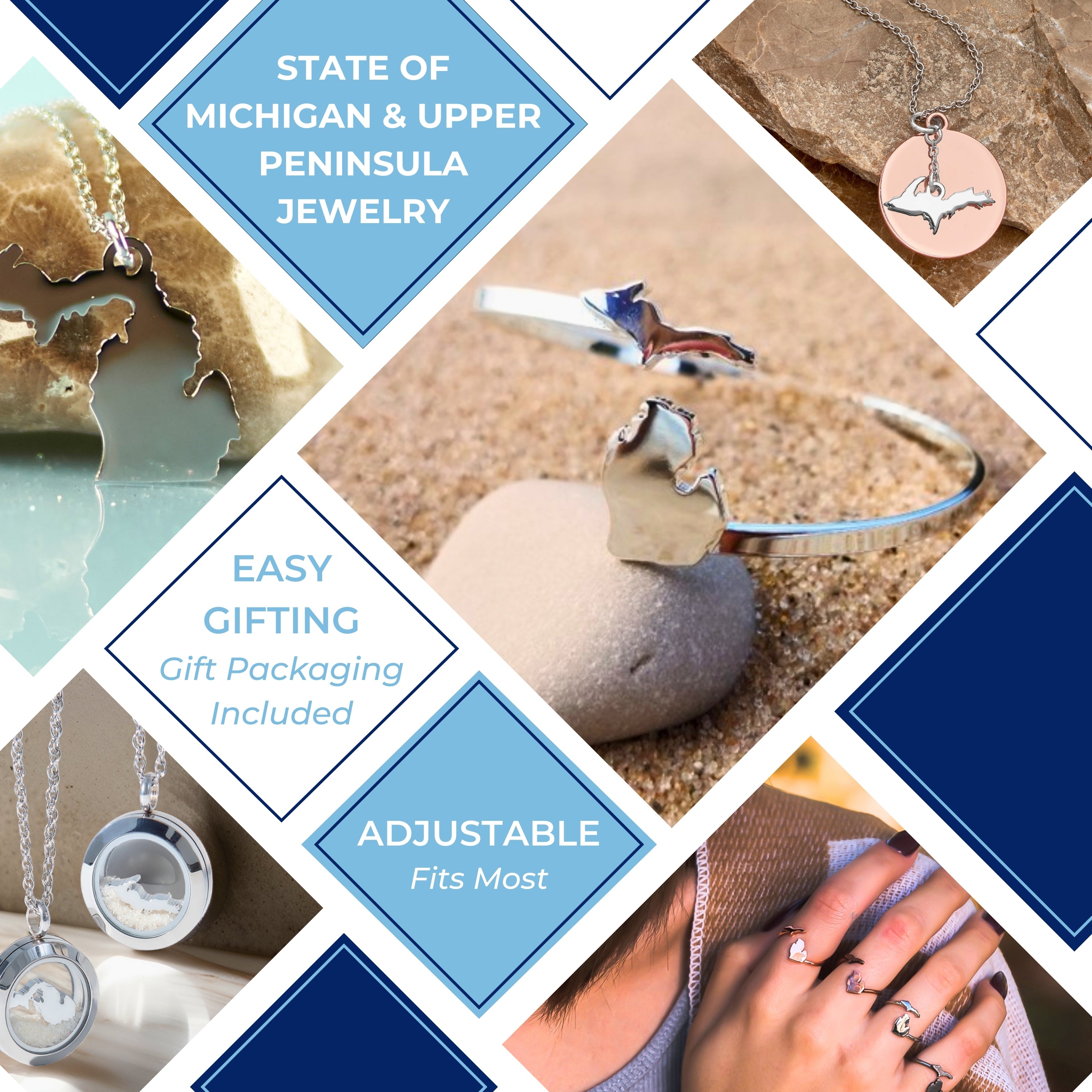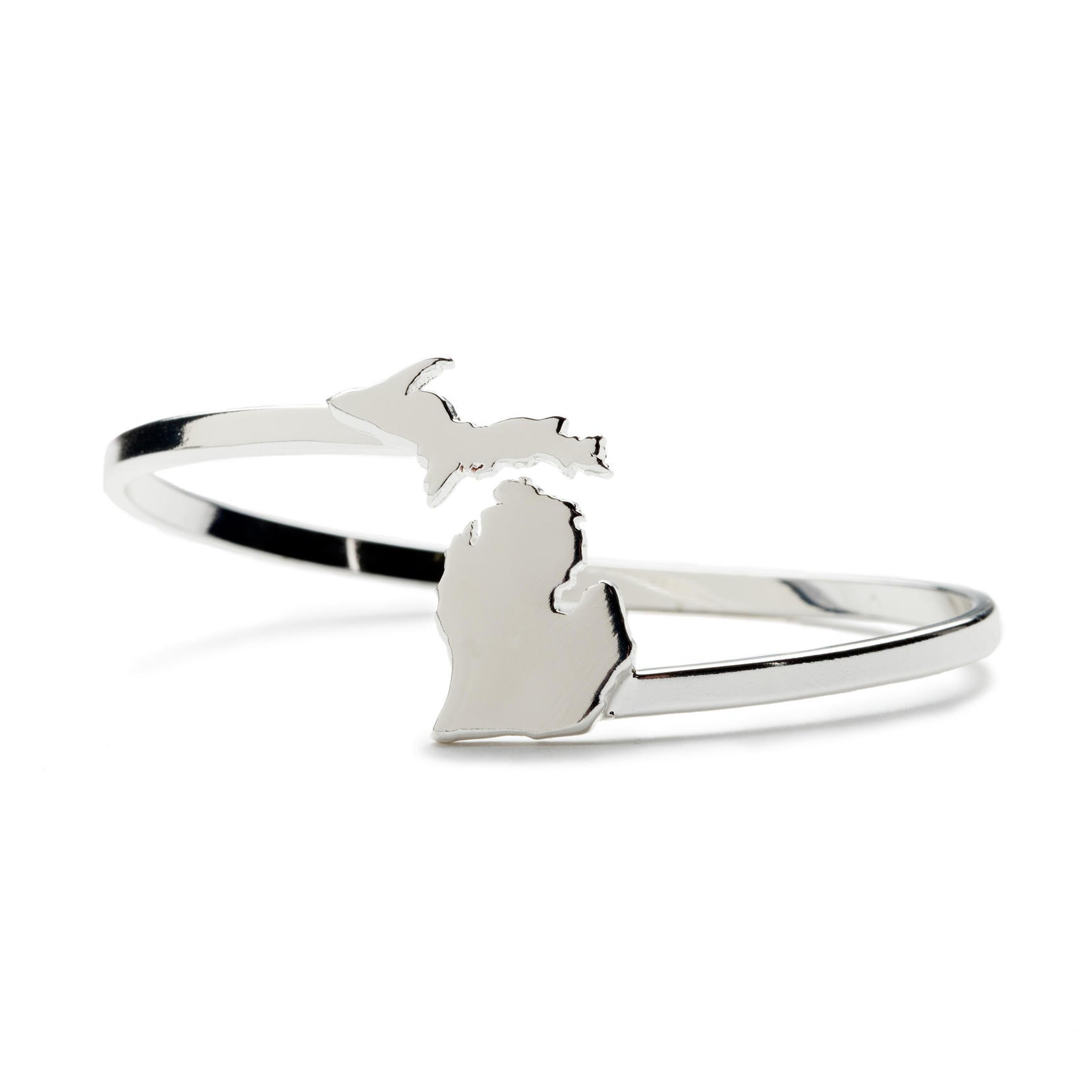 • 🌊YOUR PERFECT FIT: This silver plated brass Michigan bracelet is adjustable and fits most - simply expand or contract to find your perfect fit! Add this classic Michigan bangle to show off your beloved Mitten State.