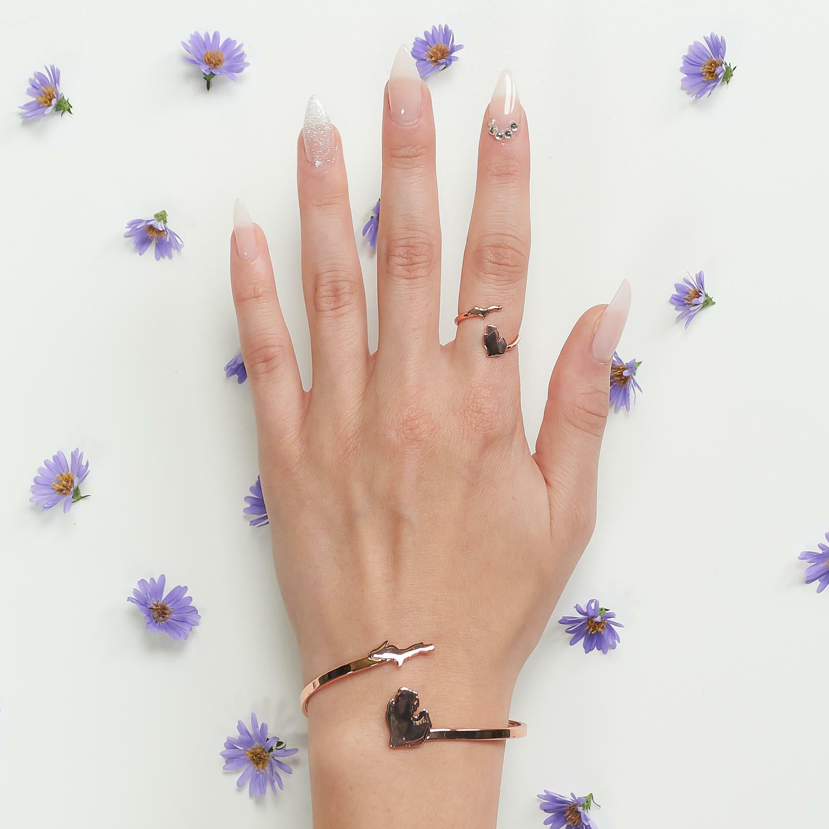 Stone Armory's copper plated brass Michigan Wrap Bracelet is here! Celebrate the Mitten State with our beautifully designed adjustable wrap bracelet. Wear it to your next Cherry Festival or around town to show off your Michigan pride. This classic Michigan bangle would also make the perfect gift for your favorite Michigander! Stone Armory's Michigan bracelet is made of copper plated brass and carefully designed, making this Michigan bracelet the perfect gift to celebrate Michigan graduations, birthdays, Mother's Day, first day of school, first day of summer, or for everyday wear. Thank you for supporting our small business!