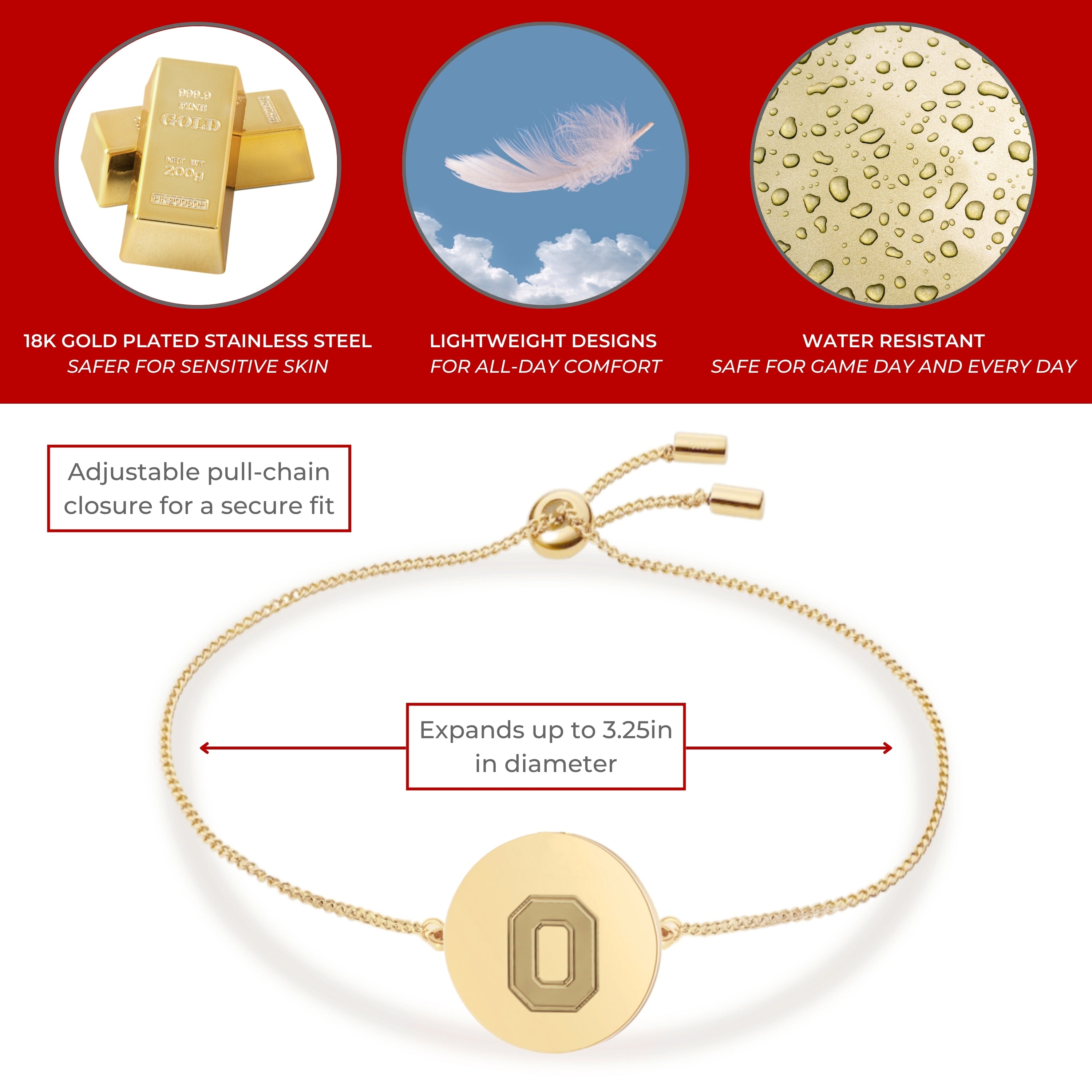 Sport your Buckeye Spirit in Style with this Exquisitely Crafted Ohio State Bracelet : Treasure your Ohio State Buckeye Spirit with this Ohio State adjustable bolo chain bracelet for women and men; this Ohio State University bracelet features an engraved block O charm design on an 18K gold plated stainless steel bracelet