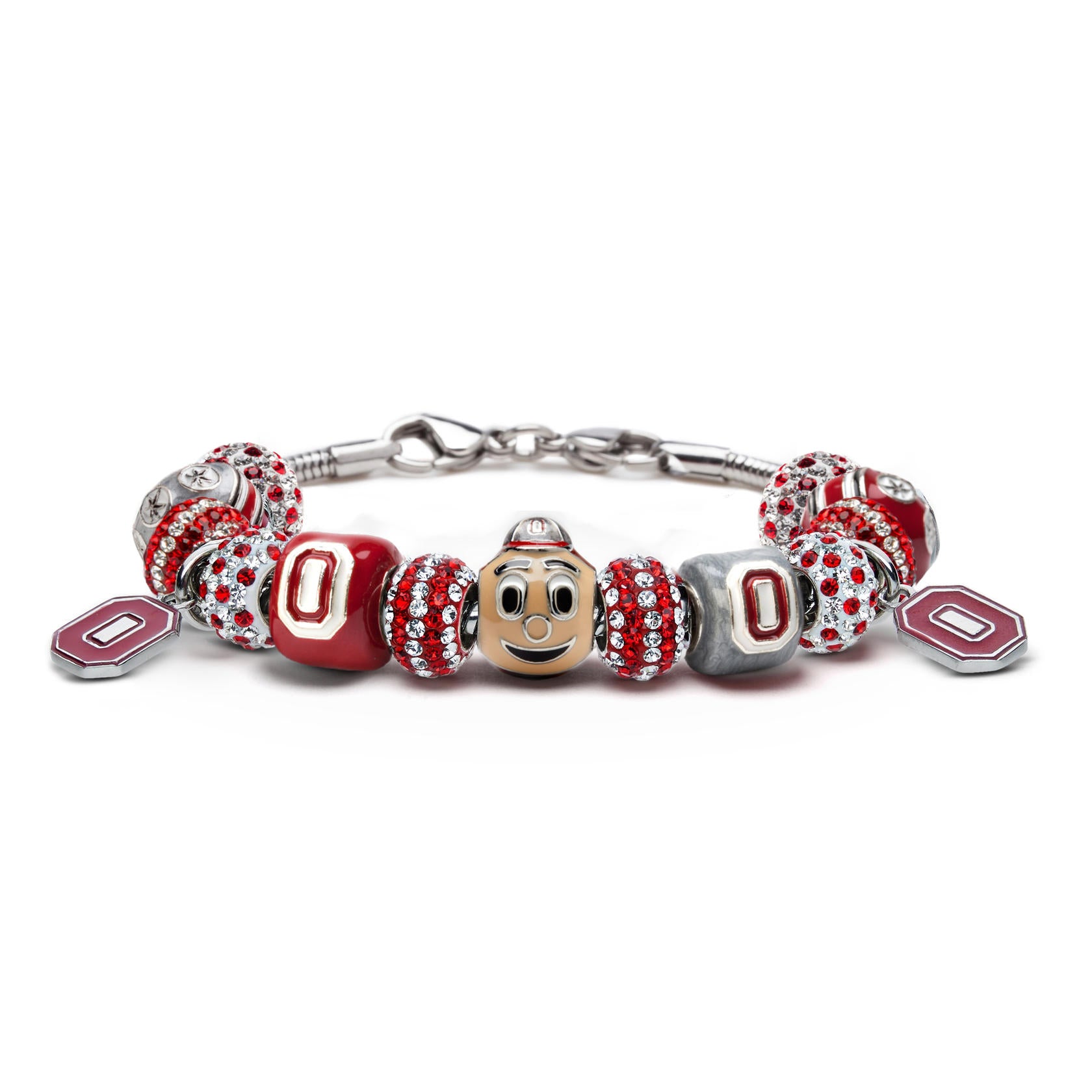 This bracelet features seven officially licensed OSU Buckeyes charms and is accented by eight crystals in clear and iconic Ohio State scarlet. A chic and eye-catching way to cheer on your Ohio State Buckeyes team! This is the perfect gift for any attending Ohio State University student, Buckeyes college football fan or loyal Ohio alumni. OSU charms and bracelets are made of stainless steel. Go Bucks!