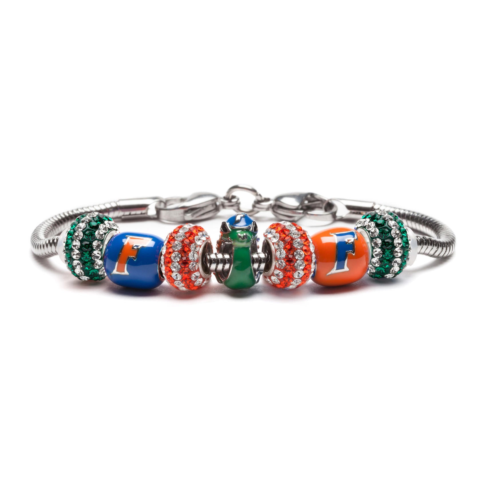 Gear up for the game! This 8 piece Florida Gators bead charm bracelet will make the perfect addition to your game day wear! Includes 3 University of Florida bead charms, 4 Austrian crystal charms in orange and blue, and a stainless steel adjustable bracelet chain. Officially licensed by University of Florida.