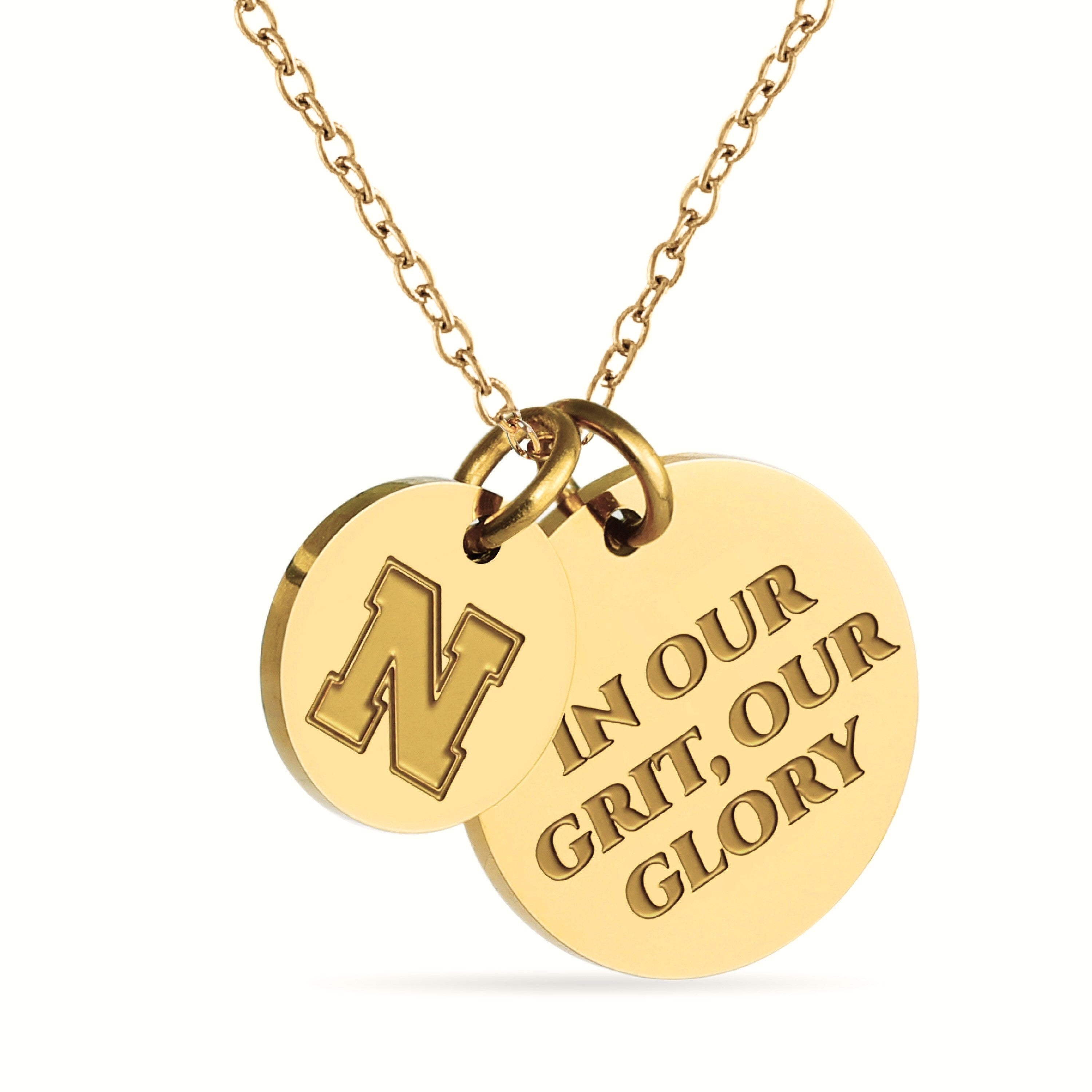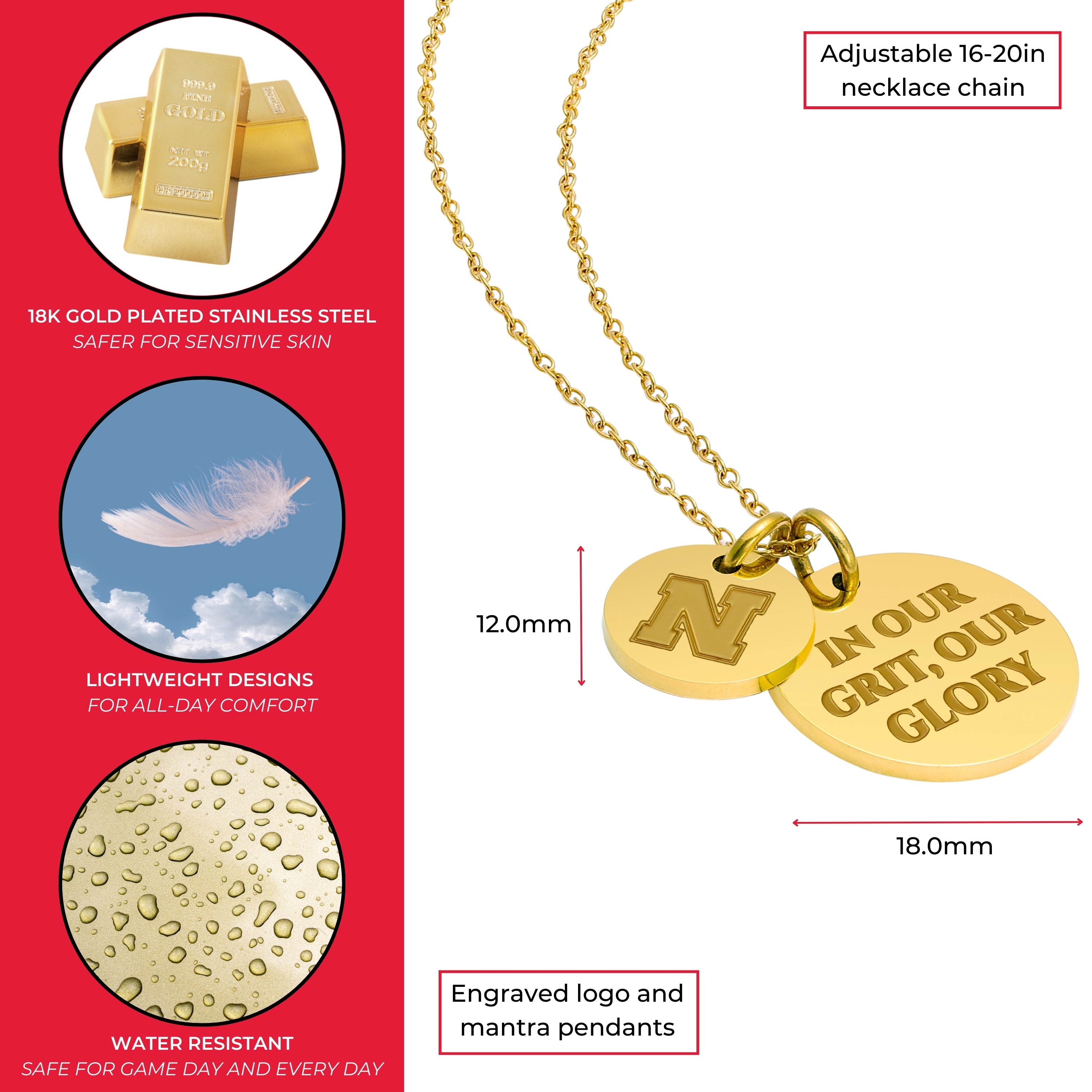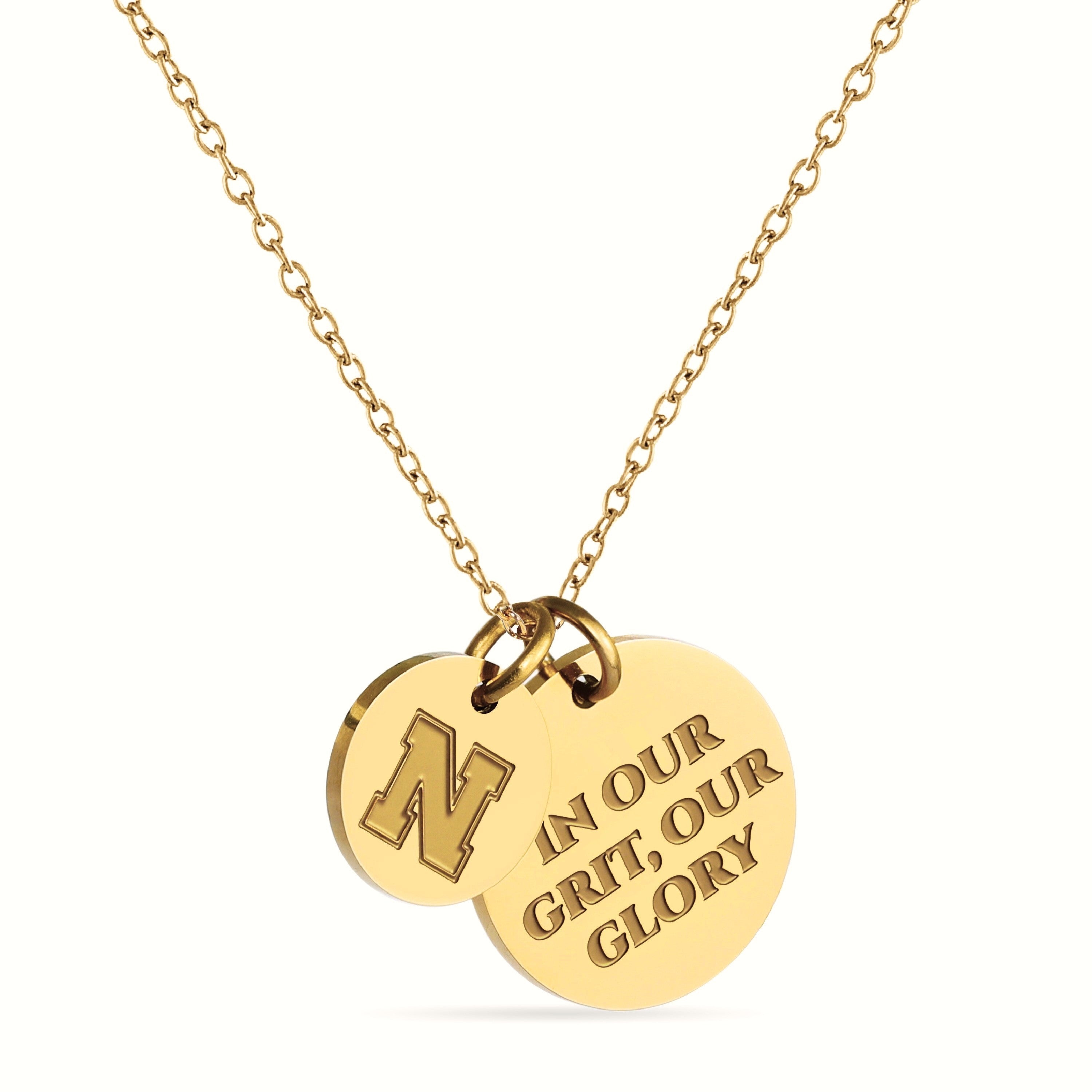 Proudly display your Nebraska Cornhuskers pride with this officially licensed Nebraska necklace, featuring two gold-plated pendants engraved with the iconic Nebraska N and the inspiring mantra, 'In Our Grit, Our Glory This pendant necklace, made from surgical-grade stainless steel and coated in 18K gold, offers both durability and elegance. Its adjustable length (16-20 inches) makes it perfect for everyday wear or Nebraska game day. Whether you're attending a game or gifting it for a special occasion, this necklace is ideal for Nebraska fans, students, and alumni. It makes a thoughtful present for birthdays, Mother’s Day, graduations, Christmas, any other celebration. Packaged simply yet beautifully, this necklace arrives ready for gifting, ensuring it will delight any Nebraska fan