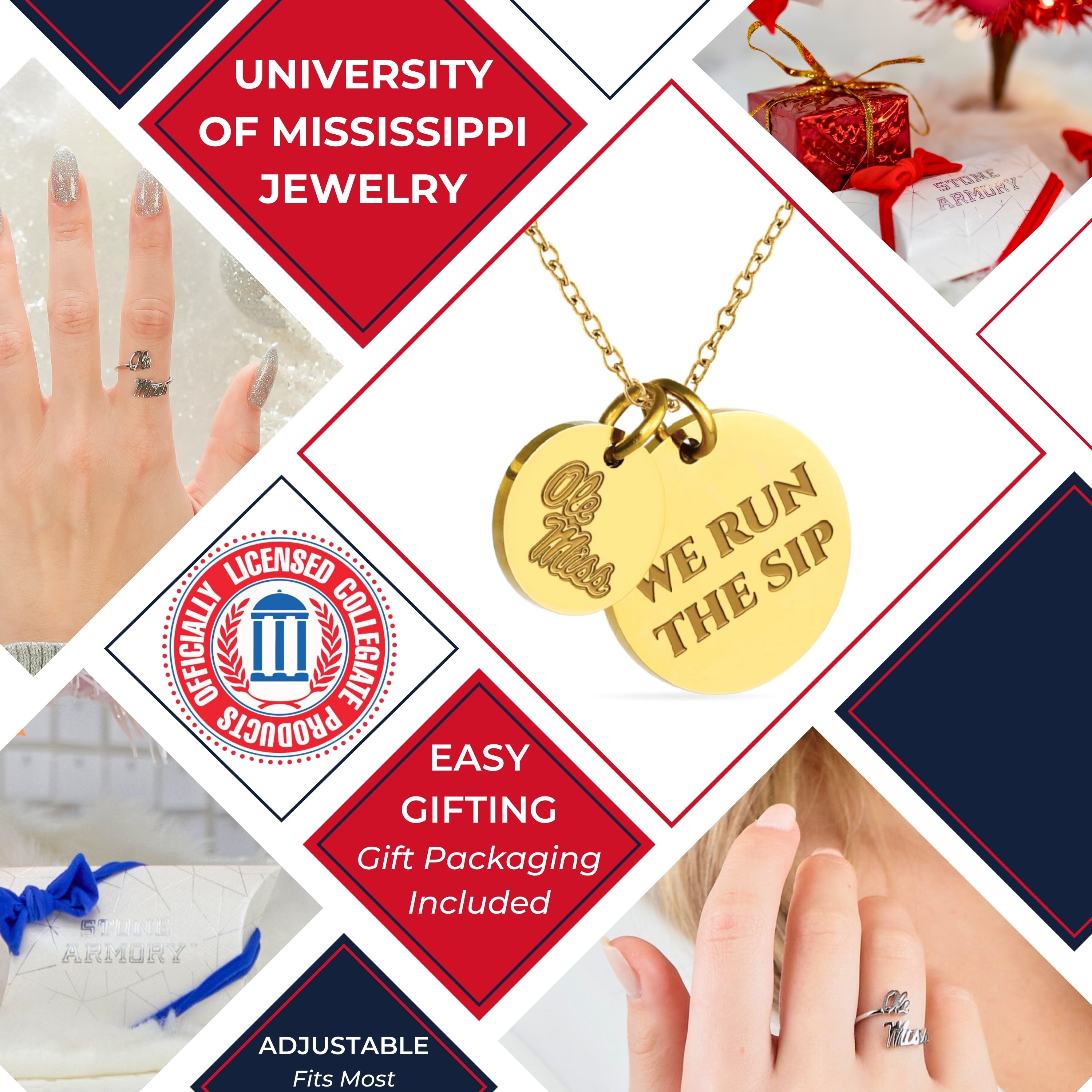 Express Your Ole Miss Rebels Spirit Every Day: This officially licensed Stone Armory University of Mississippi necklace features 18K gold-plated pendants engraved with the iconic script Ole Miss and the mantra 'We Run the Sip.' Designed for both casual and game-day wear, this adjustable necklace (16-20 inches) makes the perfect gift for Ole Miss fans, students, and alumni