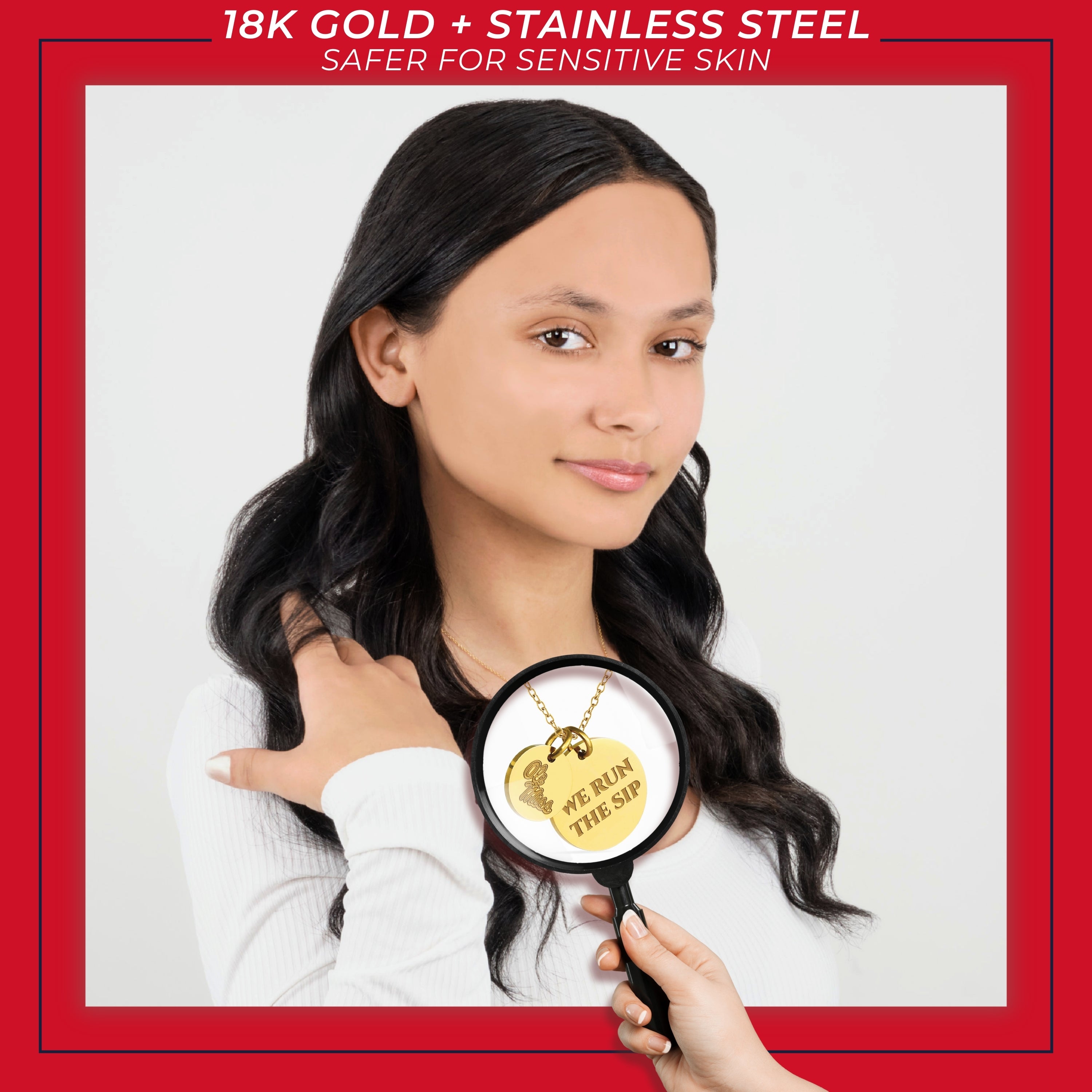 Proudly display your Ole Miss Rebels pride with this officially licensed Ole Miss necklace, featuring two gold-plated pendants engraved with the iconic script Ole Miss and the inspiring mantra, 'We Run the Sip This pendant necklace, made from surgical-grade stainless steel and coated in 18K gold, offers both durability and elegance. Its adjustable length (16-20 inches) makes it perfect for everyday wear or Ole Miss game day. Whether you're attending a game or gifting it for a special occasion, this necklace is ideal for Ole Miss fans, students, and alumni. It makes a thoughtful present for birthdays, Mother’s Day, graduations, Christmas, any other celebration. Packaged simply yet beautifully, this necklace arrives ready for gifting, ensuring it will delight any Ole Miss fan