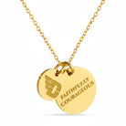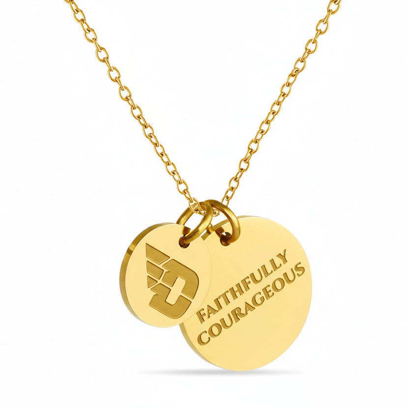 Proudly display your Dayton Flyers pride with this officially licensed Dayton necklace, featuring two gold-plated pendants engraved with the iconic Dayton Flyers athletic logo and the inspiring mantra, 'Faithfully Courageous This pendant necklace, made from surgical-grade stainless steel and coated in 18K gold, offers both durability and elegance. Its adjustable length (16-20 inches) makes it perfect for everyday wear or Dayton game day. Whether you're attending a game or gifting it for a special occasion, this necklace is ideal for Dayton fans, students, and alumni. It makes a thoughtful present for birthdays, Mother’s Day, graduations, Christmas, any other celebration. Packaged simply yet beautifully, this necklace arrives ready for gifting, ensuring it will delight any Dayton fan