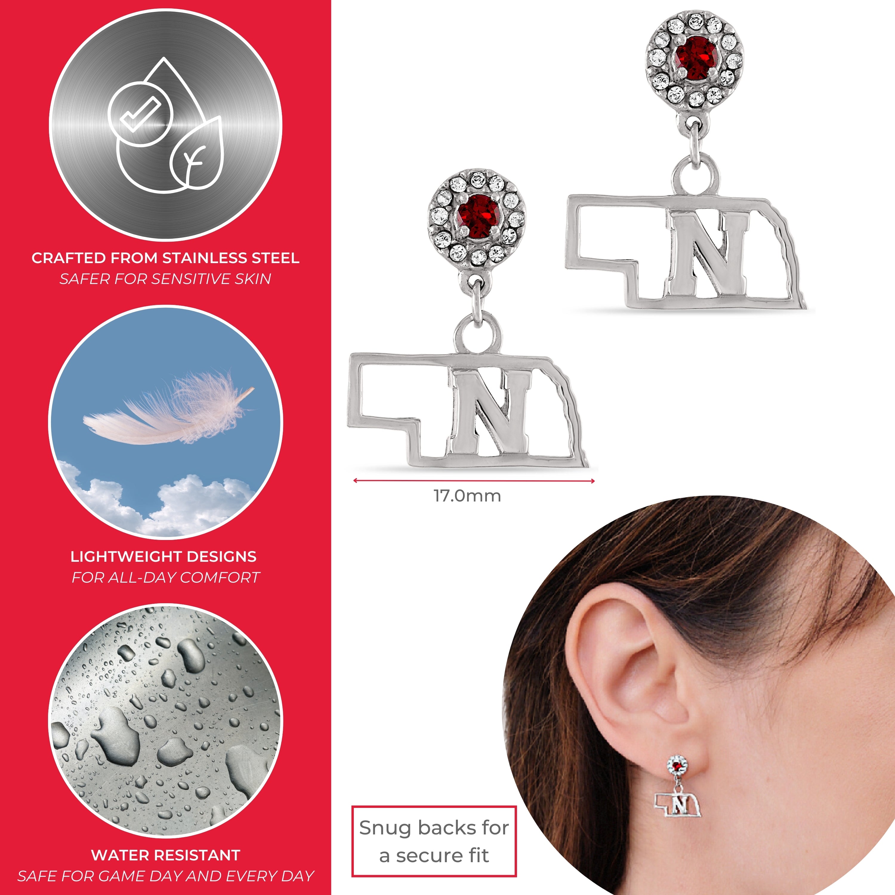 🤍YOUR PERFECT FIT: These stainless steel Nebraska drop earrings are always the perfect fit. Add these sparkling, classic Nebraska earrings to show off your beloved Nebraska Cornhuskers school and team. These Nebraska earrings measure 18.69mm long by 16.61mm wide.