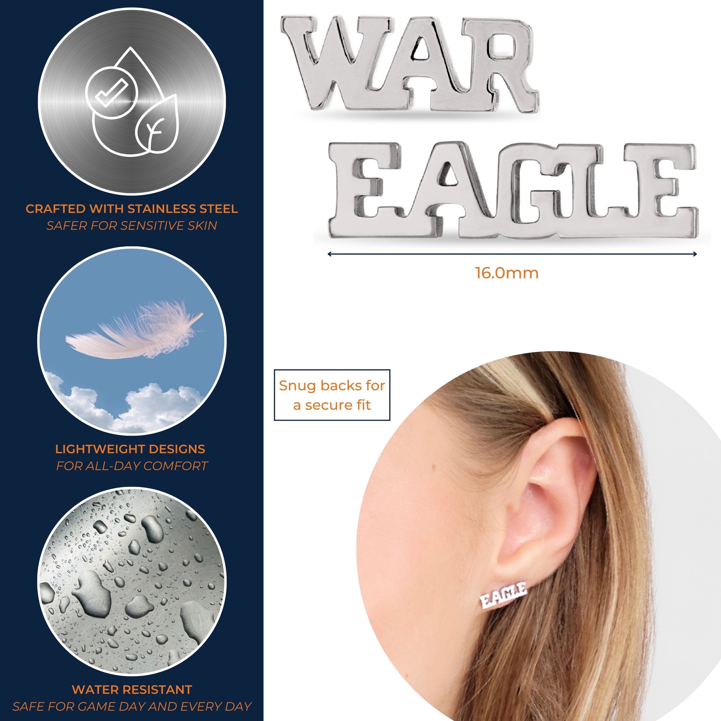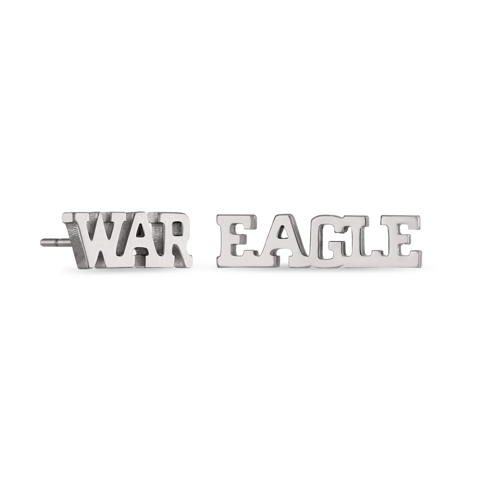 Your Perfect Fit - These stainless steel earrings for women are always the perfect fit. Show off your beloved Auburn Tigers football team and school with these statement earrings. Wear them alone or with our WAR EAGLE letter pendant necklace to create your own Auburn jewelry set! The WAR stud earring measures 11.57mm wide x 4.23mm tall; the EAGLE stud earring measures 16.00mm x 4.23mm tall.