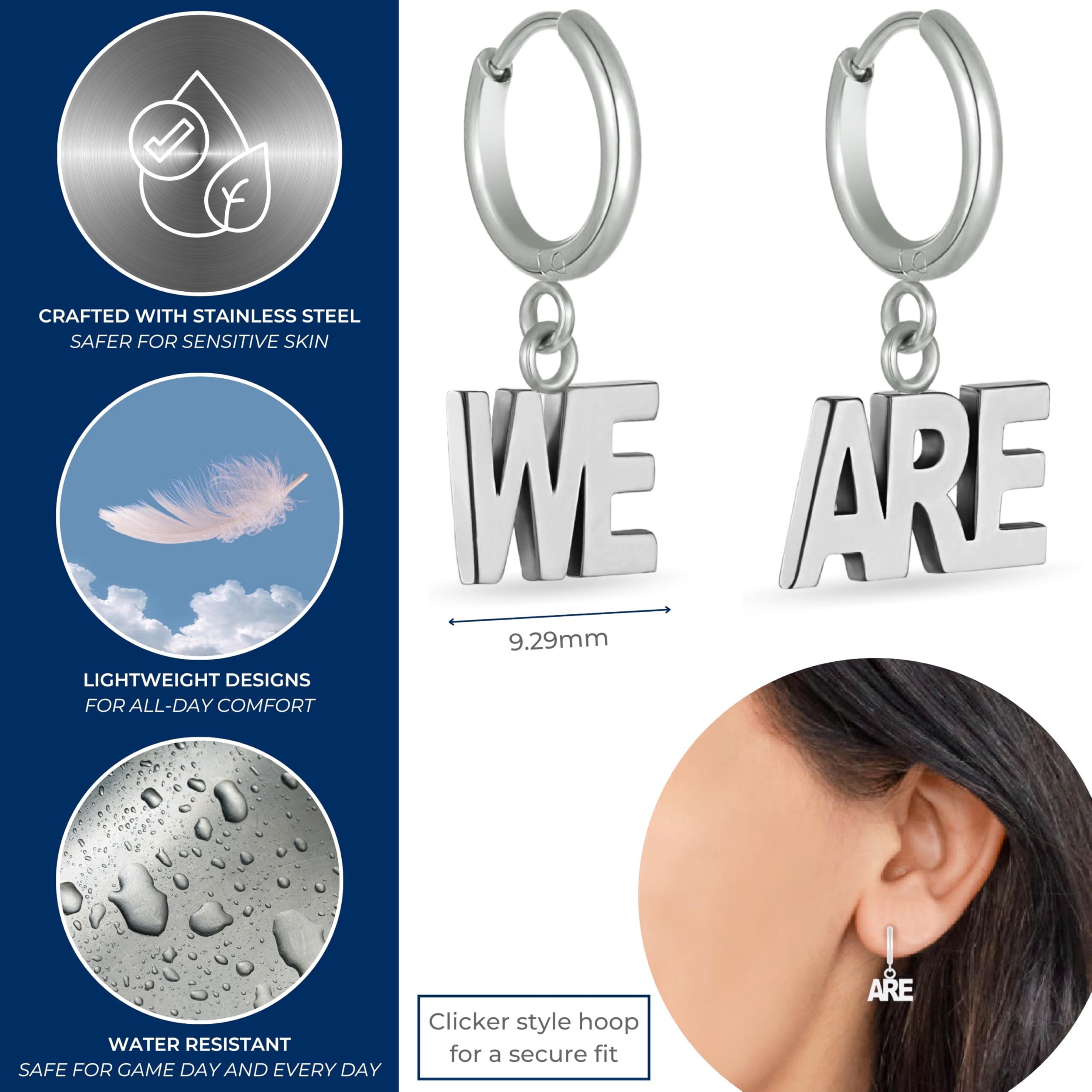 Stone Armory's Penn State We Are Huggie Hoop Earrings are Here Gear up for the game with these Penn State Nittany Lions huggie hoop earrings, featuring a We Are design. Perfect for tailgates or casual outings, these earrings let you proudly display your Penn State University spirit wherever you go. Crafted from stainless steel, these lightweight earrings are designed for sensitive ears, providing all-day comfort. They make an ideal gift for women, students, graduates, and Penn State fans. Celebrate Penn State graduation, birthdays, Mother's Day, the first day of school, or wear them to the first game and beyond. Add these versatile earrings to your Penn State fan wear collection for everyday style. Thank you for supporting our small business with this officially licensed Penn State jewelry.