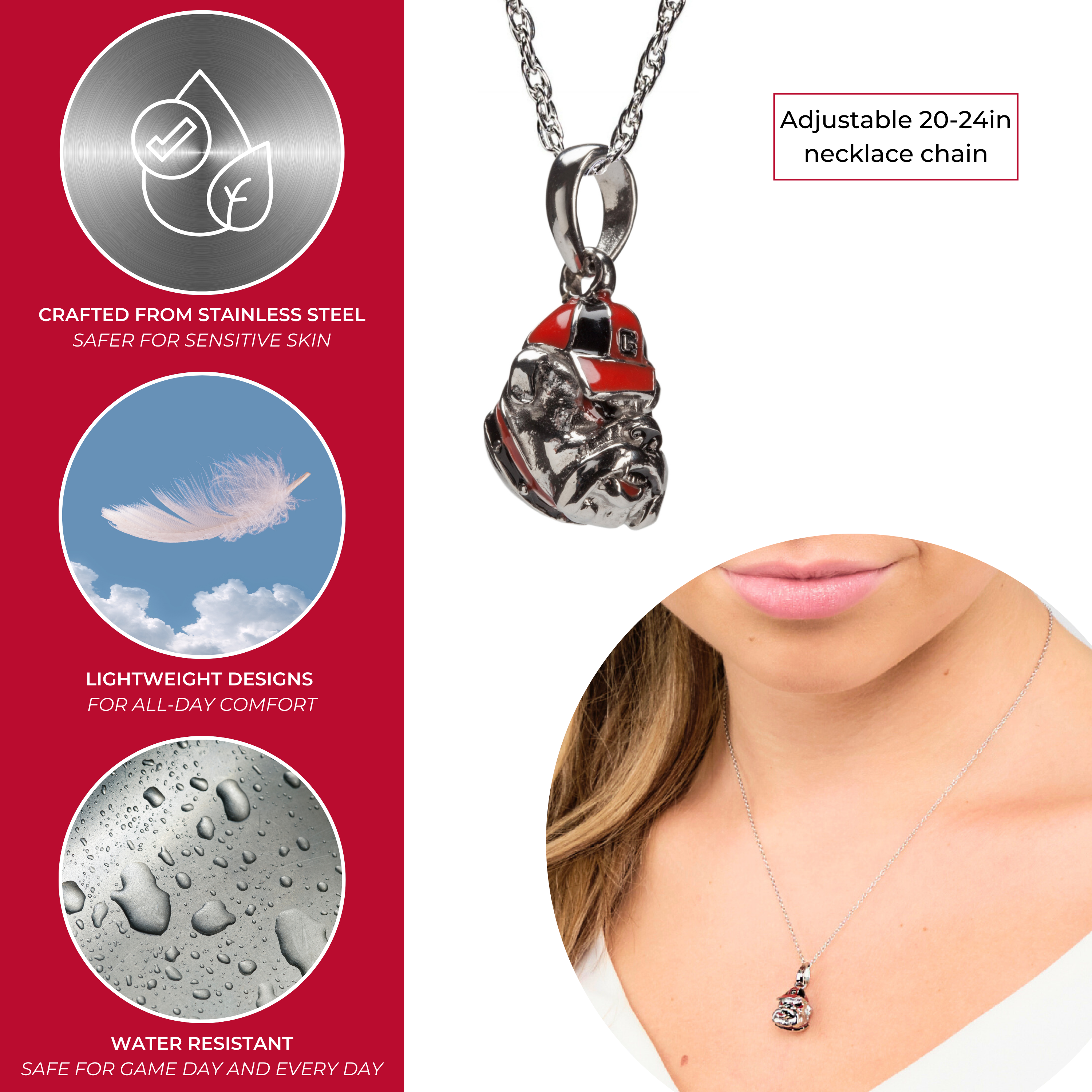 • 🖤YOUR PERFECT FIT: This stainless steel Georgia necklace is adjustable in size, with a chain that adjusts between 18-20 inches. Add this classic Georgia necklace to show off your beloved Georgia Bulldogs school and team. The Bulldog pendant measures 14.5mm tall by 12.2mm wide.