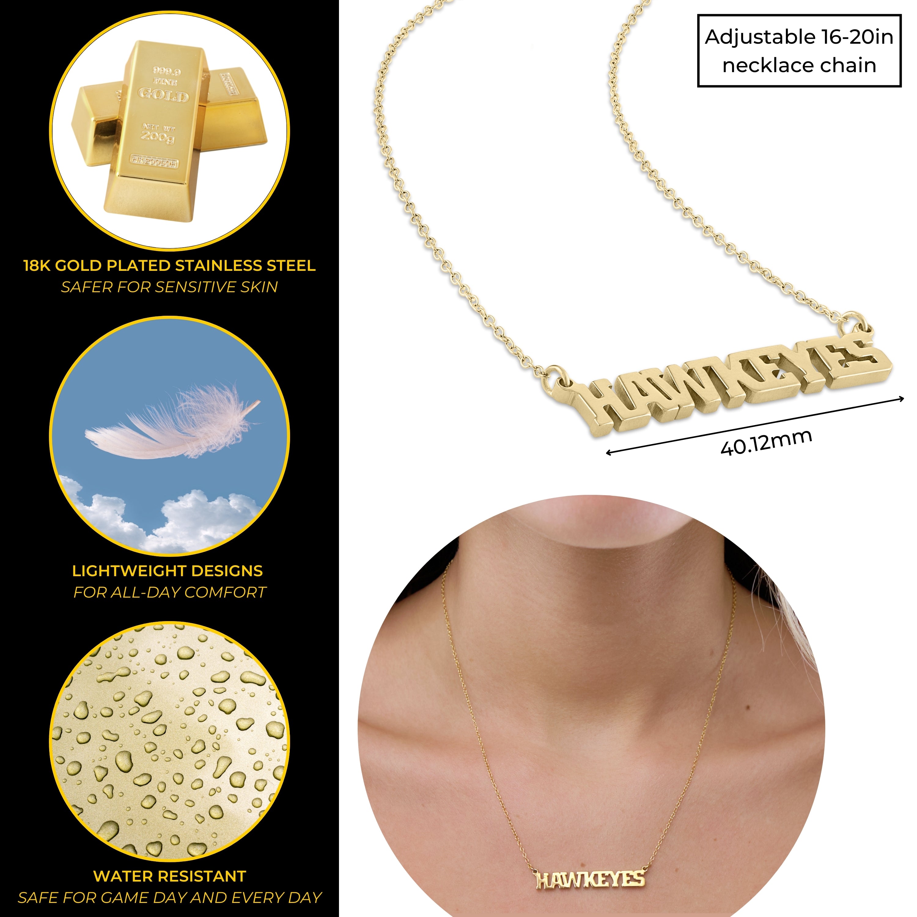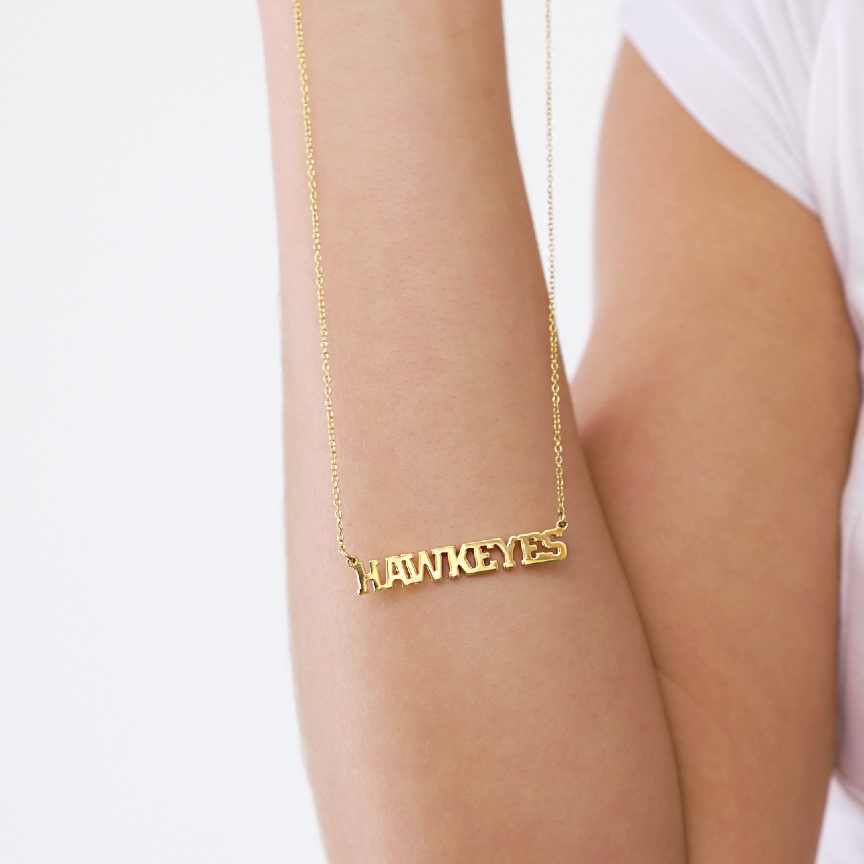 Your Perfect Fit - This gold pendant necklace is adjustable from 16-20in and is always the perfect fit. Show off your beloved Iowa Hawkeyes football team and school with our Hawkeye accessories! Wear your HAWKEYES necklace alone or as an addition to your other gold chain layering necklaces. The HAWKEYES lettering measures 39.76mm long x 6.17mm tall.