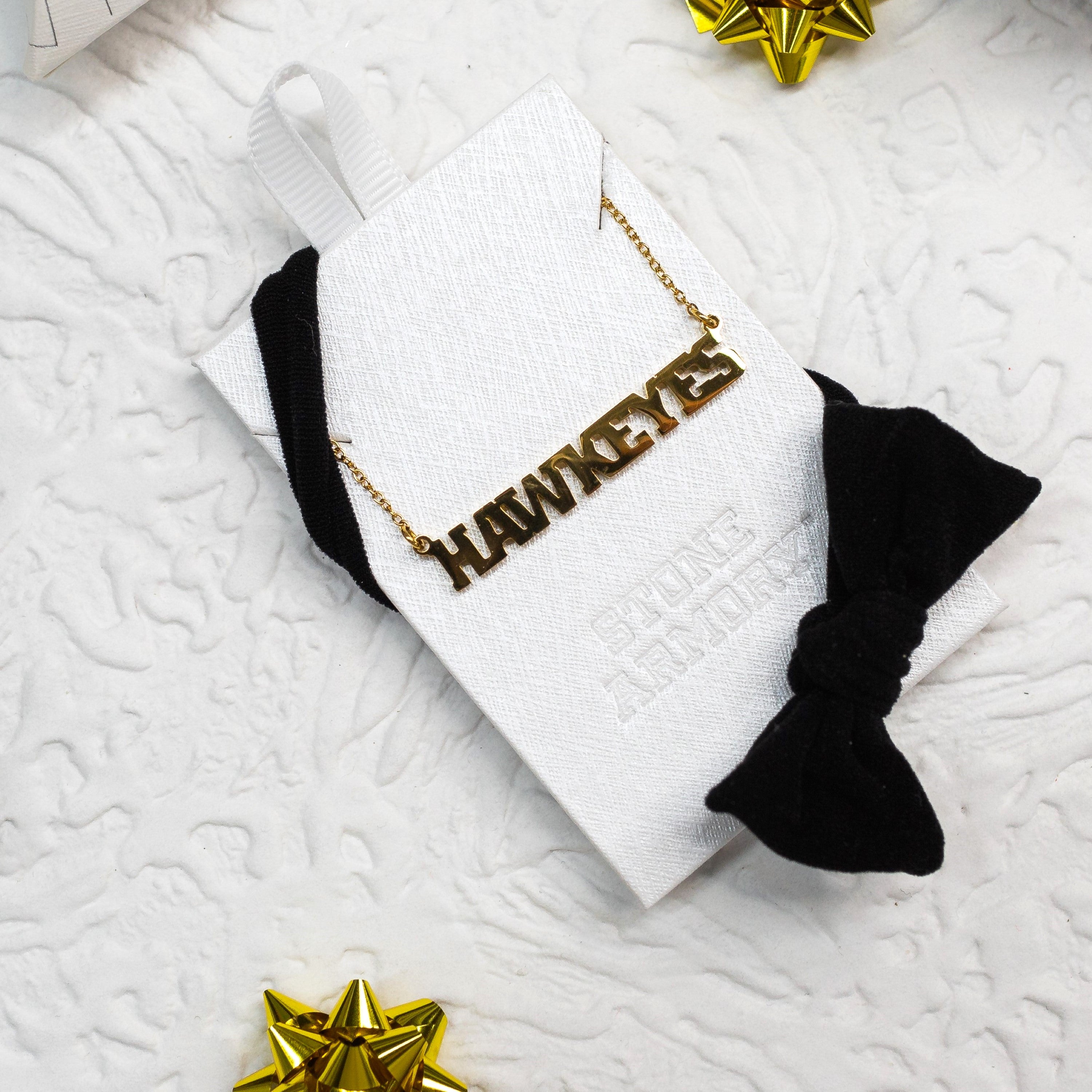 Treasure Your Iowa Hawkeyes Spirit - This Stone Armory University of Iowa gold necklace for women is full of Hawkeye pride! Featuring the word HAWKEYES in gold, this stainless steel necklace is just as unique as you. On Iowa!