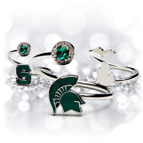 Our Michigan State Spartan Rings set is the perfect gift for any fan, student, or alumni. A Spartan helmet logo, a block S, and a state shape of Michigan are complimented by beautiful Austrian crystals on an adjustable stainless steel ring. These MSU rings wrap features adjustable sizing. Product lifetime guarantee.