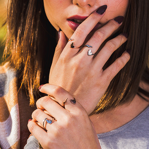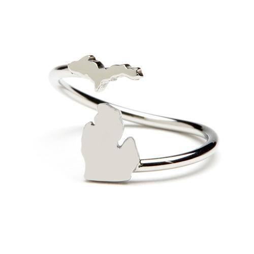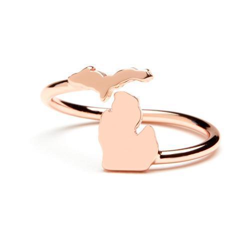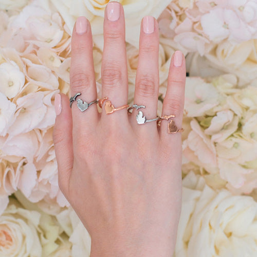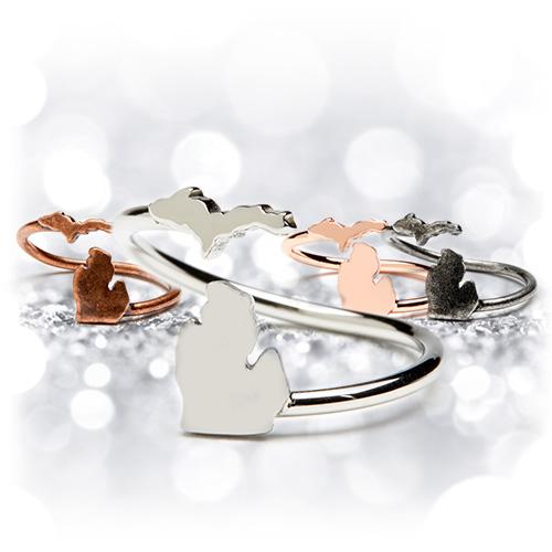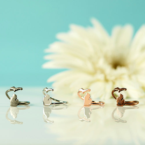 Give the gift of Michigan to yourself and three others with this 4 piece state of Michigan ring set! Each ring is adjustable to fit most ring sizes. Layer them together with other Michigan jewelry for a fun and classy look!