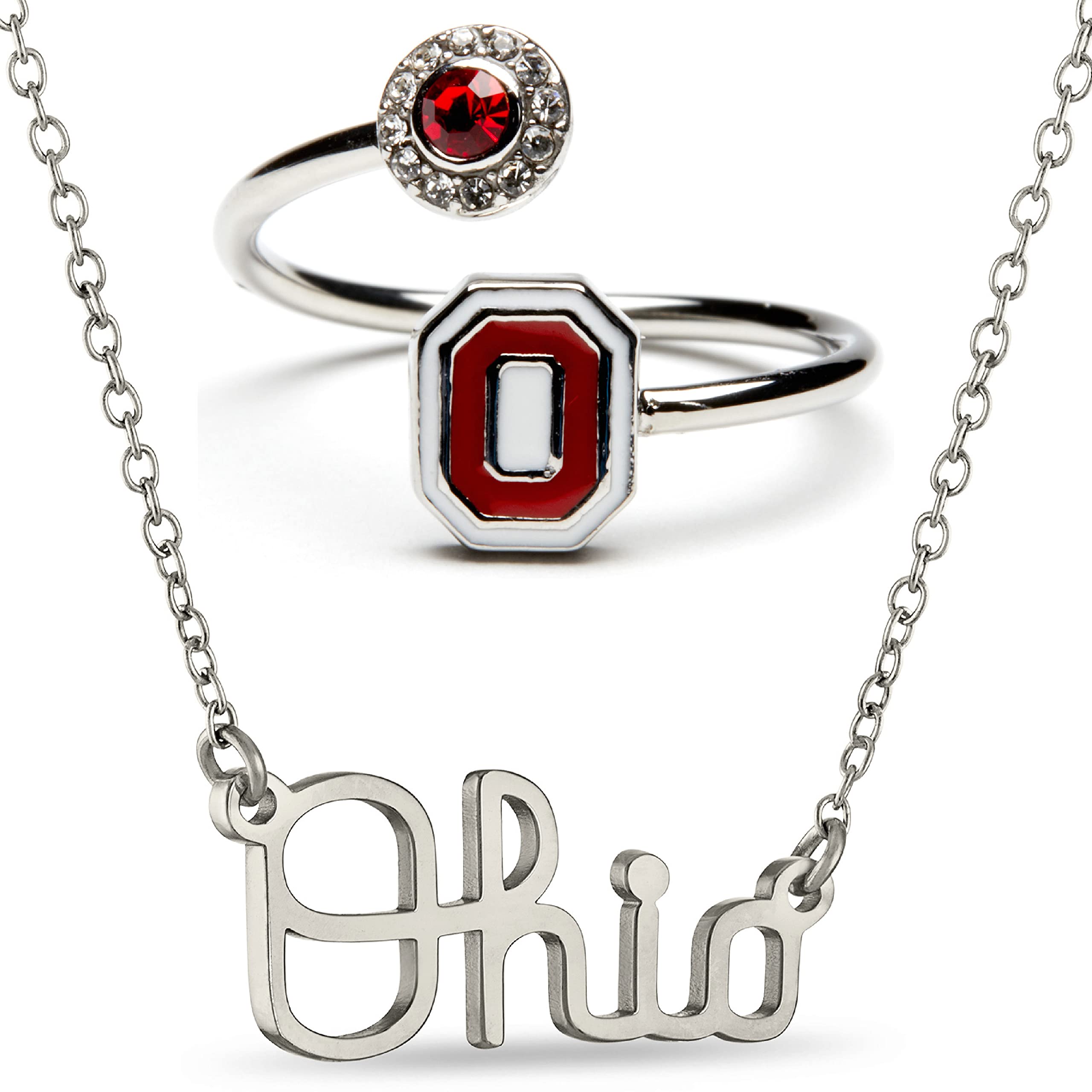 YOUR PERFECT FIT: This Ohio State University jewelry set features wrap ring and an adjustable necklace that fit most. Add this classic Ohio State ring and necklace set to your collection to show off your beloved Ohio State Buckeyes school and team! The Block O wrap ring measure adjustable from size 5-12; the Script Ohio necklace is adjustable from 16-20 inches.🌰