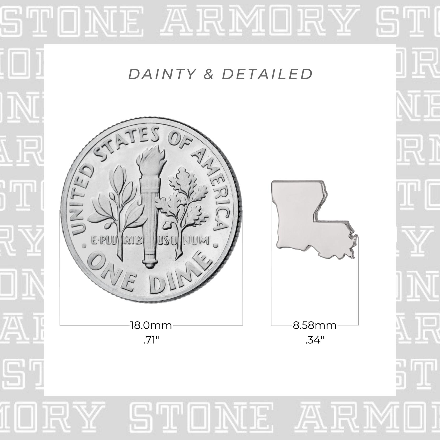 💙YOUR PERFECT FIT: These stainless steel Louisiana studs are always the perfect fit. Add these dainty stud earrings to show off your Louisiana pride! Each earring measures 8.58mm wide by 8.00mm tall.