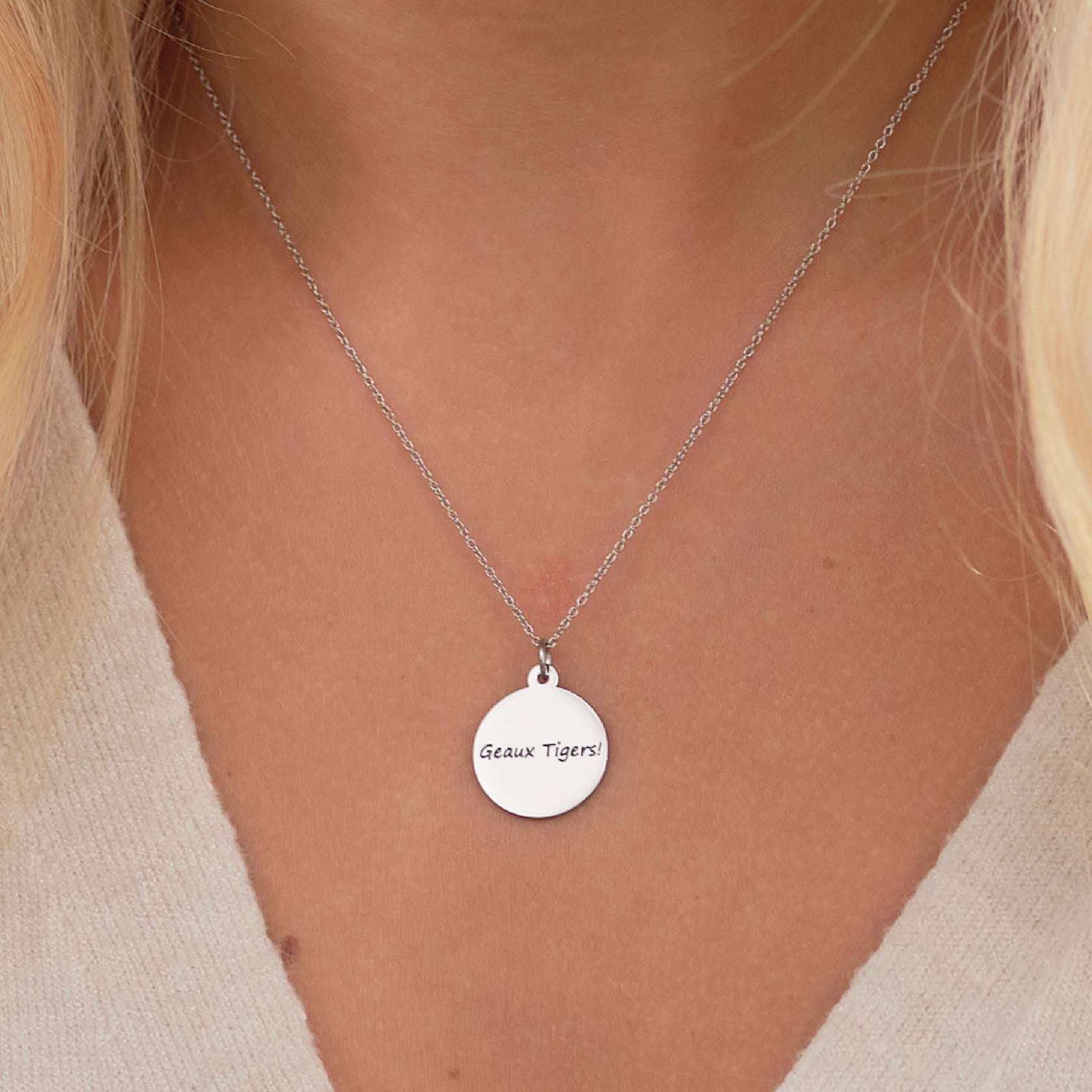 Stone Armory's LSU Spirit necklace is finally here! Gear up for the game with our beautifully designed Louisiana State University necklace, featuring a stainless steel coin pendant engraved with 'Geaux Tigers!'. Wear it to the next tailgate or around town to show off your LSU Tiger pride. This adjustable LSU necklace would also make the perfect LSU gift for your favorite LSU Tigers fan! Stone Armory's Louisiana State University jewelry is made of stainless steel and is adjustable in size, making this NCAA LSU necklace the perfect gift to celebrate LSU graduation, birthdays, Mother's Day, first day of school, the first game, or for everyday fan wear. Thank you for supporting our small business!