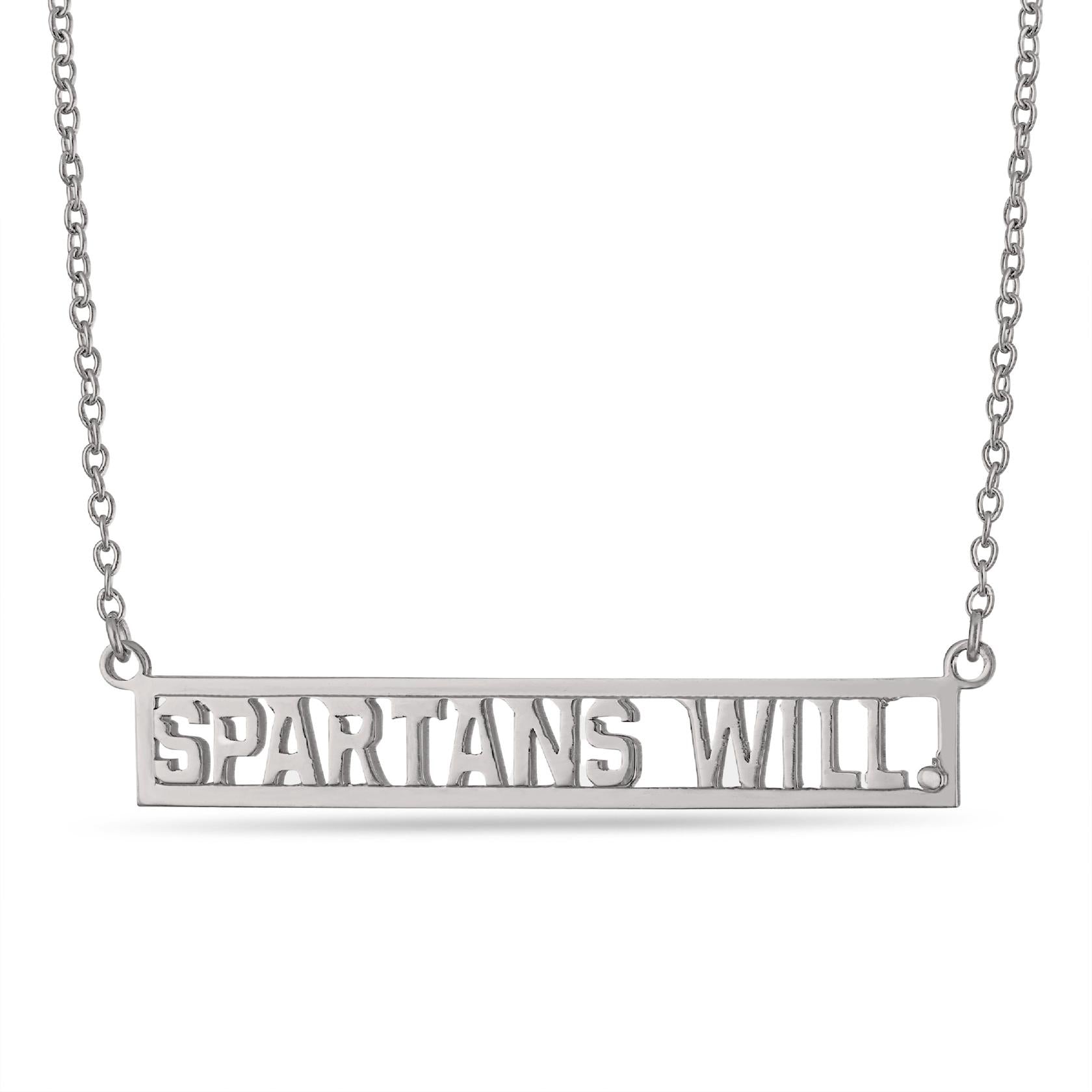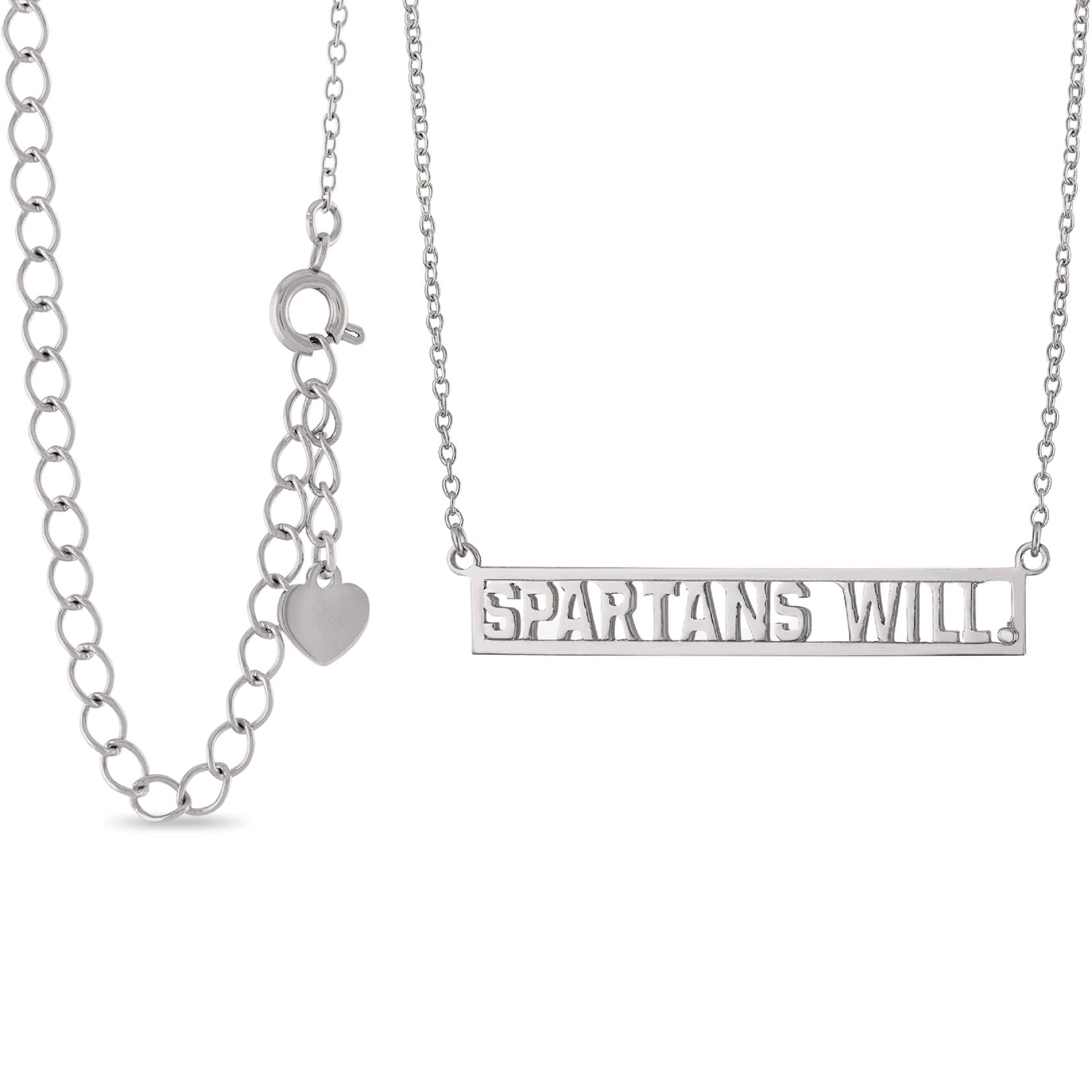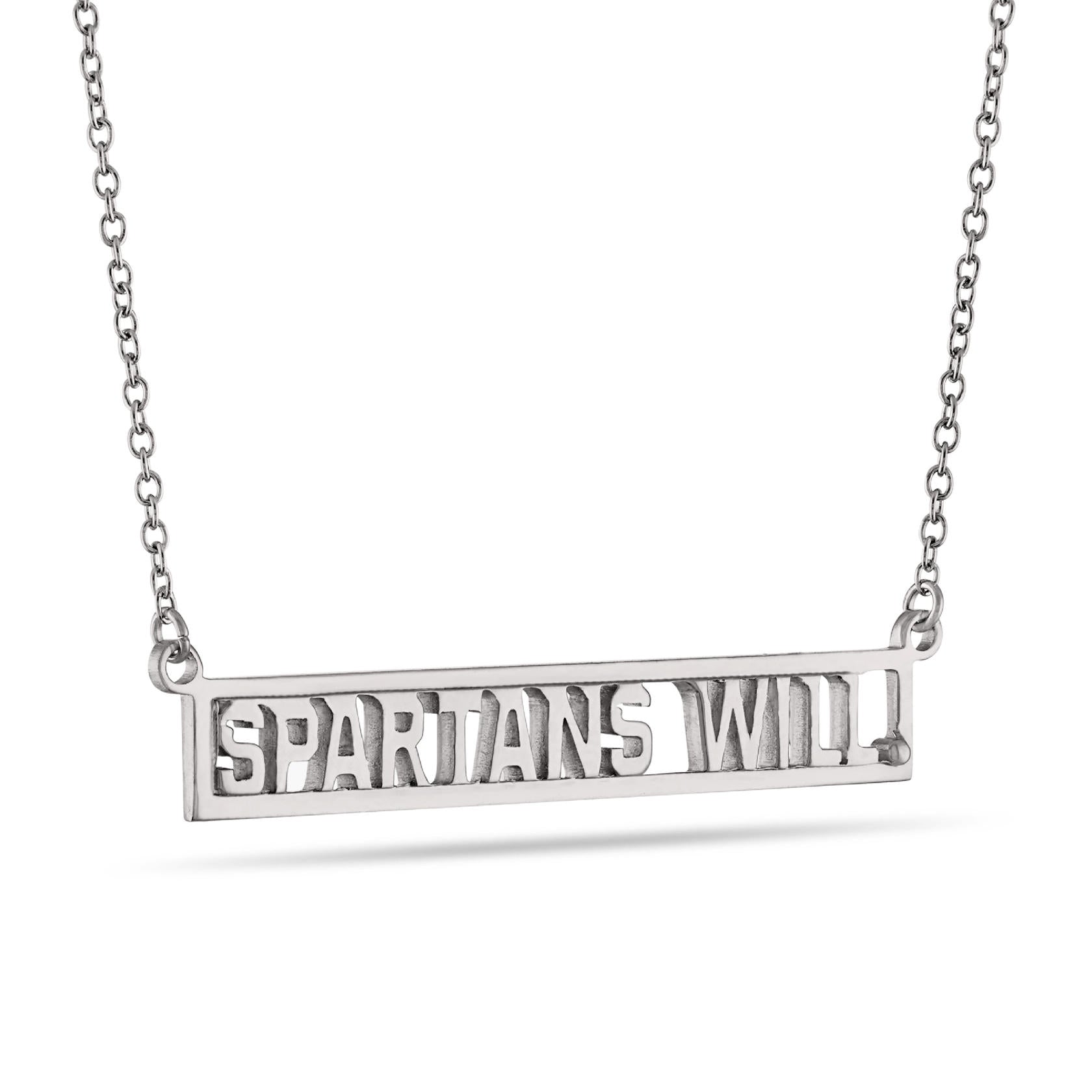 YOUR PERFECT FIT: This stainless steel Michigan State necklace is adjustable in size, with a chain that adjusts between 16-20 inches. Add this classic Michigan State necklace to show off your beloved Michigan State Spartans school and team. The SPARTANS WILL. lettering measures 6.15mm tall by 39.00mm wide.