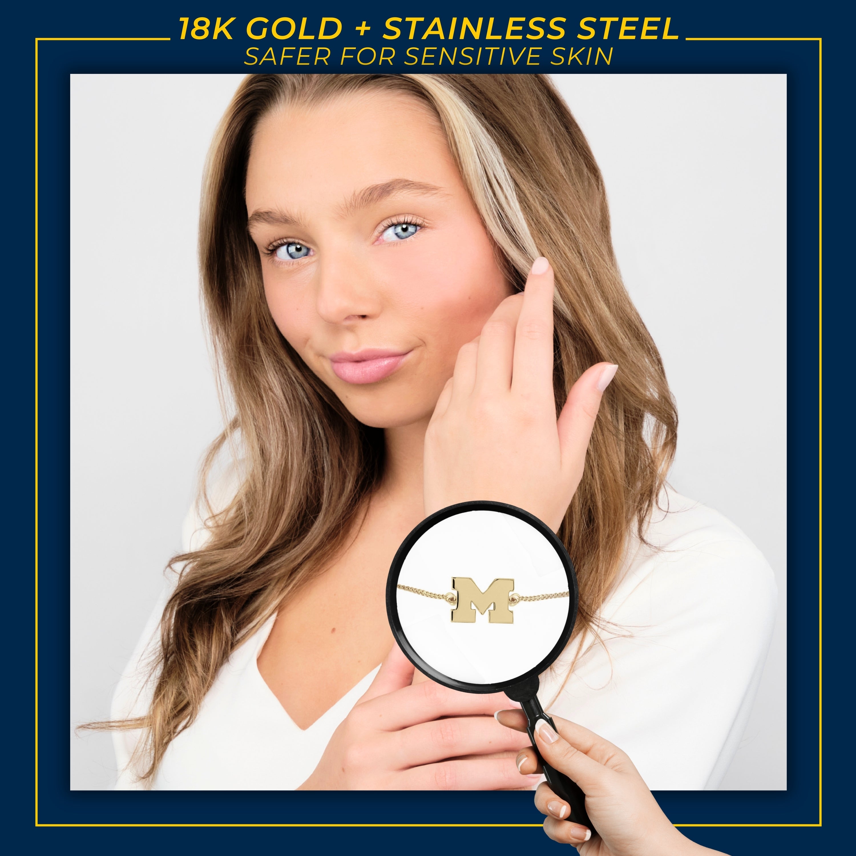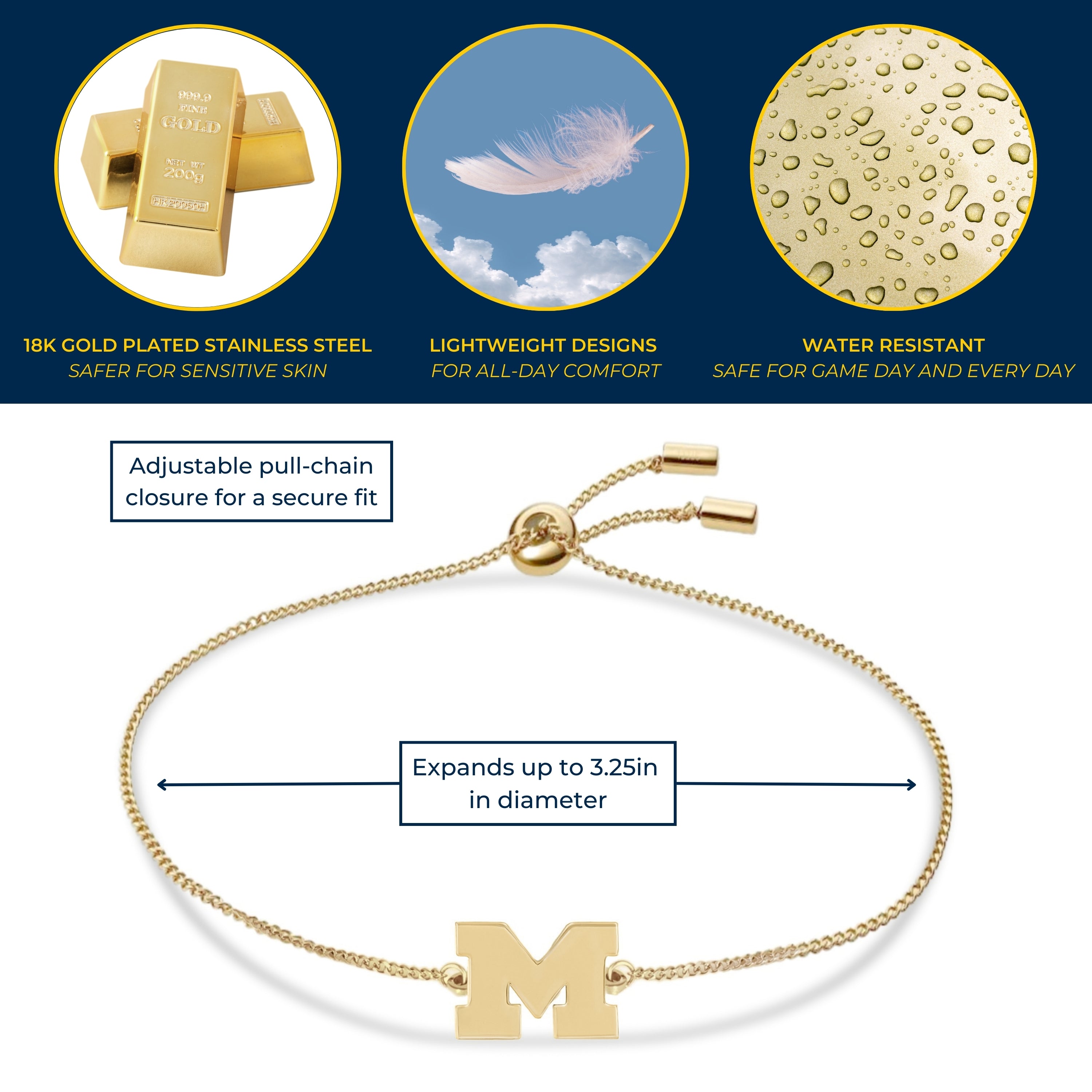 Stone Armory's Michigan gold block M pull chain bracelet is finally here! Gear up for the game with our beautifully designed University of Michigan bracelet, an adjustable bolo bracelet featuring a classically crafted block M. Wear it to the next tailgate or around town to show off your Michigan Wolverine pride! This adjustable UM pull chain bracelet would also make the perfect Michigan gift for your favorite Michigan football fan! Stone Armory's Michigan Wolverines accessories are made of stainless steel + 18K gold and is adjustable in size, making this NCAA Michigan bracelet the perfect gift to celebrate Michigan graduation, birthdays, Mother's Day, first day of school, the first game, or for everyday fan wear. Thank you for supporting our small business!