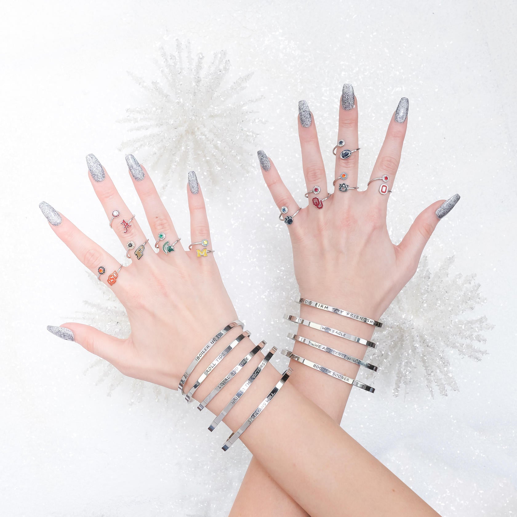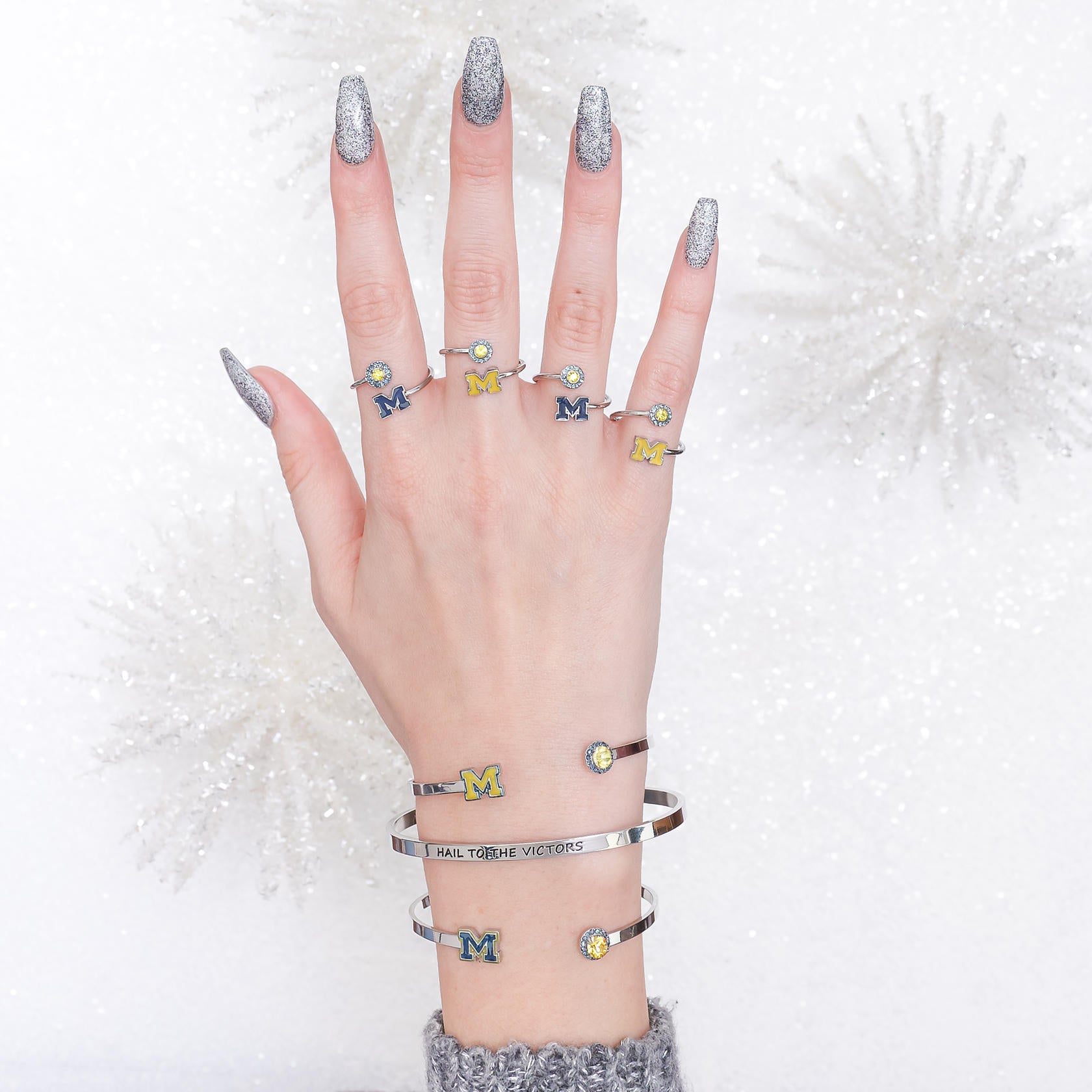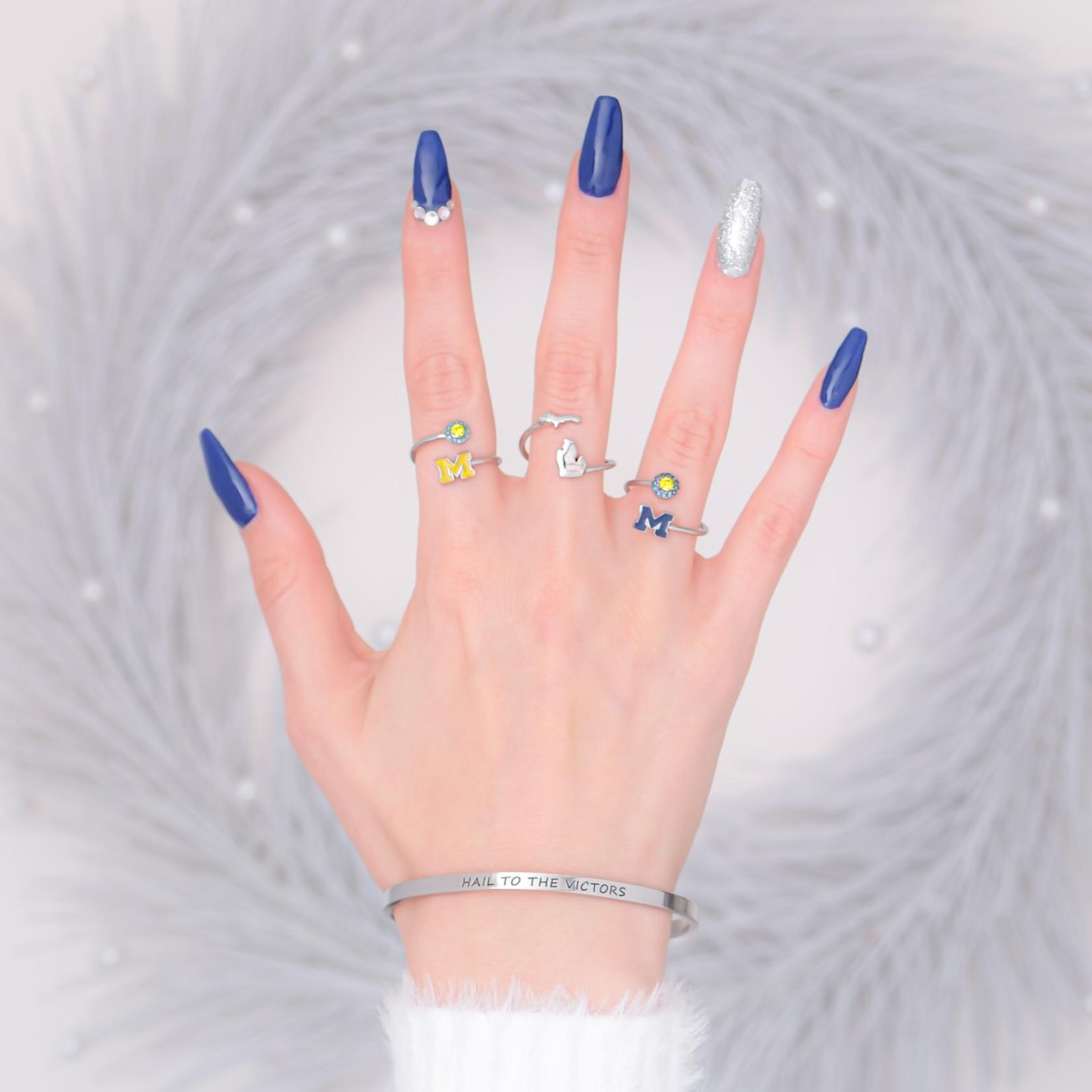 Stone Armory's Michigan Spirit bangle is finally here! Gear up for the game with our beautifully designed University of Michigan bracelet, a stainless steel open bangle engraved with 'Hail to the Victors'. Wear it to the next tailgate or around town to show off your Michigan Wolverine pride. This adjustable UM bangle would also make the perfect Michigan gift for your favorite Michigan Wolverines fan! Stone Armory's University of Michigan jewelry is made of stainless steel and is adjustable in size, making this NCAA Michigan bangle the perfect gift to celebrate Michigan graduation, birthdays, Mother's Day, first day of school, the first game, or for everyday fan wear. Thank you for supporting our small business!