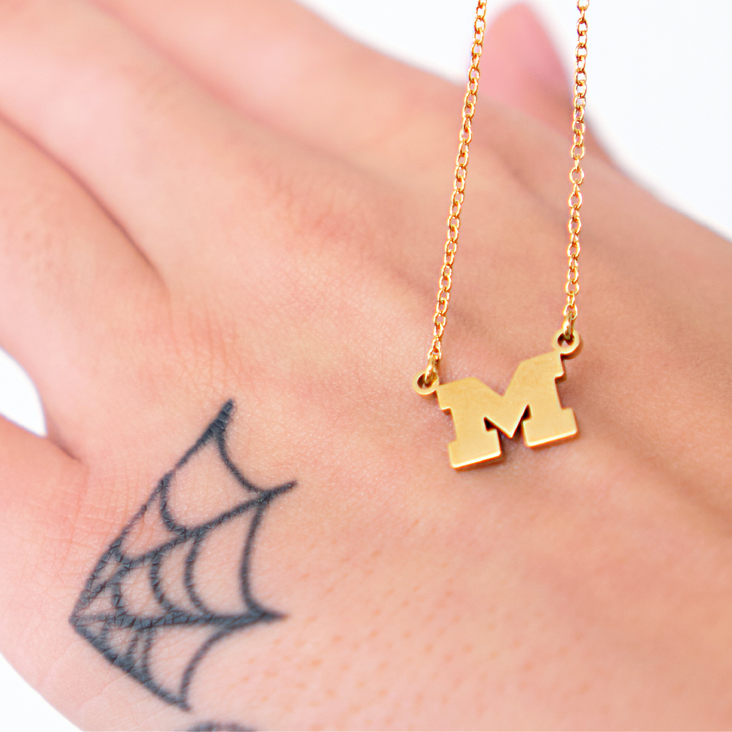Stone Armory's Michigan Block M gold jewelry set is finally here! Gear up for game day with our beautifully designed and combined University of Michigan earring and necklace set, featuring block M gold plated earrings and a matching block M gold plated necklace. Wear it to the next Michigan football game or around town to show off your Michigan Wolverine pride! This UM jewelry set would also make the perfect Michigan gift for your favorite Wolverines fan. Stone Armory's University of Michigan jewelry is carefully crafted to last out of premium 18K gold and durable stainless steel, making this NCAA Michigan gold jewelry set the perfect gift to celebrate Michigan graduation, birthdays, Mother's Day, the first day of school, the first game, or for everyday fan wear. Thank you for supporting our small business!