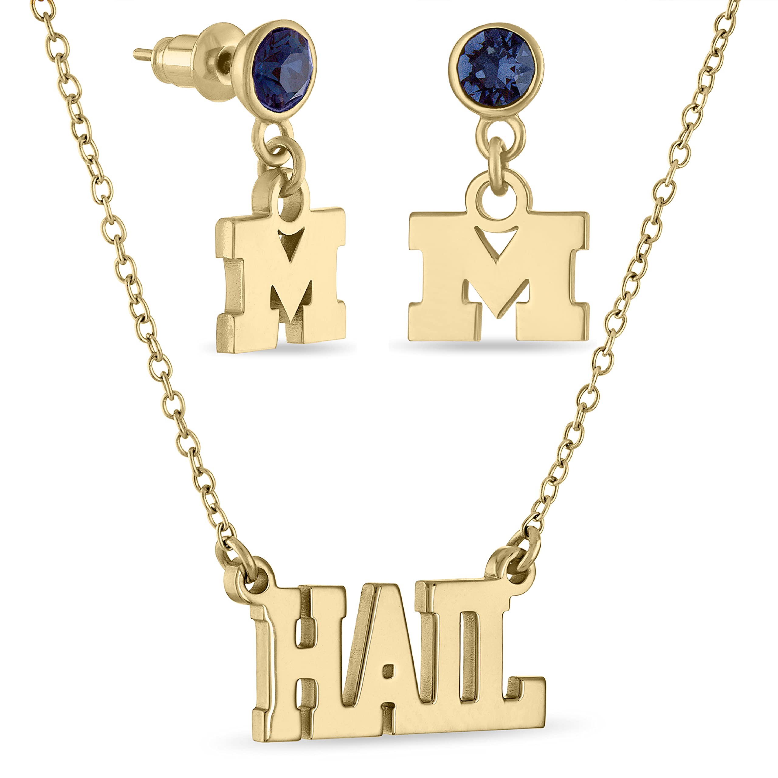 YOUR PERFECT FIT: This University of Michigan jewelry set features crystal drop earrings and an adjustable necklace that fit most. Add this classic Michigan earring and necklace set to your collection to show off your beloved Michigan Wolverines school and team! The block M crystal drop earrings measure 10.5mm wide x 19.0mm long; the HAIL necklace is adjustable from 16-20 inches.💛