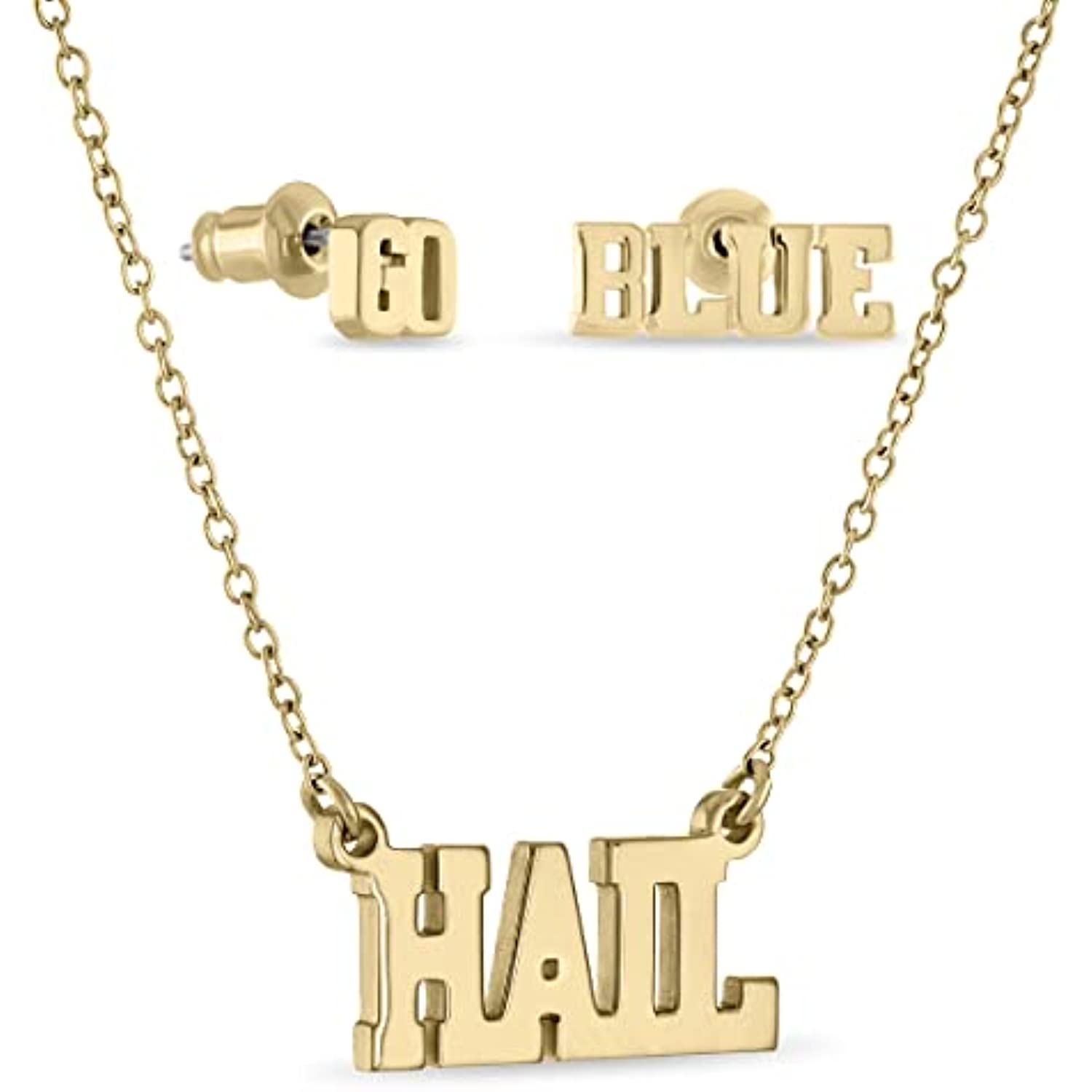• Your Perfect Fit - These University of Michigan stud earrings and adjustable necklace are always the perfect fit! Show off your beloved Michigan football team and school with this simple yet elegant gold jewelry set. The GO BLUE earrings measure 6.36mm (GO), 14.00mm (BLUE) wide x 5.08mm tall; the HAIL necklace is adjustable from 16-20 inches.