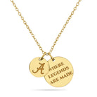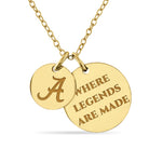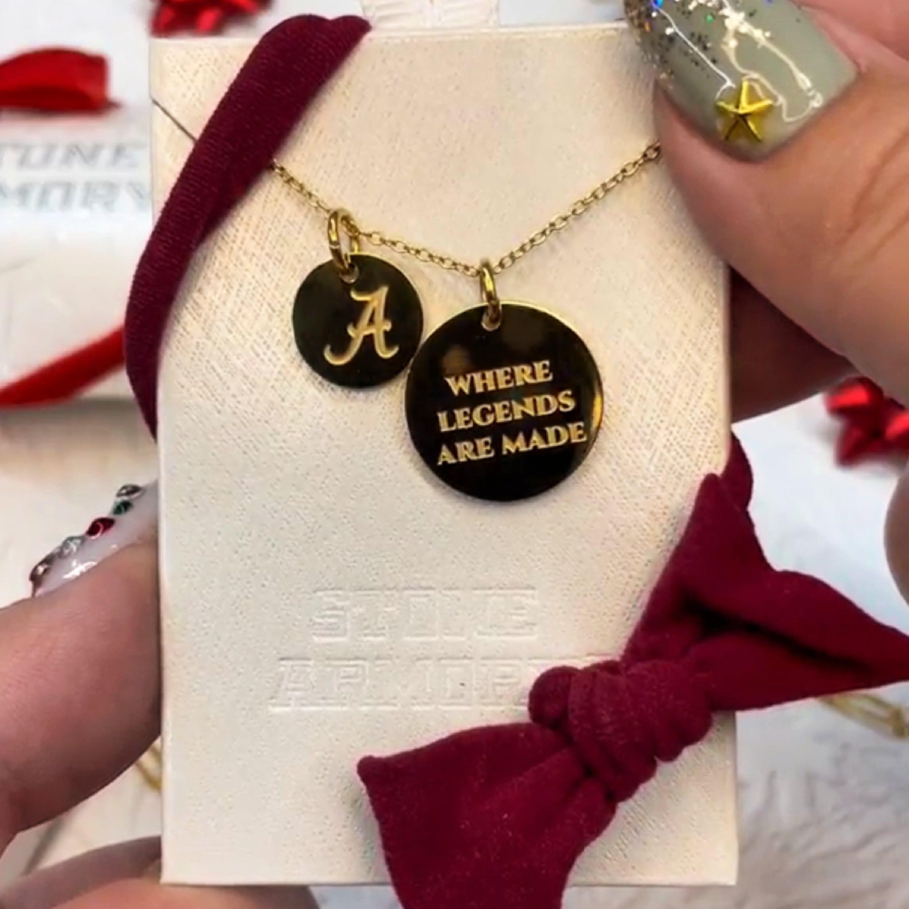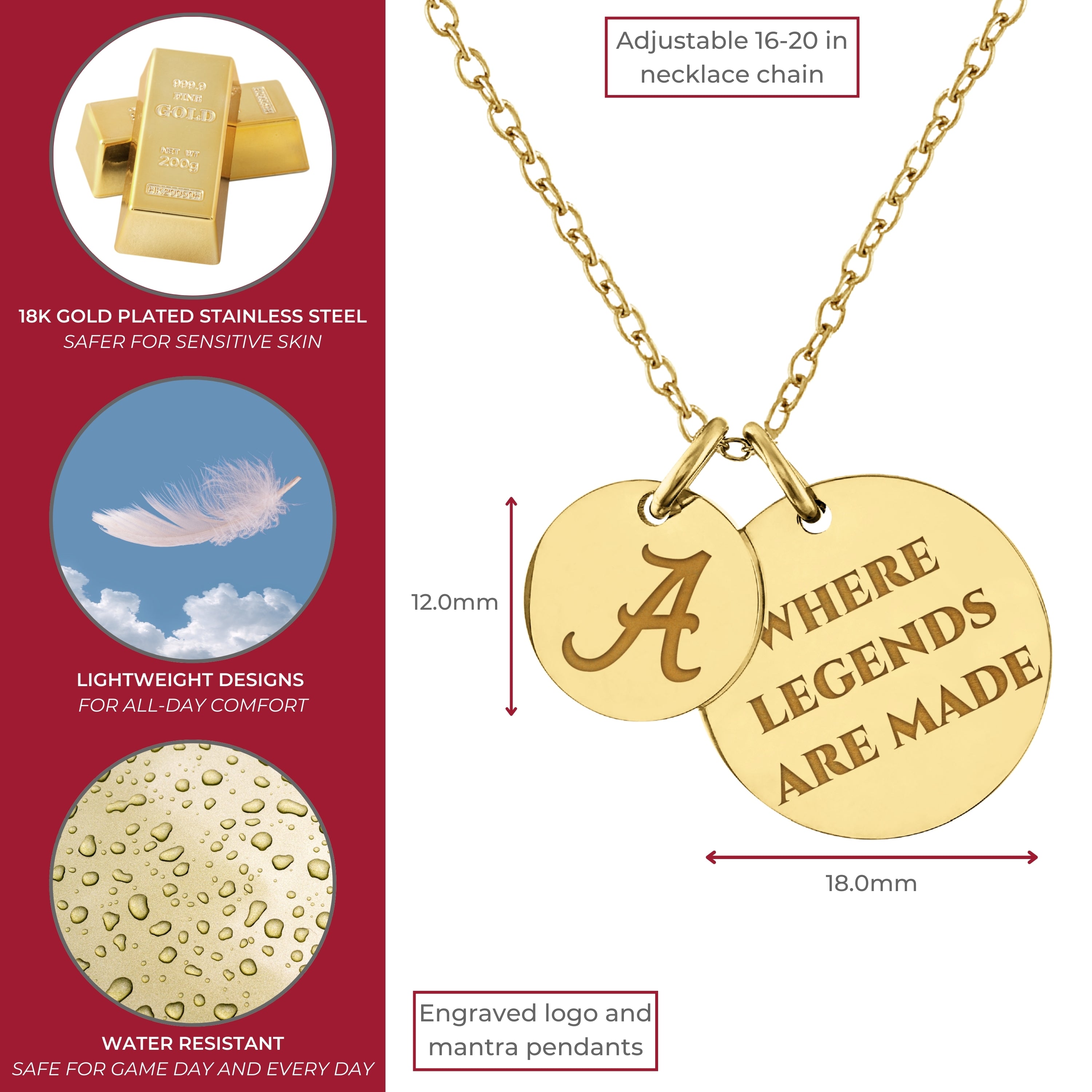 Proudly display your Alabama Crimson Tide pride with this officially licensed Alabama necklace, featuring two gold-plated pendants engraved with the iconic Alabama A and the inspiring mantra, 'Where Legends Are Made This pendant necklace, made from surgical-grade stainless steel and coated in 18K gold, offers both durability and elegance. Its adjustable length (16-20 inches) makes it perfect for everyday wear or Alabama game day. Whether you're attending a game or gifting it for a special occasion, this necklace is ideal for Alabama fans, students, and alumni. It makes a thoughtful present for birthdays, Mother’s Day, graduations, Christmas, any other celebration. Packaged simply yet beautifully, this necklace arrives ready for gifting, ensuring it will delight any Alabama fan