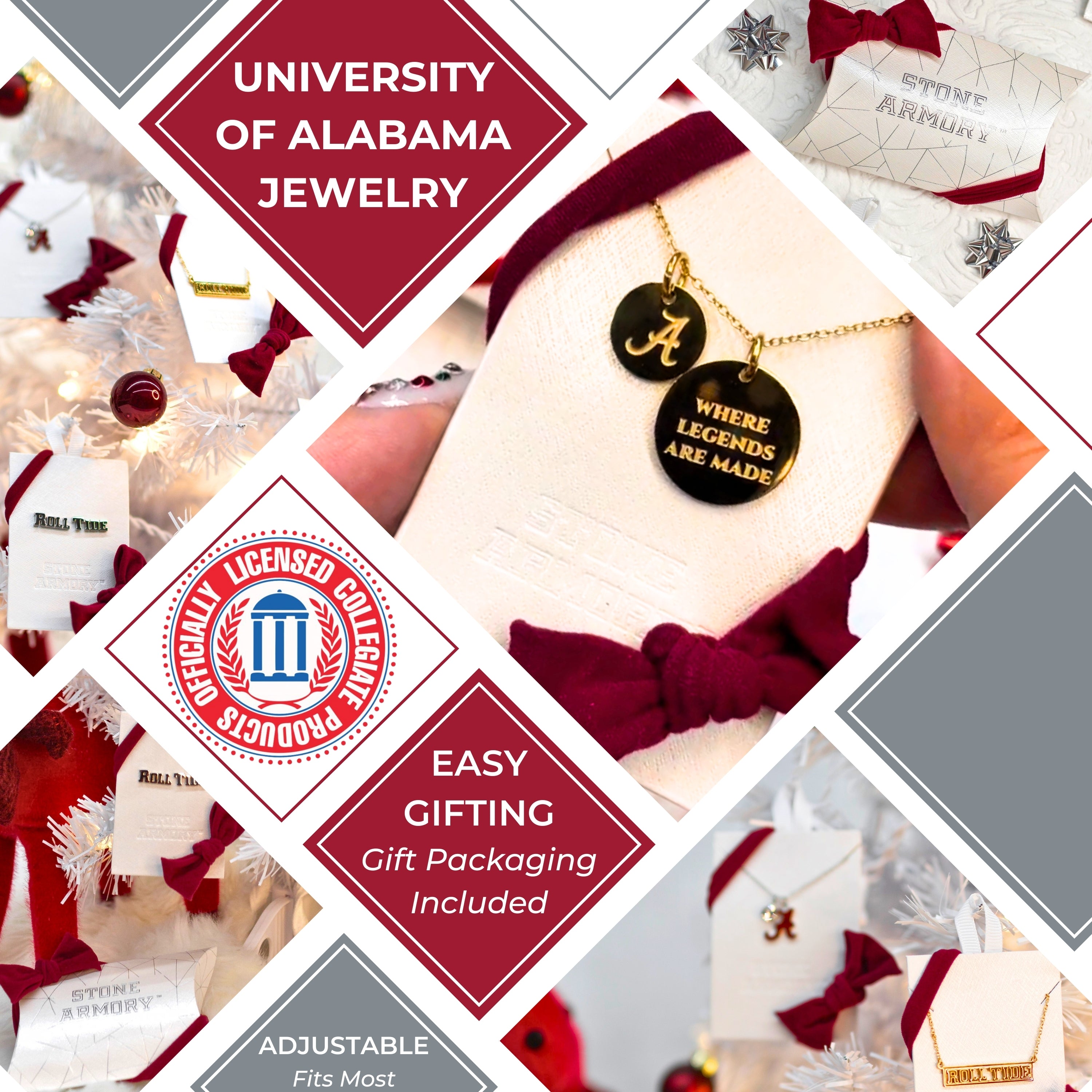Express Your Alabama Crimson Tide Spirit Every Day: This officially licensed Stone Armory University of Alabama necklace features 18K gold-plated pendants engraved with the iconic Alabama A and the mantra 'Where Legends Are Made.' Designed for both casual and game-day wear, this adjustable necklace (16-20 inches) makes the perfect gift for Alabama fans, students, and alumni