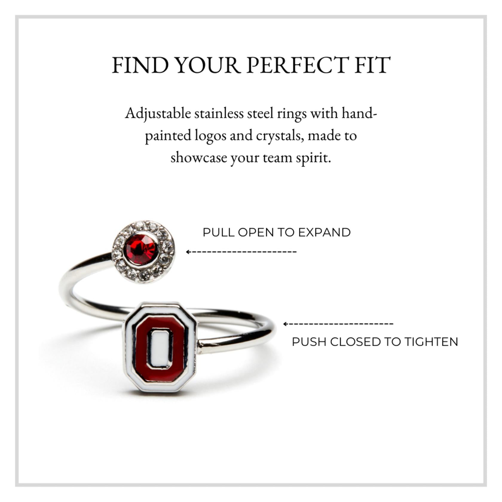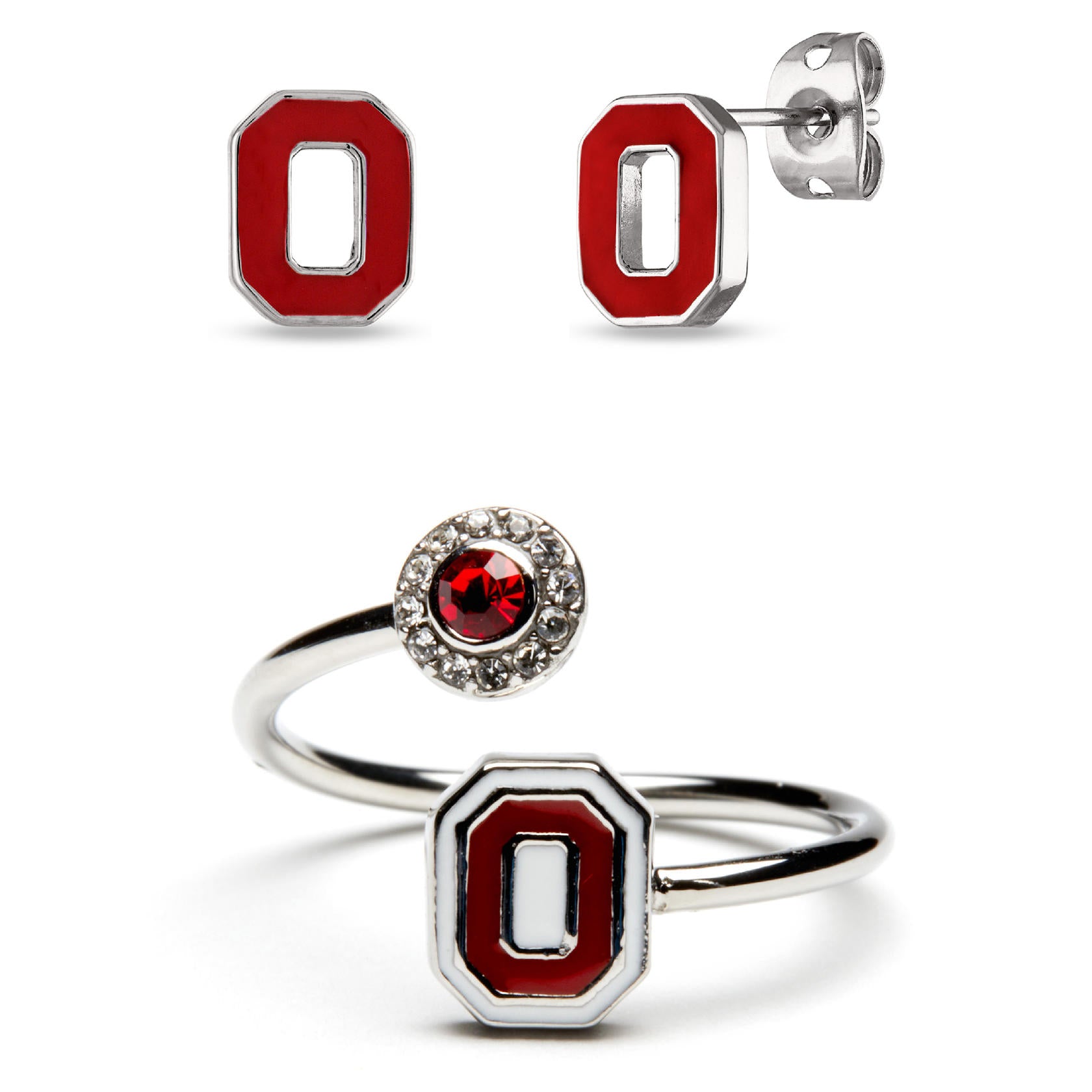 - YOUR PERFECT FIT: This Ohio State University jewelry set features stud earrings and an adjustable wrap ring that fit most. Add this classic Ohio State ring and earring set to your collection to show off your beloved Ohio State Buckeyes school and team! The Block O stud earrings measure 6.62mm wide x 8.51mm tall; the Block O wrap ring is adjustable from size 5-12.🤍