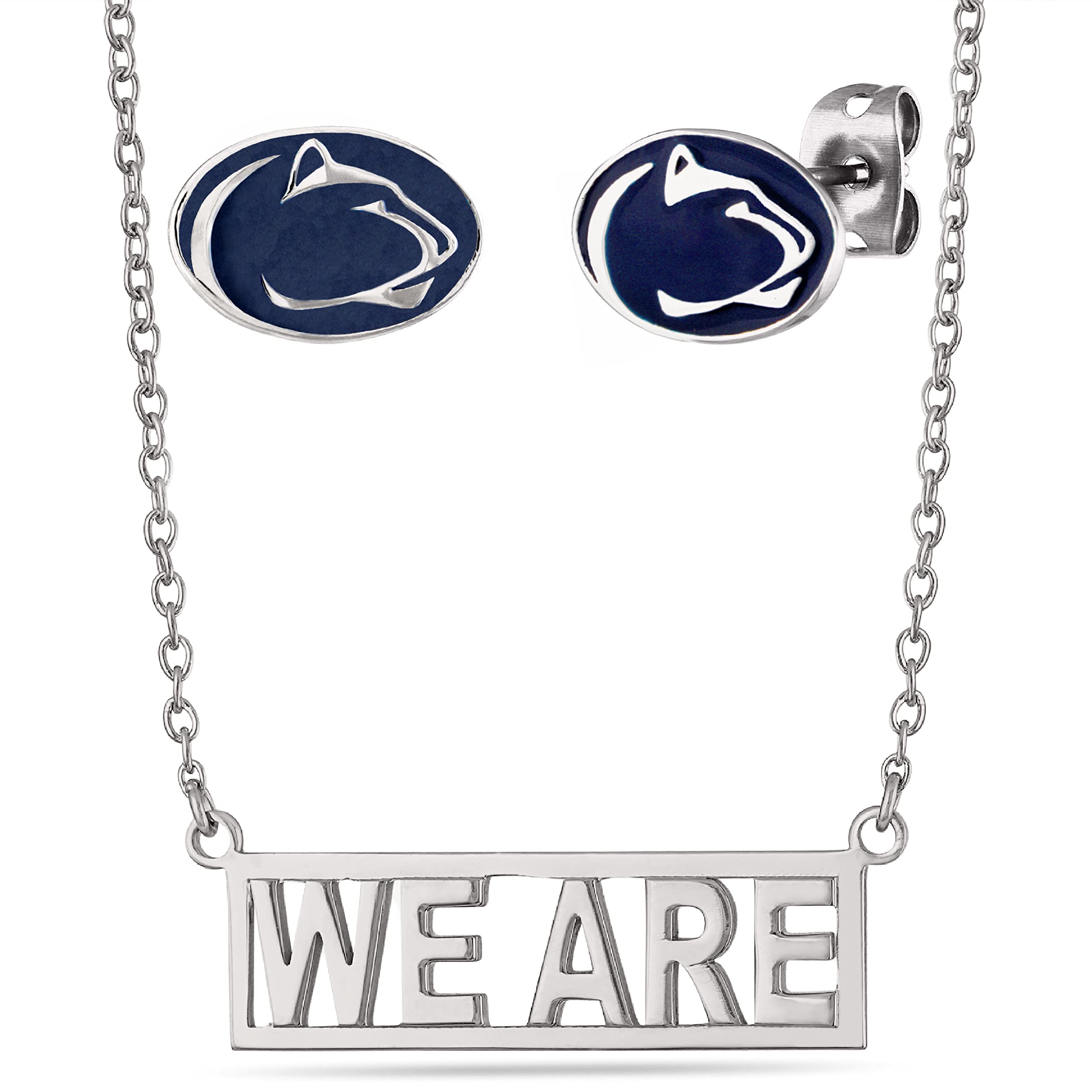 YOUR PERFECT FIT: This Pennsylvania State University jewelry set features stud earrings and an adjustable necklace that fit most. Add this classic Penn State earring and necklace set to your collection to show off your beloved Penn State Nittany Lions school and team! The Nittany Lion stud earrings measure 11.0mm wide x 8.0mm tall; the WE ARE necklace is adjustable from 16-20 inches.