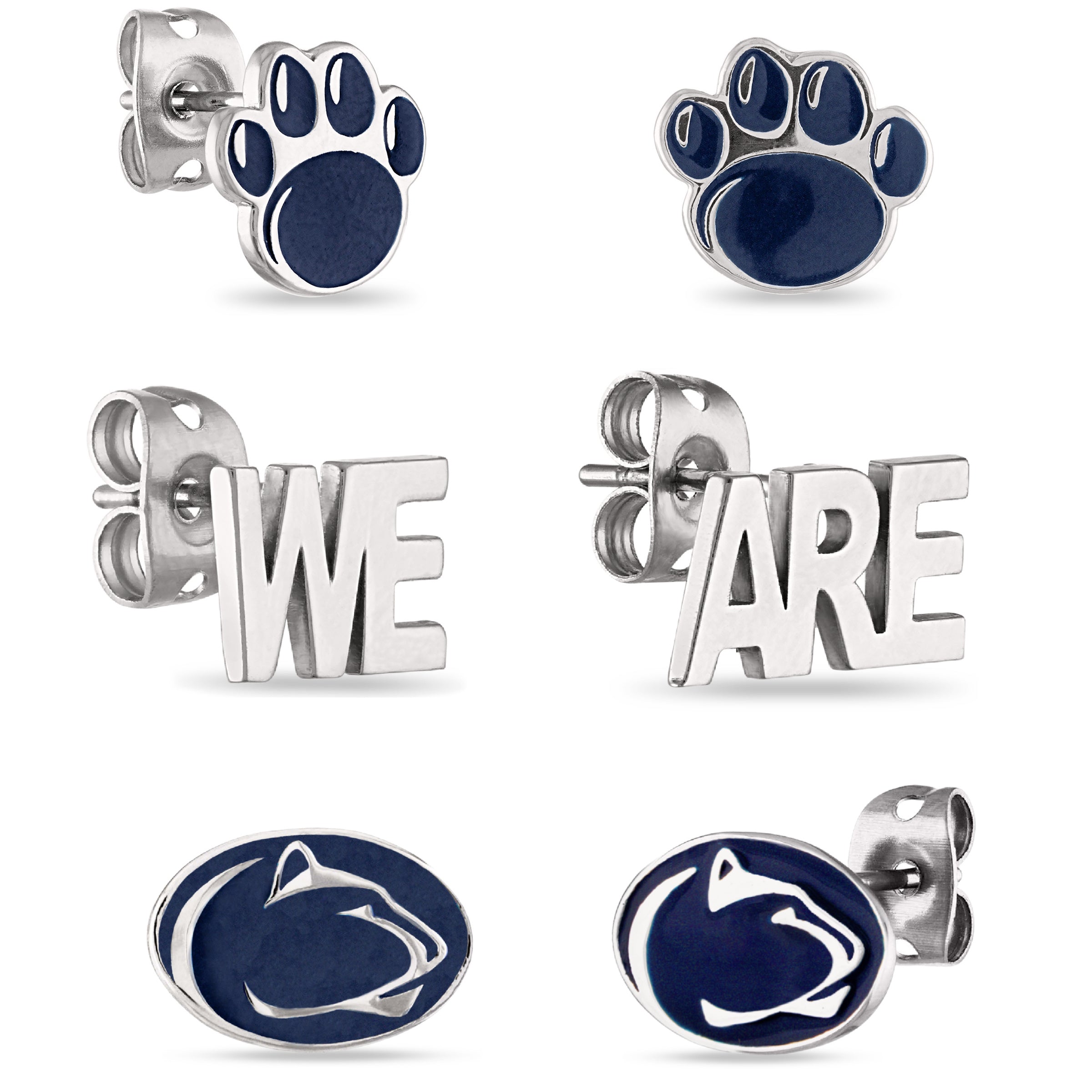 Stone Armory's Penn State mix-n-match three pair earring set is finally here! Gear up for the game with our beautifully designed and combined Pennsylvania State University earring set, featuring classic Nittany Lion stud earrings, Lion paw stud earrings, and cute and dainty WE ARE script stud earrings. Wear it to your next tailgate or around town to show off your Penn State Lion pride! This Penn State jewelry set would also make the perfect Penn State gift for your favorite Nittany Lions fan. Stone Armory's Pennsylvania State University jewelry is made of stainless steel and carefully crafted, making this NCAA Penn State earring set the perfect gift to celebrate Penn State graduation, birthdays, Mother's Day, the first day of school, the first game, or for everyday fan wear. Thank you for supporting our small business!