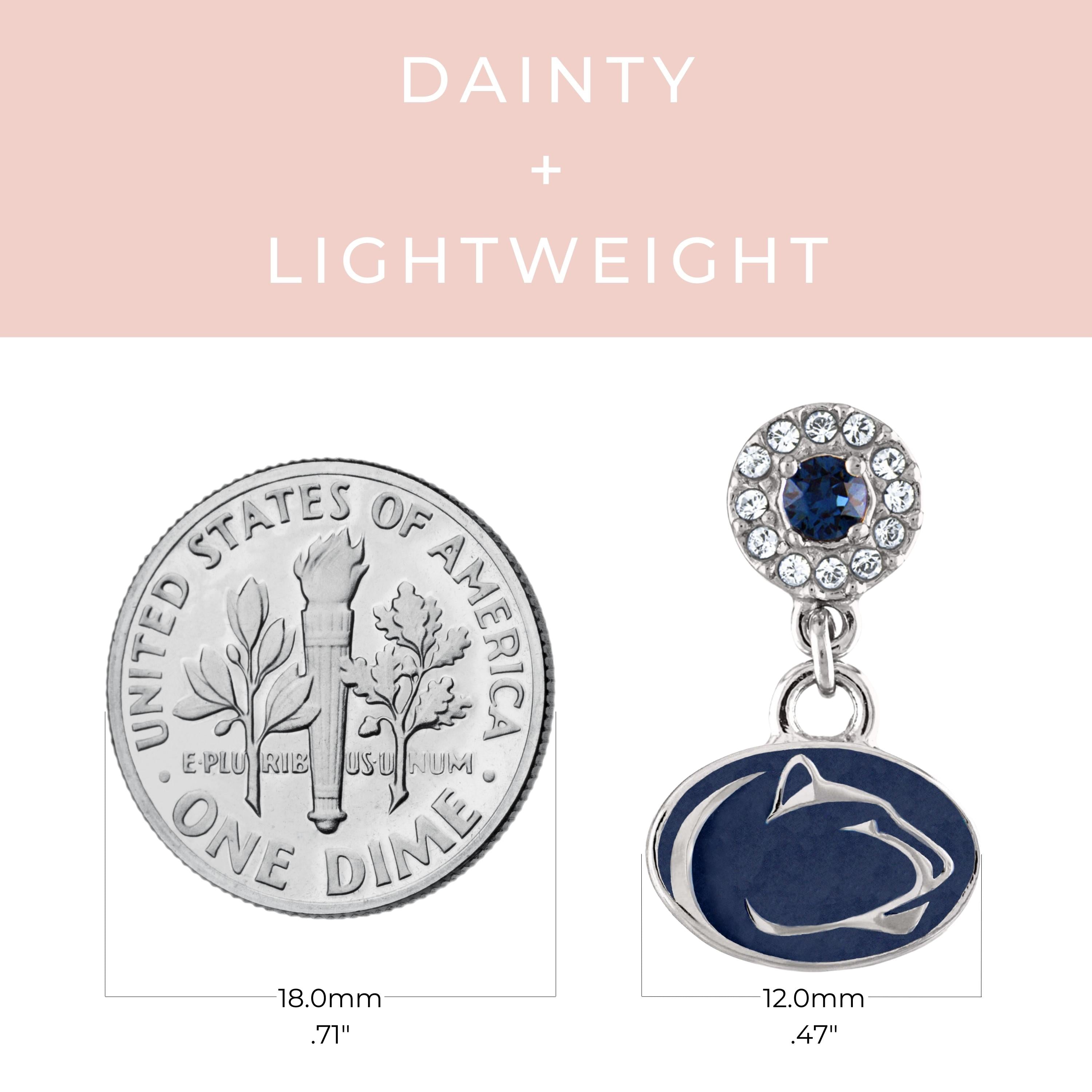 💙YOUR PERFECT FIT: These stainless steel Penn State drop earrings are always the perfect fit. Add these sparkling, classic drop earrings to show off your beloved Penn State Nittany Lions school and team. These Penn State earrings measure 18.4mm long by 11.3mm wide.