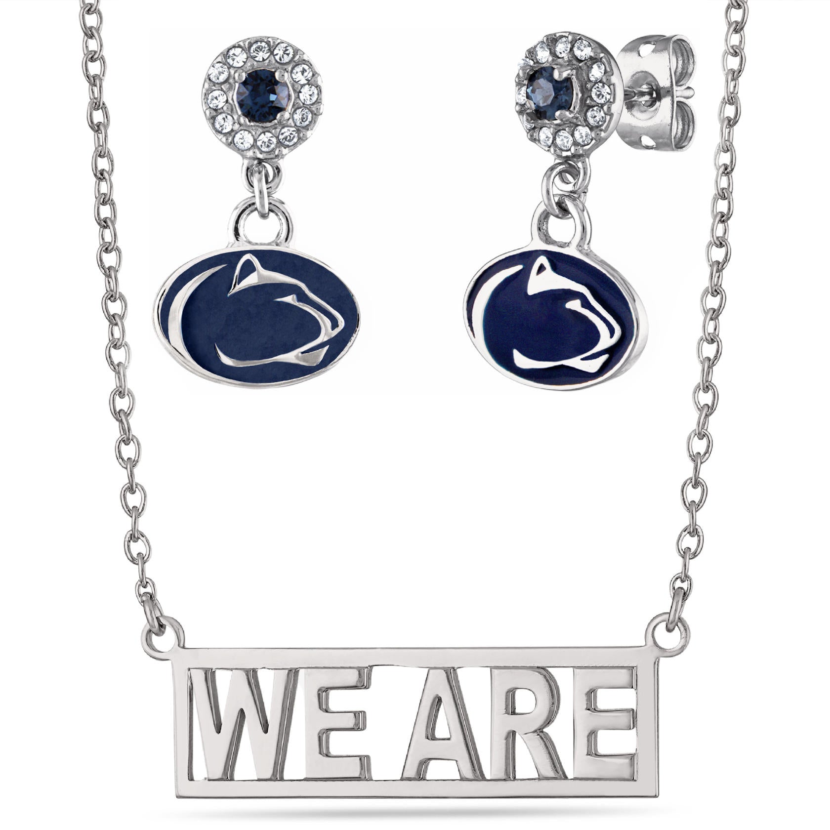 YOUR PERFECT FIT: This Pennsylvania State University jewelry set features crystal drop earrings and an adjustable necklace that fit most. Add this classic Penn State earring and necklace set to your collection to show off your beloved Penn State Nittany Lions school and team! The Nittany Lion crystal drop earrings measure 11.3mm wide x 18.4mm long; the WE ARE necklace is adjustable from 16-20 inches.