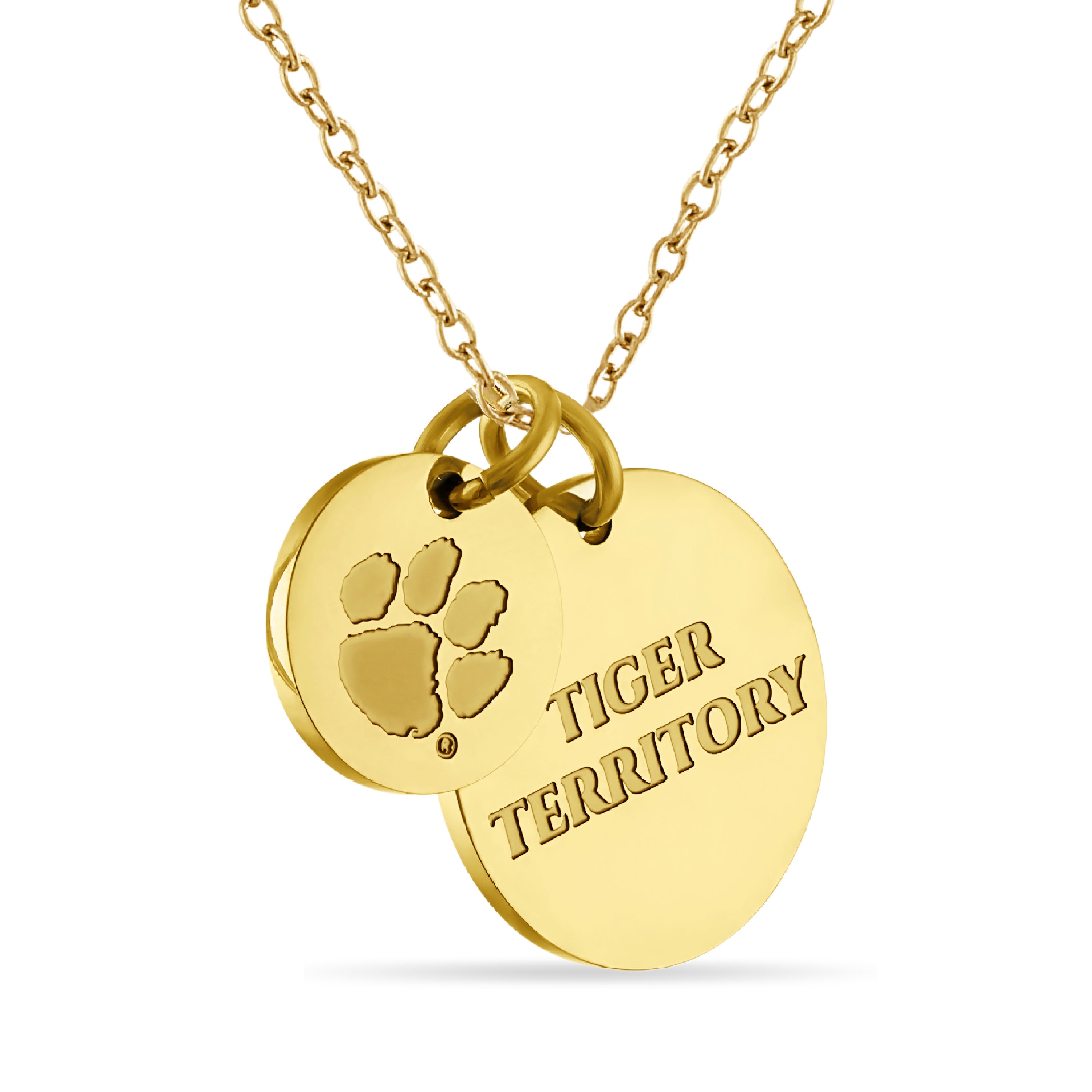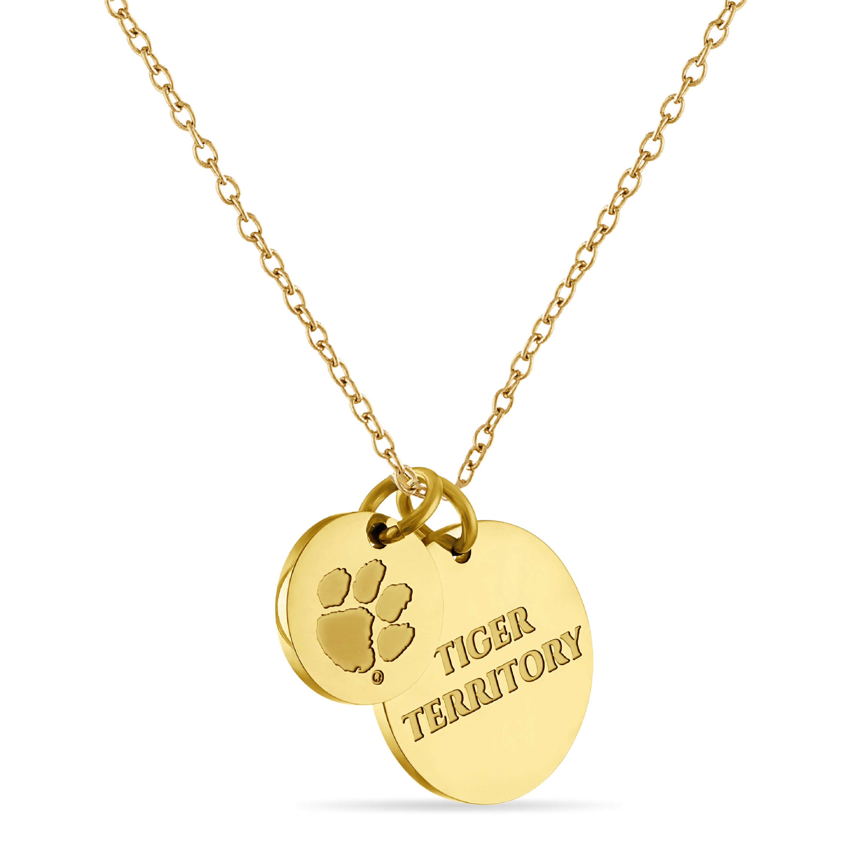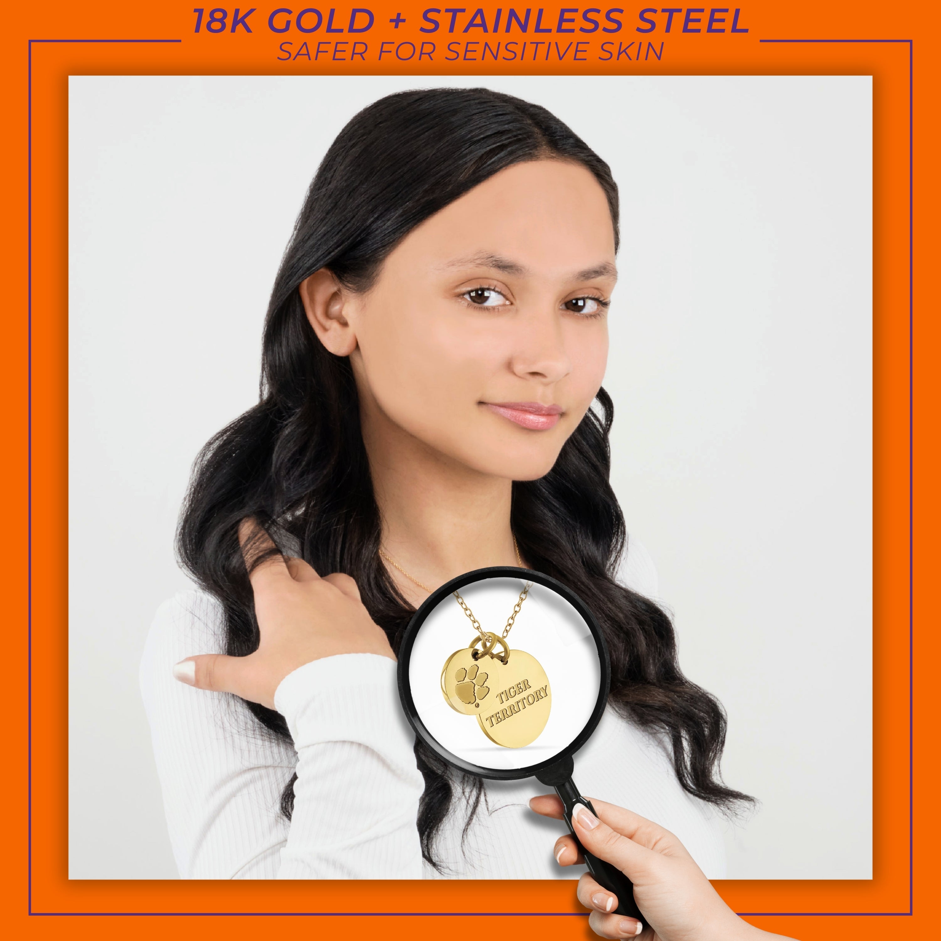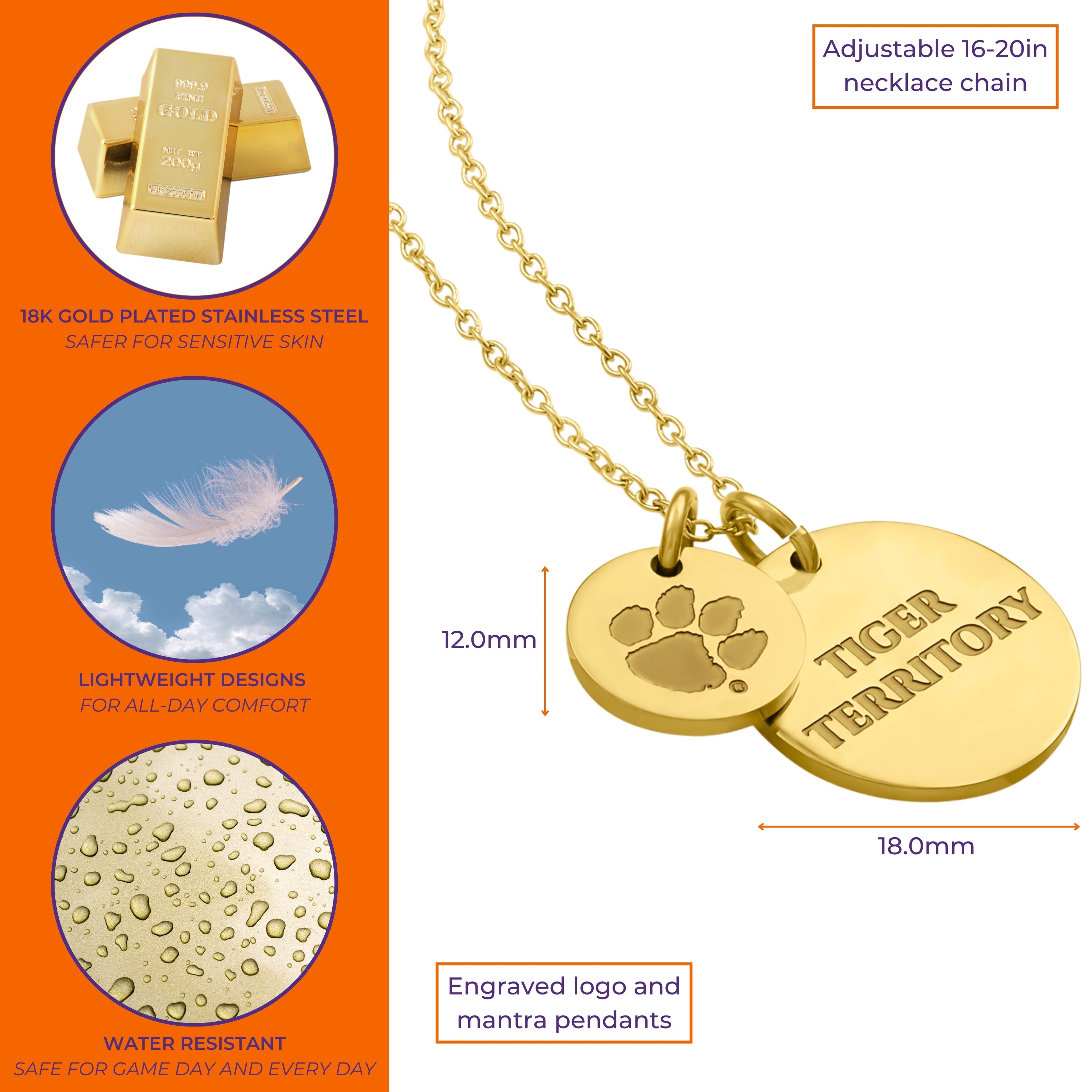 Proudly display your Clemson Tigers pride with this officially licensed Clemson necklace, featuring two gold-plated pendants engraved with the iconic Tiger Paw and the inspiring mantra, 'Tiger Territory This pendant necklace, made from surgical-grade stainless steel and coated in 18K gold, offers both durability and elegance. Its adjustable length (16-20 inches) makes it perfect for everyday wear or Clemson game day. Whether you're attending a game or gifting it for a special occasion, this necklace is ideal for Clemson fans, students, and alumni. It makes a thoughtful present for birthdays, Mother’s Day, graduations, Christmas, any other celebration. Packaged simply yet beautifully, this necklace arrives ready for gifting, ensuring it will delight any Clemson fan