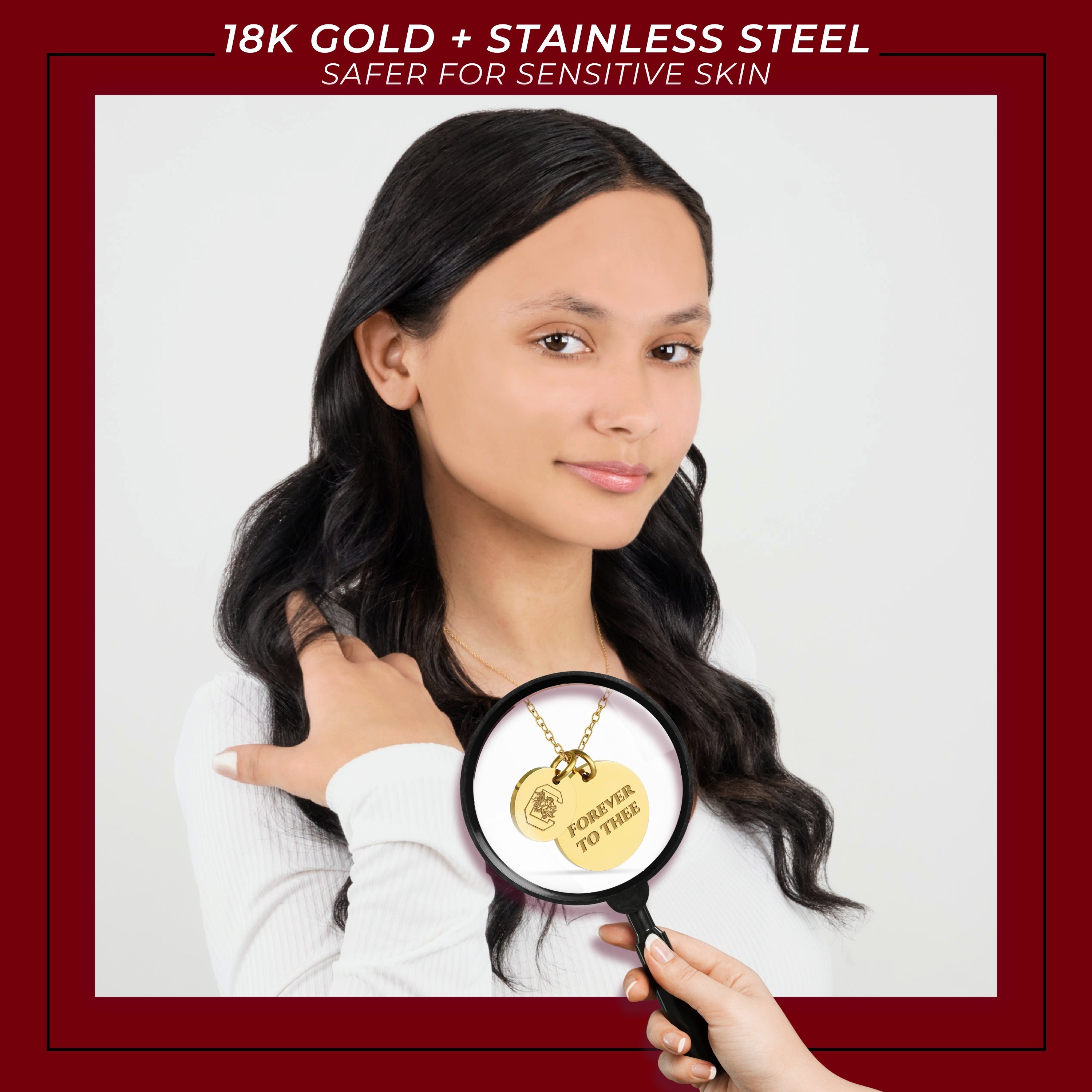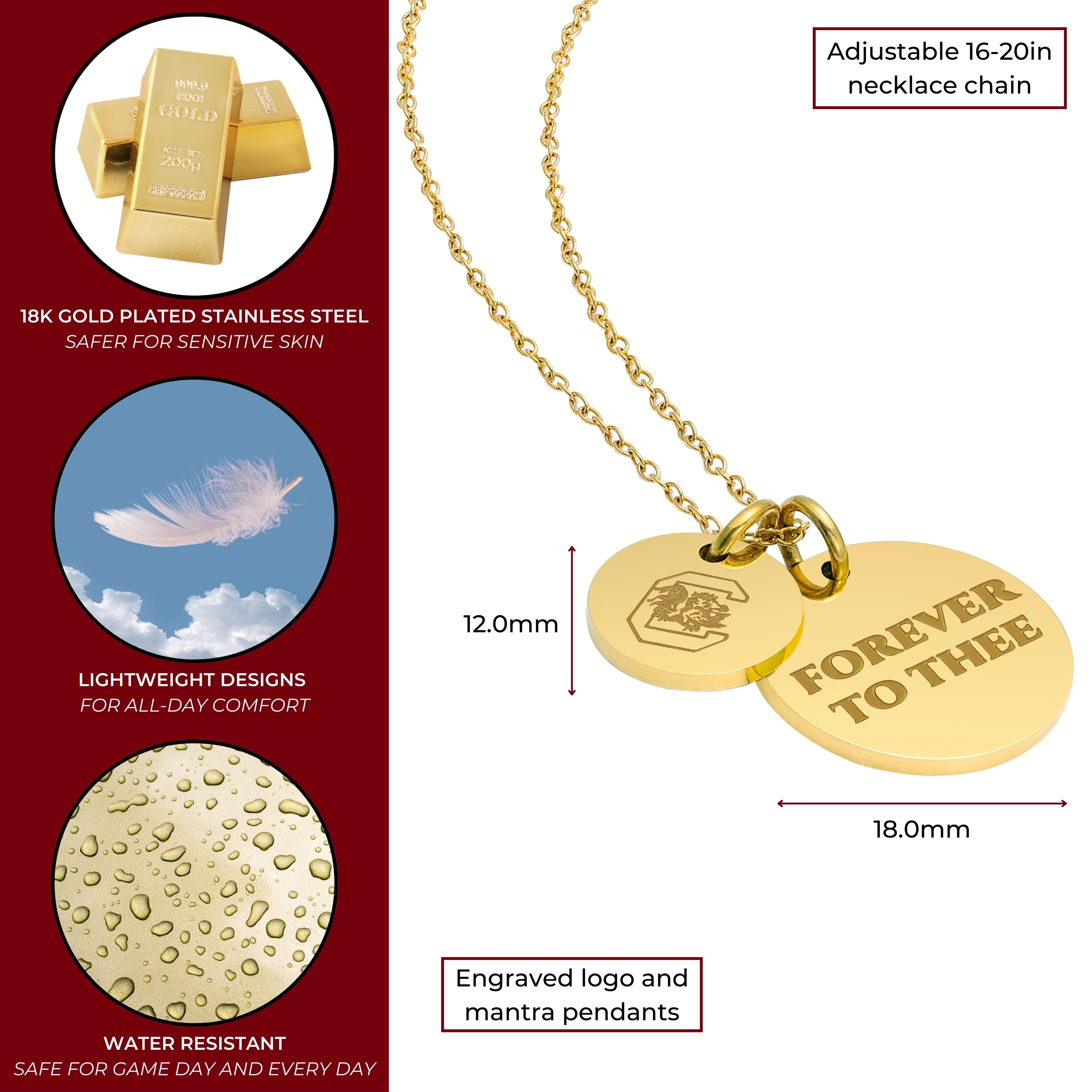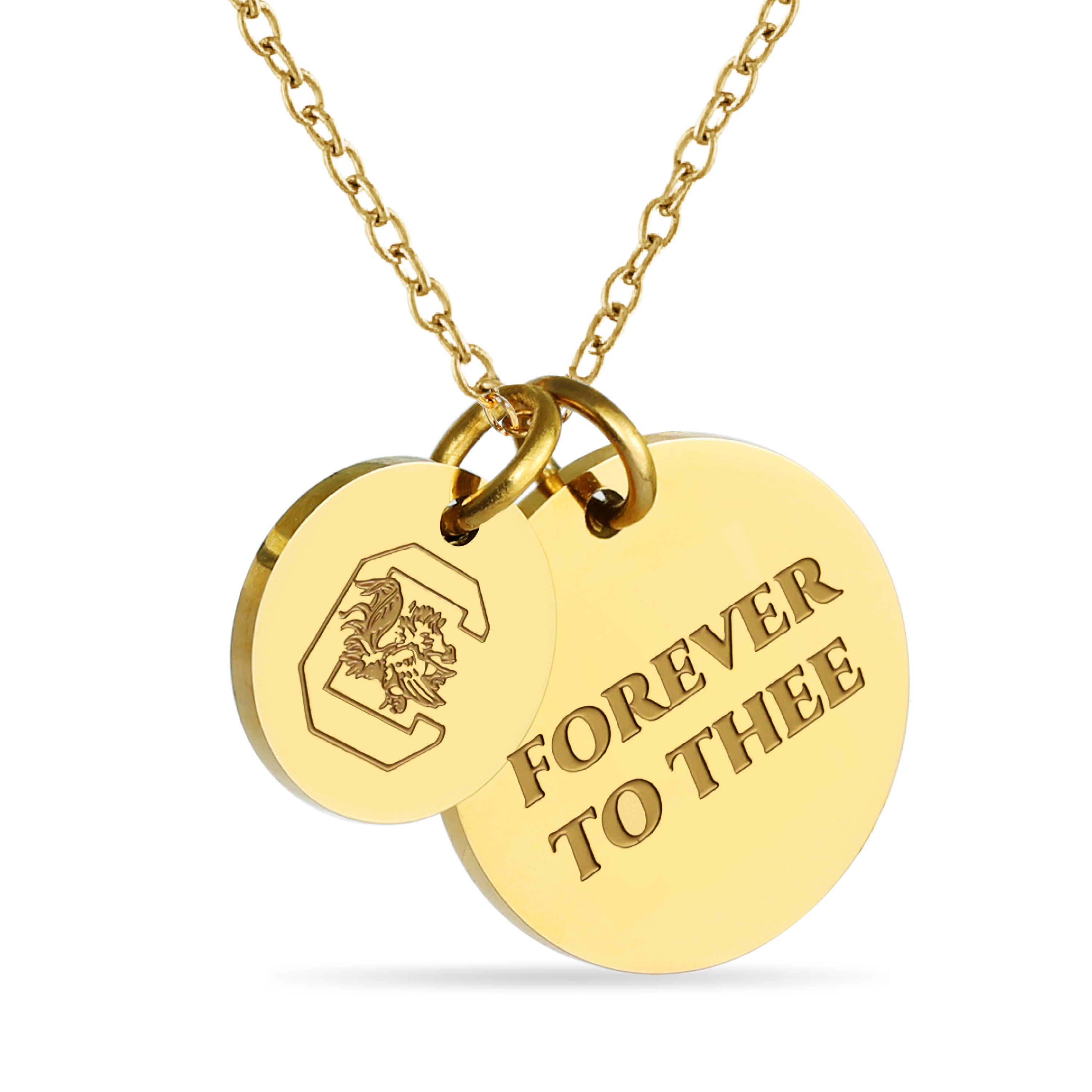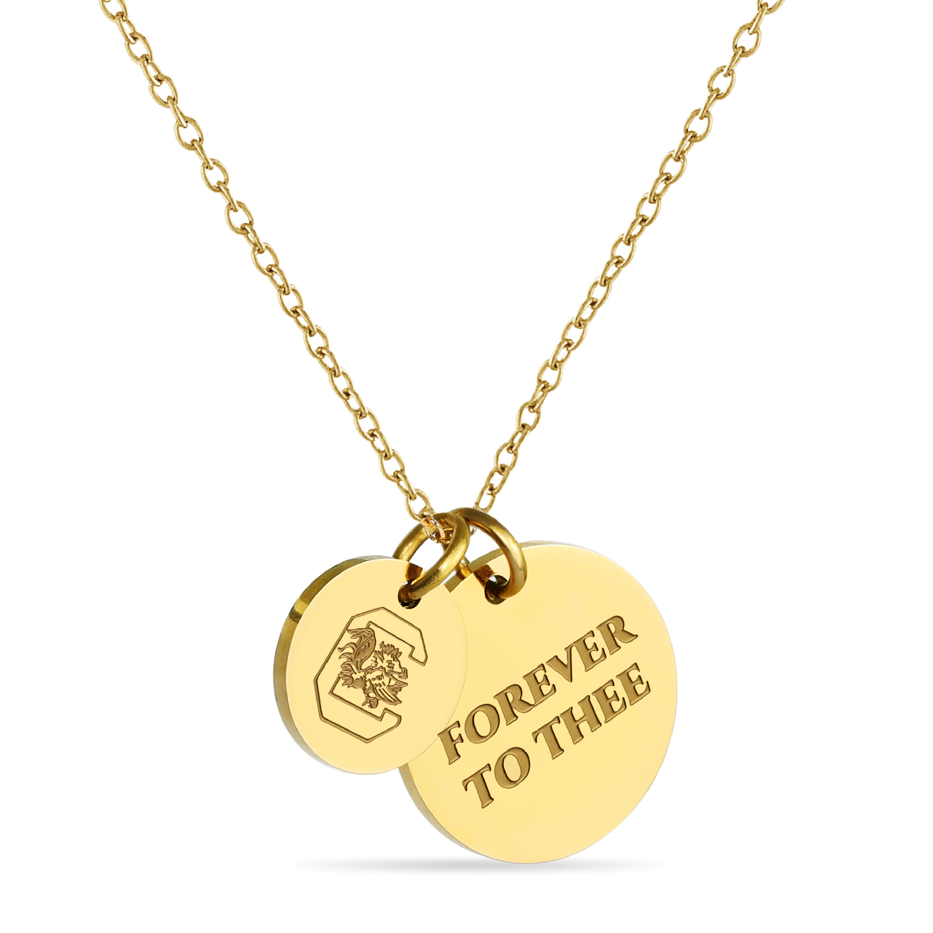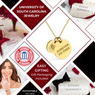Proudly showcase your University of South Carolina spirit with this officially licensed necklace, featuring two gold-plated pendants engraved with a bold emblem and the inspiring mantra, 'Forever to Thee.' Made from surgical-grade stainless steel and coated in 18K gold, this necklace combines durability with elegance. Its adjustable length (16-20 inches) makes it perfect for everyday wear or game day. Whether you're attending a sporting event or gifting it for a special occasion, this necklace is an ideal present for University of South Carolina fans, students, and alumni. It’s a thoughtful gift for birthdays, Mother’s Day, graduations, Christmas, or any celebration. Packaged beautifully, it arrives ready for gifting, ensuring it will impress any fan.
