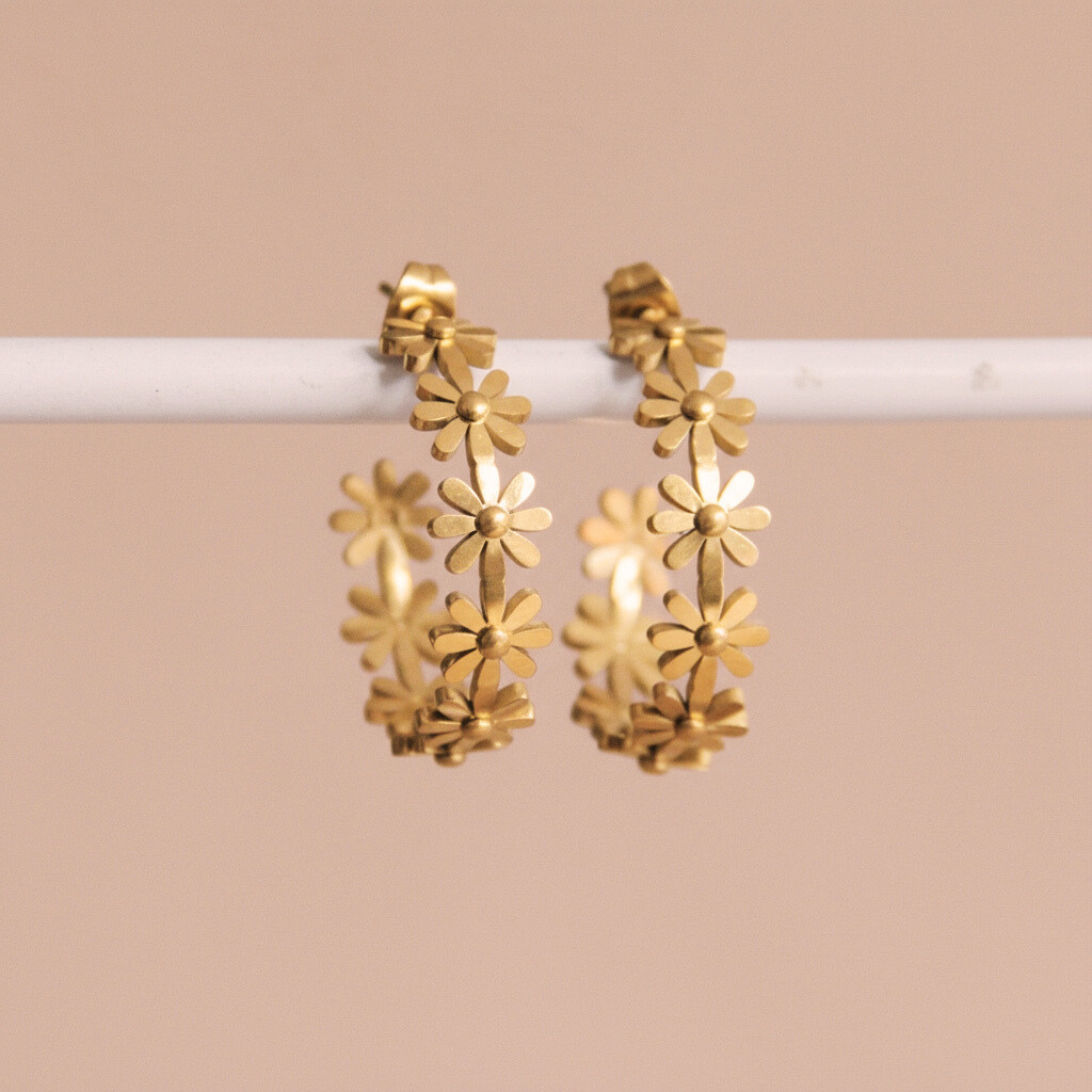 Tiny treasures that pack major style! These gold-plated stainless steel huggie hoops feature an elegant flower chain design that catches the light beautifully. At 1.18 inches, they're the perfect size for everyday wear or stacking with your favorite pieces. The durable gold plating maintains its brilliant shine, so you can rock these beauties again and again without worry. Simple, chic, and endlessly versatile.