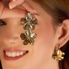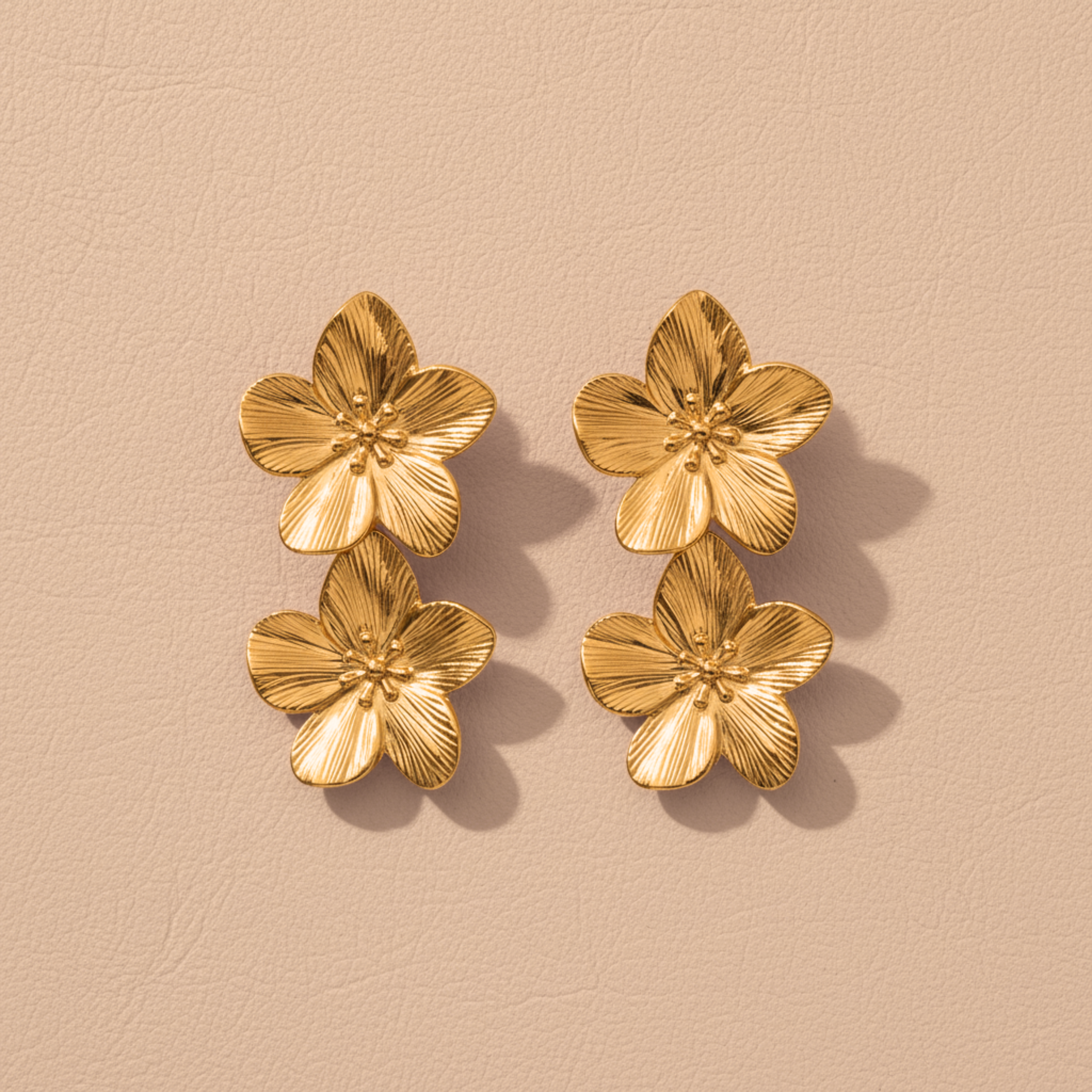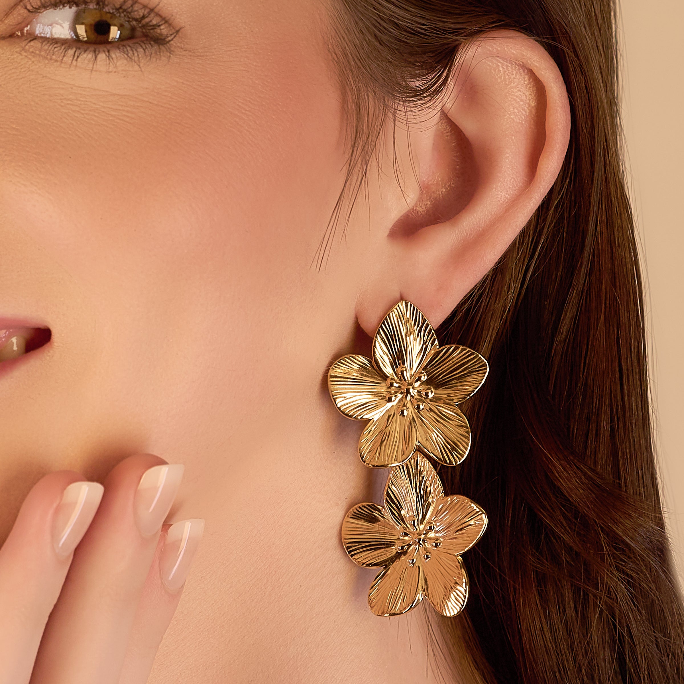 Turn heads with these audacious stacked flower dangles that refuse to blend in. Featuring two blooms layered for maximum drama, these oversized beauties are forged from 18k gold-plated stainless steel that keeps its radiant finish season after season. The playful design celebrates bold self-expression—ideal for anyone ready to let their jewelry do the talking. Light enough to wear all day, impactful enough to steal the spotlight.