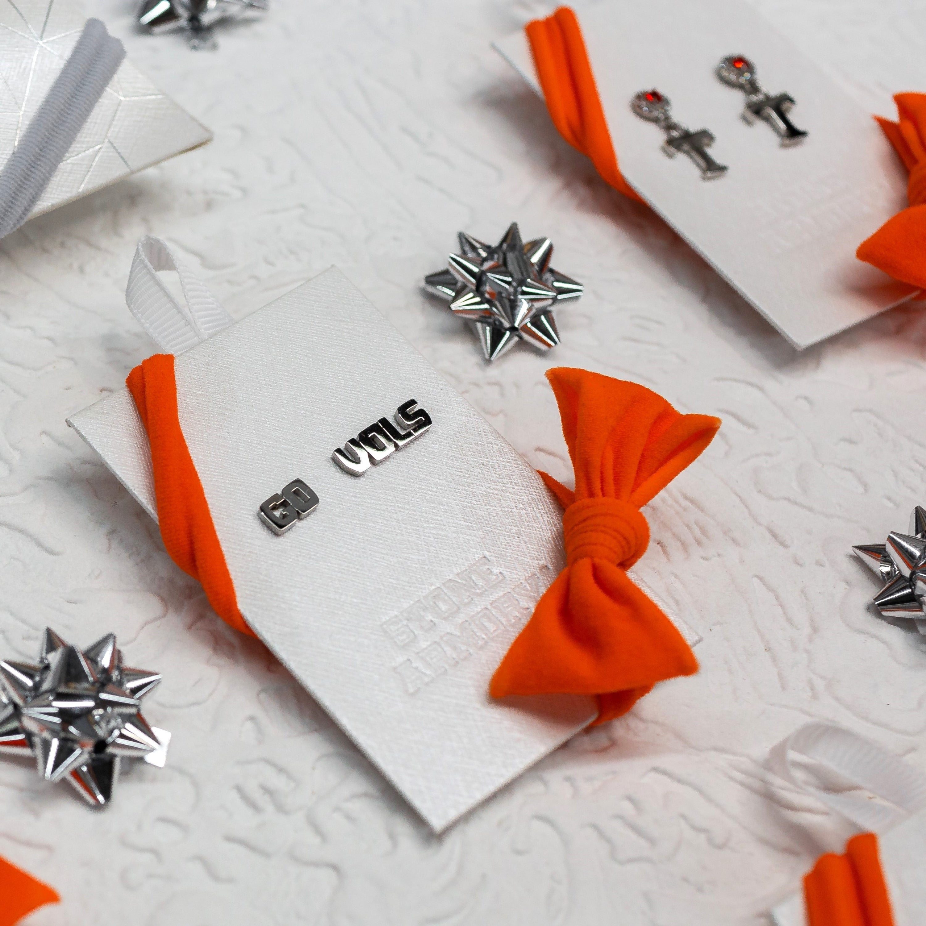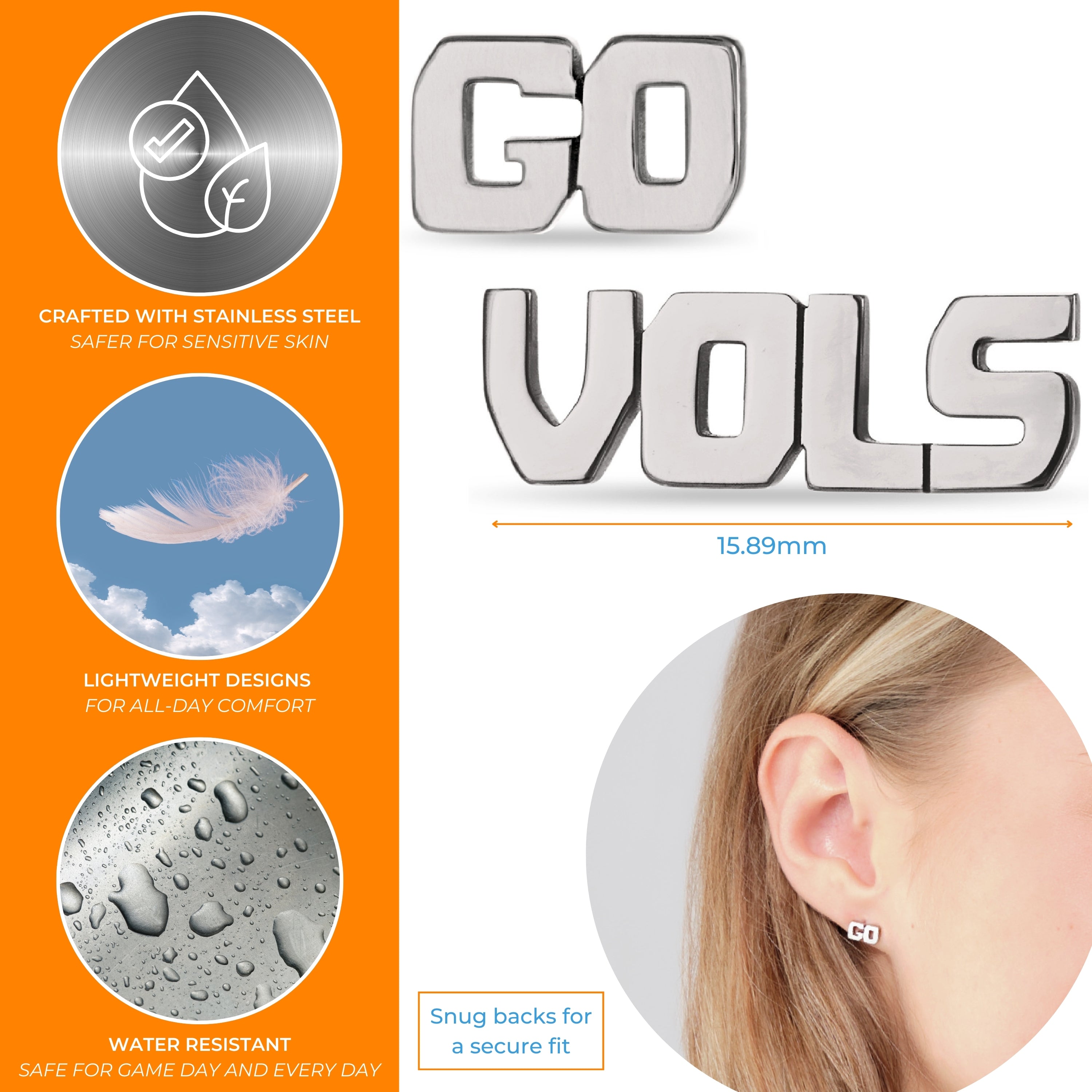 • Treasure Your Tennessee Vols Spirit - These Stone Armory University of Tennessee earrings are full of Volunteer pride! Featuring the cheer GO VOLS in stainless steel, these classic Tennessee stud earrings are just as unique as you. Go Vols!