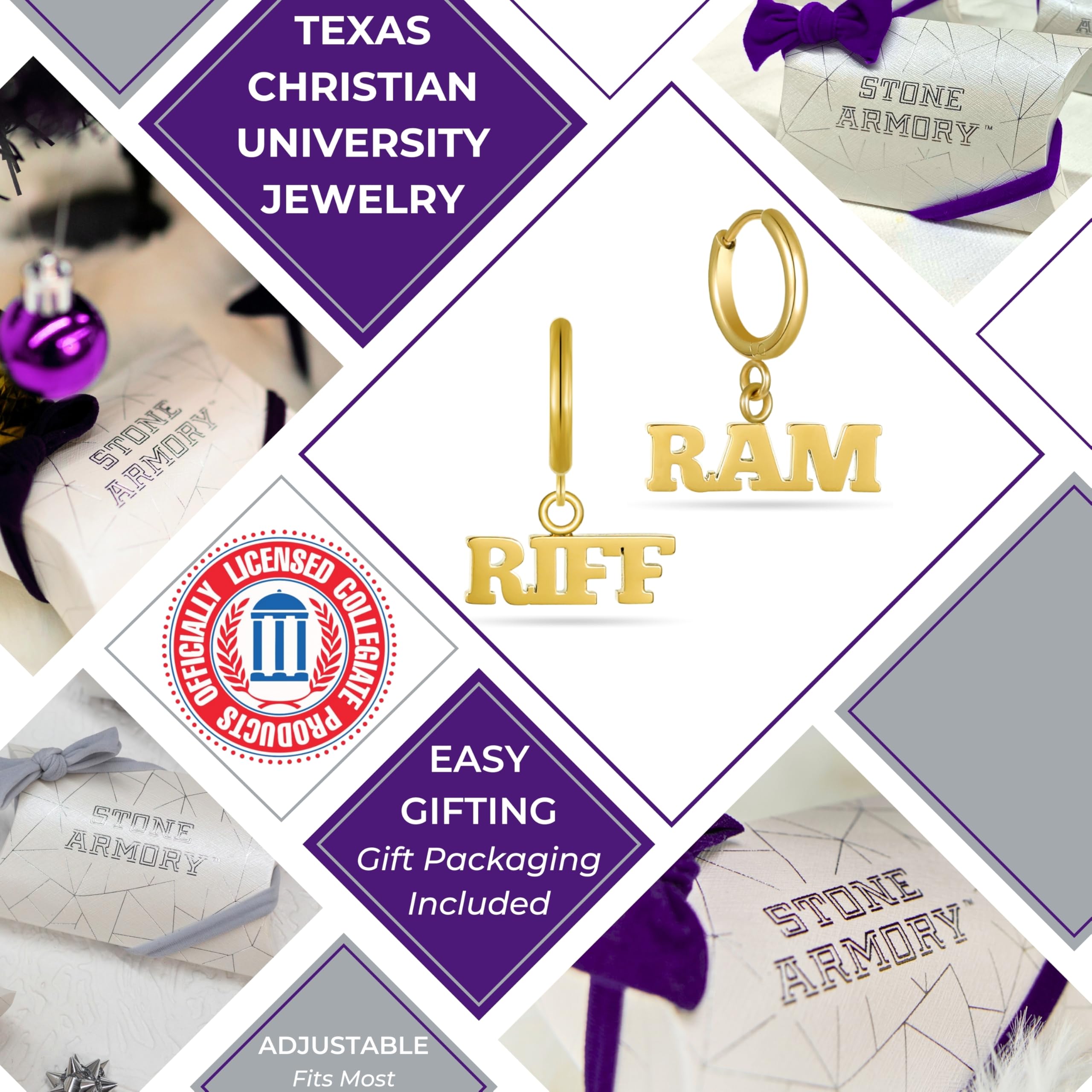 Stone Armory's TCU Riff Ram Huggie Hoop Earrings are Here Gear up for the game with these TCU Horned Frogs huggie hoop earrings, featuring a Riff Ram design. Perfect for tailgates or casual outings, these earrings let you proudly display your Texas Christian University spirit wherever you go. Crafted from stainless steel, these lightweight earrings are designed for sensitive ears, providing all-day comfort. They make an ideal gift for women, students, graduates, and TCU fans. Celebrate TCU graduation, birthdays, Mother's Day, the first day of school, or wear them to the first game and beyond. Add these versatile earrings to your TCU fan wear collection for everyday style. Thank you for supporting our small business with this officially licensed TCU jewelry.