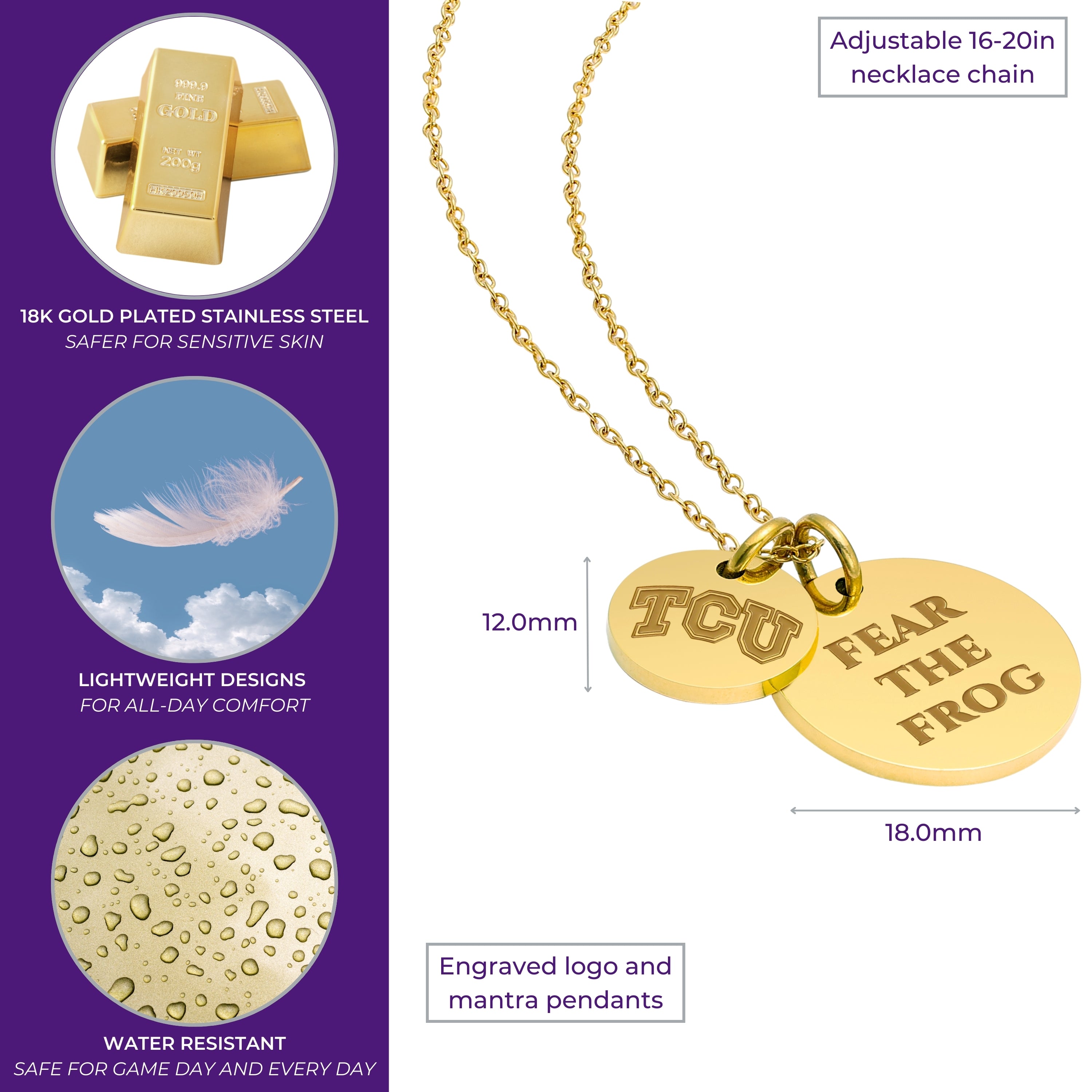 Proudly display your TCU Horned Frogs pride with this officially licensed TCU necklace, featuring two gold-plated pendants engraved with the iconic Block TCU and the inspiring mantra, 'Fear the Frog This pendant necklace, made from surgical-grade stainless steel and coated in 18K gold, offers both durability and elegance. Its adjustable length (16-20 inches) makes it perfect for everyday wear or TCU game day. Whether you're attending a game or gifting it for a special occasion, this necklace is ideal for TCU fans, students, and alumni. It makes a thoughtful present for birthdays, Mother’s Day, graduations, Christmas, any other celebration. Packaged simply yet beautifully, this necklace arrives ready for gifting, ensuring it will delight any TCU fan