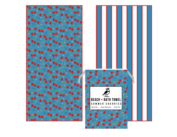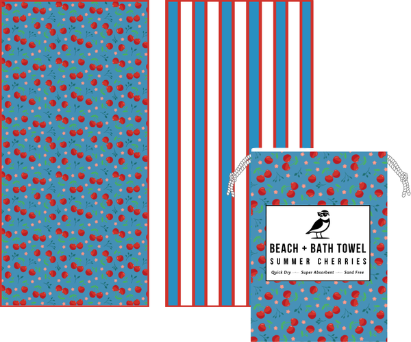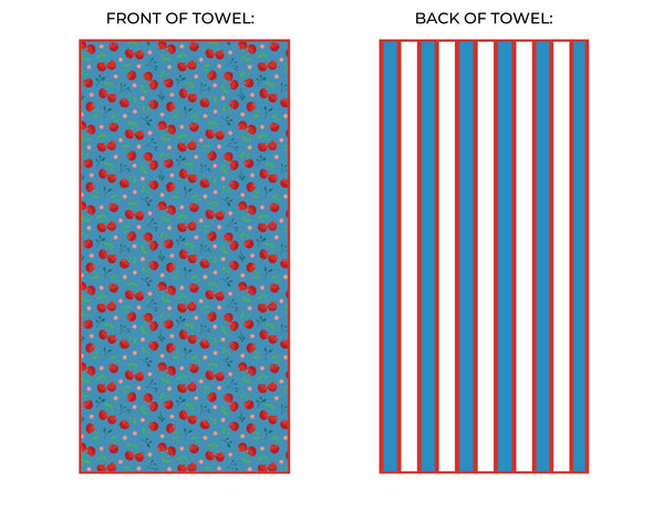 Lather in some rays and dry in a jiffy with the SunBounder Cherry Beach Towel in Blue. This summer essential is resistant to sand, compact for travel, and super soaking. And let's not forget the groovy cherry design, making your towel the life of the beach (or at least, your beach towel!). Sand-resistant and speedy drying to save on laundry time, extra-large at 6 feet long, and measuring 72 inches by 35 inches; perfect for both the seashore and your humble abode.